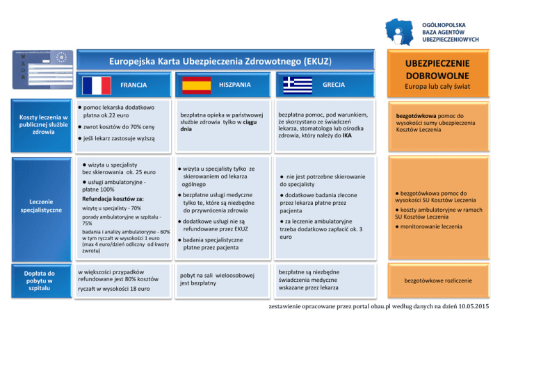 Europejska Karta Ubezpieczenia Zdrowotnego (EKUZ) Europejska Karta Ubezpieczenia Zdrowotnego FRANCJA HISZPANIA (EKUZ) UBEZPIECZENIE DOBROWOLNE Grecja GRECJA Europa lub cały świat bezpłatna pomoc, pod warunkiem, że skorzystano ze świadczeń lekarza, stomatologa lub ośrodka zdrowia, który należy do IKA bezgotówkowa pomoc do wysokości sumy ubezpieczenia Kosztów Leczenia ● pomoc lekarska dodatkowo Koszty leczenia w publicznej służbie zdrowia płatna ok.22 euro ● zwrot kosztów do 70% ceny ● jeśli lekarz zastosuje wyższą ● wizyta u specjalisty bez skierowania ok. 25 euro ● usługi ambulatoryjne płatne 100% Leczenie specjalistyczne Refundacja kosztów za: wizytę u specjalisty - 70% porady ambulatoryjne w szpitalu 75% badania i analizy ambulatoryjne - 60% w tym ryczałt w wysokości 1 euro (max 4 euro/dzień odliczny od kwoty zwrotu) Dopłata do pobytu w szpitalu bezpłatna opieka w państwowej służbie zdrowia tylko w ciągu dnia w większości przypadków refundowane jest 80% kosztów ryczałt w wysokości 18 euro ● wizyta u specjalisty tylko ze skierowaniem od lekarza ogólnego ● nie jest potrzebne skierowanie do specjalisty ● bezpłatne usługi medyczne tylko te, które są niezbędne do przywrócenia zdrowia ● dodatkowe badania zlecone przez lekarza płatne przez pacjenta ● dodatkowe usługi nie są refundowane przez EKUZ ● za leczenie ambulatoryjne trzeba dodatkowo zapłacić ok. 3 euro ● badania specjalistyczne płatne przez pacjenta pobyt na sali wieloosobowej jest bezpłatny bezpłatne są niezbędne świadczenia medyczne wskazane przez lekarza ● bezgotówkowa pomoc do wysokości SU Kosztów Leczenia ● koszty ambulatoryjne w ramach SU Kosztów Leczenia ● monitorowanie leczenia bezgotówkowe rozliczenie zestawienie opracowane przez portal obau.pl według danych na dzień 10.05.2015 Europejska Karta Ubezpieczenia Zdrowotnego (EKUZ) FRANCJA Koszty leczenia w prywatnej służbie zdrowia Odpłatność za recepty Koszty Transportu Sanitarnego Koszty Transportu chorego do kraju lub pobyt osoby wezwanej Formalności dotyczące korzystania NIE w zależności od leku zwrot od 15% do 100% na terenie Francji - zwrot kosztów do 65% ryczałt w wysokości 2 euro BRAK długotrwała procedura www.ekuz.nfz.gov.pl HISZPANIA GRECJA NIE NIE ● receptę refundowaną może wystawić tylko lekarz placówki państwowej recepta od państwowego lekarza zwrot do 60% UBEZPIECZENIE DOBROWOLNE Europa lub cały świat TAK koszty leków i środków opatrunkowych pokrywane są w ramach SU kosztów leczenia pozostałe leki płatność 100% ● za leki na receptę z kartą EKUZ zapłacimy do 25% ceny – dopłata zależy od rodzaju choroby transport zlecony przez lekarza na terenie Hiszpanii -bezpłatny transport zlecony przez lekarza na terenie Grecji -bezpłatny TAK BRAK BRAK TAK długotrwała procedura www.ekuz.nfz.gov.pl uproszczona procedura długotrwała procedura www.ekuz.nfz.gov.pl zestawienie opracowane przez portal obau.pl według danych na dzień 10.05.2015