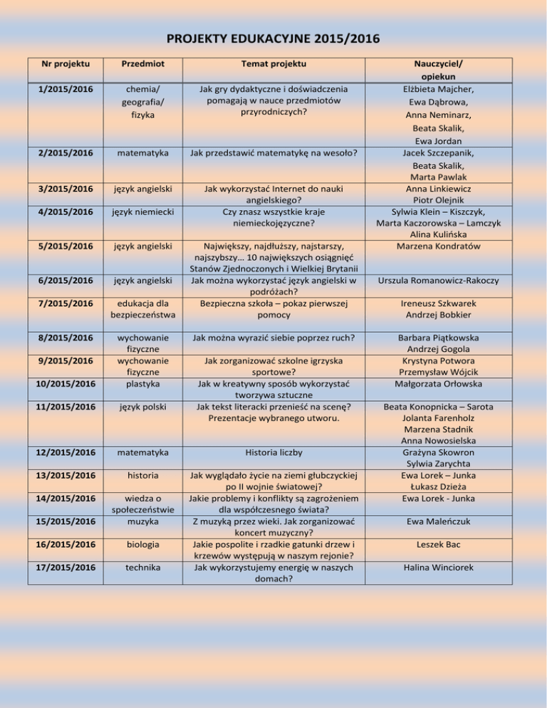 PROJEKTY EDUKACYJNE 2015/2016 Nr projektu Przedmiot Temat projektu 1/2015/2016 chemia/ geografia/ fizyka Jak gry dydaktyczne i doświadczenia pomagają w nauce przedmiotów przyrodniczych? 2/2015/2016 matematyka Jak przedstawić matematykę na wesoło? 3/2015/2016 język angielski 4/2015/2016 język niemiecki Jak wykorzystać Internet do nauki angielskiego? Czy znasz wszystkie kraje niemieckojęzyczne? 5/2015/2016 język angielski 6/2015/2016 język angielski 7/2015/2016 edukacja dla bezpieczeństwa 8/2015/2016 10/2015/2016 wychowanie fizyczne wychowanie fizyczne plastyka 11/2015/2016 język polski 12/2015/2016 matematyka Historia liczby 13/2015/2016 historia 14/2015/2016 15/2015/2016 wiedza o społeczeństwie muzyka 16/2015/2016 biologia 17/2015/2016 technika Jak wyglądało życie na ziemi głubczyckiej po II wojnie światowej? Jakie problemy i konflikty są zagrożeniem dla współczesnego świata? Z muzyką przez wieki. Jak zorganizować koncert muzyczny? Jakie pospolite i rzadkie gatunki drzew i krzewów występują w naszym rejonie? Jak wykorzystujemy energię w naszych domach? 9/2015/2016 Największy, najdłuższy, najstarszy, najszybszy… 10 największych osiągnięć Stanów Zjednoczonych i Wielkiej Brytanii Jak można wykorzystać język angielski w podróżach? Bezpieczna szkoła – pokaz pierwszej pomocy Jak można wyrazić siebie poprzez ruch? Jak zorganizować szkolne igrzyska sportowe? Jak w kreatywny sposób wykorzystać tworzywa sztuczne Jak tekst literacki przenieść na scenę? Prezentacje wybranego utworu. Nauczyciel/ opiekun Elżbieta Majcher, Ewa Dąbrowa, Anna Neminarz, Beata Skalik, Ewa Jordan Jacek Szczepanik, Beata Skalik, Marta Pawlak Anna Linkiewicz Piotr Olejnik Sylwia Klein – Kiszczyk, Marta Kaczorowska – Lamczyk Alina Kulińska Marzena Kondratów Urszula Romanowicz-Rakoczy Ireneusz Szkwarek Andrzej Bobkier Barbara Piątkowska Andrzej Gogola Krystyna Potwora Przemysław Wójcik Małgorzata Orłowska Beata Konopnicka – Sarota Jolanta Farenholz Marzena Stadnik Anna Nowosielska Grażyna Skowron Sylwia Zarychta Ewa Lorek – Junka Łukasz Dzieża Ewa Lorek - Junka Ewa Maleńczuk Leszek Bac Halina Winciorek