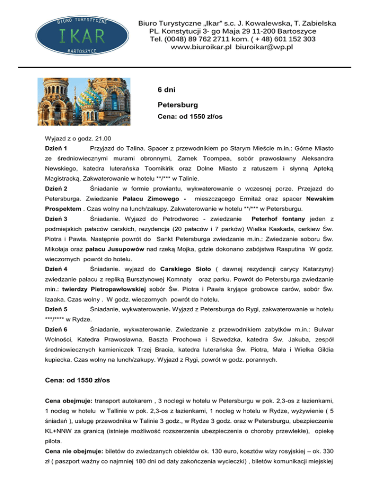 6 dni Petersburg Cena: od 1550 zł/os Wyjazd z o godz. 21.00 Dzień 1 Przyjazd do Talina. Spacer z przewodnikiem po Starym Mieście m.in.: Górne Miasto ze średniowiecznymi murami obronnymi, Zamek Toompea, sobór prawosławny Aleksandra Newskiego, katedra luterańska Toomikirik oraz Dolne Miasto z ratuszem i słynną Apteką Magistracką. Zakwaterowanie w hotelu **/*** w Talinie. Dzień 2 Śniadanie w formie prowiantu, wykwaterowanie o wczesnej porze. Przejazd do Petersburga. Zwiedzanie Pałacu Zimowego - mieszczącego Ermitaż oraz spacer Newskim Prospektem . Czas wolny na lunch/zakupy. Zakwaterowanie w hotelu **/*** w Petersburgu. Dzień 3 Śniadanie. Wyjazd do Petrodworec - zwiedzanie Peterhof fontany jeden z podmiejskich pałaców carskich, rezydencja (20 pałaców i 7 parków) Wielka Kaskada, cerkiew Św. Piotra i Pawła. Następnie powrót do Sankt Petersburga zwiedzanie m.in.: Zwiedzanie soboru Św. Mikołaja oraz pałacu Jusupowów nad rzeką Mojka, gdzie dokonano zabójstwa Rasputina W godz. wieczornych powrót do hotelu. Dzień 4 Śniadanie. wyjazd do Carskiego Sioło ( dawnej rezydencji carycy Katarzyny) zwiedzanie pałacu z repliką Bursztynowej Komnaty oraz parku. Powrót do Petersburga zwiedzanie min.: twierdzy Pietropawłowskiej sobór Św. Piotra i Pawła kryjące grobowce carów, sobór Św. Izaaka. Czas wolny . W godz. wieczornych powrót do hotelu. Dzień 5 Śniadanie, wykwaterowanie. Wyjazd z Petersburga do Rygi, zakwaterowanie w hotelu ***/**** w Rydze. Dzień 6 Śniadanie, wykwaterowanie. Zwiedzanie z przewodnikiem zabytków m.in.: Bulwar Wolności, Katedra Prawosławna, Baszta Prochowa i Szwedzka, katedra Św. Jakuba, zespół średniowiecznych kamieniczek Trzej Bracia, katedra luterańska Św. Piotra, Mała i Wielka Gildia kupiecka. Czas wolny na lunch/zakupy. Wyjazd z Rygi, powrót w godz. porannych. Cena: od 1550 zł/os Cena obejmuje: transport autokarem , 3 noclegi w hotelu w Petersburgu w pok. 2,3-os z łazienkami, 1 nocleg w hotelu w Tallinie w pok. 2,3-os z łazienkami, 1 nocleg w hotelu w Rydze, wyżywienie ( 5 śniadań ), usługę przewodnika w Talinie 3 godz., w Rydze 3 godz. oraz w Petersburgu, ubezpieczenie KL+NNW za granicą (istnieje możliwość rozszerzenia ubezpieczenia o choroby przewlekłe), opiekę pilota. Cena nie obejmuje: biletów do zwiedzanych obiektów ok. 130 euro, kosztów wizy rosyjskiej – ok. 330 zł ( paszport ważny co najmniej 180 dni od daty zakończenia wycieczki) , biletów komunikacji miejskiej