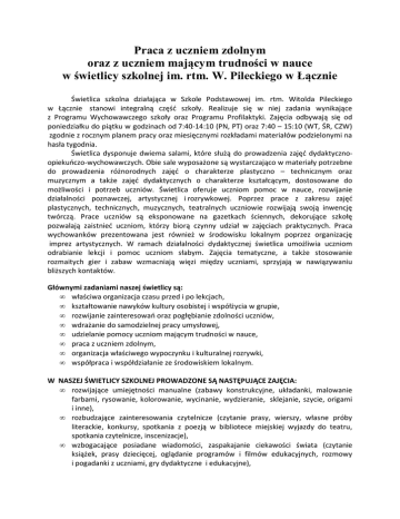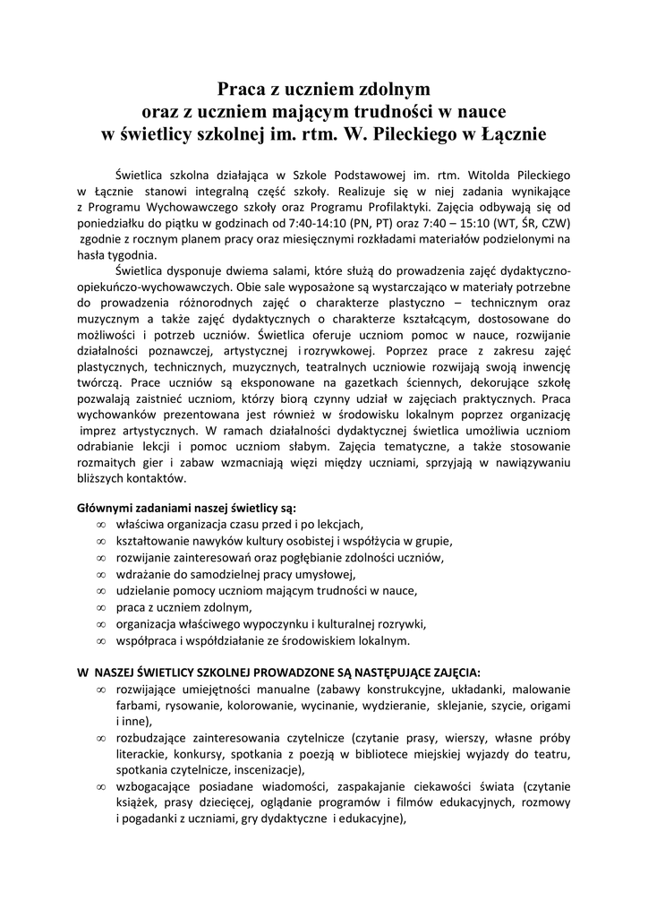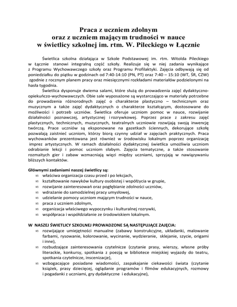 Praca z uczniem zdolnym oraz z uczniem mającym trudności w nauce w świetlicy szkolnej im. rtm. W. Pileckiego w Łącznie Świetlica szkolna działająca w Szkole Podstawowej im. rtm. Witolda Pileckiego w Łącznie stanowi integralną część szkoły. Realizuje się w niej zadania wynikające z Programu Wychowawczego szkoły oraz Programu Profilaktyki. Zajęcia odbywają się od poniedziałku do piątku w godzinach od 7:40-14:10 (PN, PT) oraz 7:40 – 15:10 (WT, ŚR, CZW) zgodnie z rocznym planem pracy oraz miesięcznymi rozkładami materiałów podzielonymi na hasła tygodnia. Świetlica dysponuje dwiema salami, które służą do prowadzenia zajęć dydaktycznoopiekuńczo-wychowawczych. Obie sale wyposażone są wystarczająco w materiały potrzebne do prowadzenia różnorodnych zajęć o charakterze plastyczno – technicznym oraz muzycznym a także zajęć dydaktycznych o charakterze kształcącym, dostosowane do możliwości i potrzeb uczniów. Świetlica oferuje uczniom pomoc w nauce, rozwijanie działalności poznawczej, artystycznej i rozrywkowej. Poprzez prace z zakresu zajęć plastycznych, technicznych, muzycznych, teatralnych uczniowie rozwijają swoją inwencję twórczą. Prace uczniów są eksponowane na gazetkach ściennych, dekorujące szkołę pozwalają zaistnieć uczniom, którzy biorą czynny udział w zajęciach praktycznych. Praca wychowanków prezentowana jest również w środowisku lokalnym poprzez organizację imprez artystycznych. W ramach działalności dydaktycznej świetlica umożliwia uczniom odrabianie lekcji i pomoc uczniom słabym. Zajęcia tematyczne, a także stosowanie rozmaitych gier i zabaw wzmacniają więzi między uczniami, sprzyjają w nawiązywaniu bliższych kontaktów. Głównymi zadaniami naszej świetlicy są: • właściwa organizacja czasu przed i po lekcjach, • kształtowanie nawyków kultury osobistej i współżycia w grupie, • rozwijanie zainteresowań oraz pogłębianie zdolności uczniów, • wdrażanie do samodzielnej pracy umysłowej, • udzielanie pomocy uczniom mającym trudności w nauce, • praca z uczniem zdolnym, • organizacja właściwego wypoczynku i kulturalnej rozrywki, • współpraca i współdziałanie ze środowiskiem lokalnym. W NASZEJ ŚWIETLICY SZKOLNEJ PROWADZONE SĄ NASTĘPUJĄCE ZAJĘCIA: • rozwijające umiejętności manualne (zabawy konstrukcyjne, układanki, malowanie farbami, rysowanie, kolorowanie, wycinanie, wydzieranie, sklejanie, szycie, origami i inne), • rozbudzające zainteresowania czytelnicze (czytanie prasy, wierszy, własne próby literackie, konkursy, spotkania z poezją w bibliotece miejskiej wyjazdy do teatru, spotkania czytelnicze, inscenizacje), • wzbogacające posiadane wiadomości, zaspakajanie ciekawości świata (czytanie książek, prasy dziecięcej, oglądanie programów i filmów edukacyjnych, rozmowy i pogadanki z uczniami, gry dydaktyczne i edukacyjne), • kształtujące umiejętności: wypowiadania się na zadany i dowolny temat (rozmowy z uczniami, pogadanki, zabawy typu – „dokończ zdanie”, „nazwa na daną literę” i inne), • kształtujące umiejętność wykorzystania zdobytej wiedzy (konkursy, quizy, rozwiązywanie i układanie krzyżówek, zagadek, gry dydaktyczne, układanki, zabawy tematyczne, redagowanie gazetki świetlicowej, odrabianie prac domowych), • ćwiczące umiejętności zapamiętywania fragmentów tekstu wiersza, piosenki (programy artystyczne, inscenizacje, zajęcia muzyczne), • wzbogacające ekspresję twórczą (pisanie tekstów, prace plastyczne, zabawy konstrukcyjne, zabawy tematyczne, programy artystyczne, zajęcia muzyczne), • kształtujące ekspresję ruchową (zabawy taneczne, dyskoteki), • zwiększające sprawność fizyczną (gry i zabawy zręcznościowe), • relaksujące (relaks przy muzyce, zabawy wyciszające, oglądanie filmów, wycieczki). Szczególną uwagę zwracamy na kształtowanie umiejętności współżycia i współdziałania w grupie rówieśniczej. Dbamy o wdrażanie uczniów do przestrzegania przyjętych zasad, regulaminu o wyrabianie umiejętności nawiązywania kontaktów z kolegami, rozmawiania, słuchania, wyrażania swoich potrzeb, przekonań i uczuć oraz dostrzegania ich u innych (kształtowanie postawy asertywnej), ćwiczenie umiejętności rozwiązywania sytuacji konfliktowych, panowania nad emocjami. Staramy się uczyć nasze dzieci oceniania siebie i postaw kolegów, zachowania się w sytuacjach trudnych (np. doznanie przykrości, przegrana), planowania pracy indywidualnej i grupowej, ponoszenia odpowiedzialności za wykonywanie zadań. Przyzwyczajamy do utrzymywania porządku i troski o wspólne mienie. Staramy się aby nasza świetlica była również miejscem do rozwijania talentów i zainteresowań dziecka. Specyfika pracy w świetlicy sprzyja jak już wspomniałam organizowaniu różnych zajęć (artystycznych, sportowych, czytelniczych), które umożliwiają dzieciom rozwój ich zainteresowań i zdolności. Prowadzimy różnorodne zajęcia takie jak: 1. Zajęcia dydaktyczno – wyrównawcze. Zajęcia mają na celu korygowanie i kompensowanie braków szkolnych i wychowawczych. Jest to forma zajęć, w których wychowankowie otrzymują pomoc w nauce oraz odrabianiu prac domowych jak również powtarzaniu, utrwalaniu nieopanowanych, trudniejszych treści programowych. 2. Zajęcia plastyczne. Podczas zajęć rozwijane są zdolności plastyczne dzieci oraz możliwość wyrażania siebie za pomocą technik plastycznych. Prowadzone są w formie indywidualnej jak i grupowej (np. tworzenie wspólnej pracy). Cele zajęć: • rozwijanie zmysłu estetyki i potrzeby tworzenia; • rozwijanie kreatywności, zdolności wyobrażania i produkowania czegoś nowego, oryginalnego; • rozwijanie możliwości innowacyjnych poprzez wyszukiwanie różnych rozwiązań dotyczących tego samego tematu; • zapoznanie z różnymi technikami plastycznymi i obserwowanie uzyskanych efektów; • posługiwa