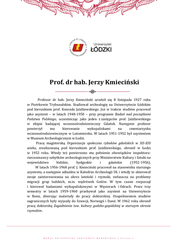 Prof. dr hab. Jerzy Kmieciński Profesor dr hab. Jerzy Kmieciński urodził się 8 listopada 1927 roku w Piotrkowie Trybunalskim. Studiował archeologię na Uniwersytecie Łódzkim pod kierunkiem prof. Konrada Jażdżewskiego. Już w trakcie studiów pracował jako asystent – w latach 1948-1950 – przy programie Badań nad początkami Państwa Polskiego, uczestnicząc jako jeden z zastępców prof. Jażdżewskiego w ekipie badającej wczesnośredniowieczny Gdańsk. Następnie profesor powierzył mu kierowanie wykopaliskami na cmentarzysku wczesnośredniowiecznym w Lutomiersku. W latach 1951-1952 był asystentem w Muzeum Archeologicznym w Łodzi. Pracę magisterską Organizacja społeczna rybaków gdańskich w XII-XIII wieku, zrealizowaną pod kierunkiem prof. Jażdżewskiego, obronił w Łodzi w 1952 roku. Wtedy też powierzono mu pełnienie obowiązków inspektorarzeczoznawcy zabytków archeologicznych przy Ministerstwie Kultury i Sztuki na województwo łódzkie, bydgoskie i gdańskie (1952-1956). W latach 1956-1968 prof. J. Kmieciński pracował na stanowisku starszego asystenta, a następnie adiunkta w Katedrze Archeologii UŁ i wtedy to skierował swoje zainteresowania na okres lateński i rzymski, zwłaszcza na problemy migracji grup ludzkich, m.in. wędrówek Gotów. W tym czasie rozpoczął i kierował badaniami wykopaliskowymi w Węsiorach i Odrach. Przez trzy semestry w latach 1959-1960 przebywał jako asystent na Uniwersytecie w Bonn, zbierając materiały do pracy doktorskiej. Uzupełnieniem studiów zagranicznych były wyjazdy do Szwecji, Norwegii i Danii. W 1962 roku obronił pracę doktorską Zagadnienie tzw. kultury godzko-gepidzkiej w starszym okresie rzymskim. M E D A L U N I V E R S I T A S L O D Z I E N S I S M E R E N T I B U S / S t r o n a 1 M E D A L U N I V E R S I T A S L O D Z I E N S I S M E R E N T I B U S W 1969 (-1992) roku został powołany na stanowisko docenta w Katedrze Archeologii UŁ. Wówczas rozpoczął realizacje projektu badawczego Dynamika zmian środowiska kulturowego i naturalnego na Pomorzu Wschodnim w pradziejach i we wczesnym średniowieczu. W ramach tego programu kierował badaniami zarówno cmentarzyska w Odrach, jak i grodziska w Raciążu i jego okolicy. W 1972 roku powołany został na kierownika Katedry Archeologii UŁ, którym był do 1992 r., poświęcając całe lata działalności organizacyjnej, owocującej znacznym wzrostem liczby personelu placówki, co umożliwiło potem powstanie Instytutu. Zorganizował działające do dzisiaj dwie stacje archeologiczne w Białych Błotach i Klonowicach na Pomorzu. Zainicjował projekt badawczy Peregrinatio Gothica, którego wyniki były przestawiane na konferencjach w ramach UNESCO w Sztokholmie, Białych Błotach, Santiago de Compostela, Bonn i Brnie. W latach siedemdziesiątych realizował nowatorski projekt Mechanizacja archeologicznych prac polowych i uczestniczył w programach badawczych: Bilans wodny wybranych regionów nadbałtyckich w przeciągu ostatnich 15 000 lat, koordynowanym przez Uniwersytet w Lund oraz Krajobrazotwórcza rola człowieka w pradziejach, realizowanym wraz a antropologami i paleobotanikami. W 1986 roku Profesor Kmieciński zainicjował, wraz z profesorem Gerardem Pereirą z Uniwersytetu Santiago de Compostela, projekt badawczy Procesy celtyzacji i romanizacji na zachodnich i północnych peryferiach cywilizacji śródziemnomorskiej. W ramach tego programu, wraz z zespołem Katedry Archeologii, prowadził badania na terenie hiszpańskiej Galicji oraz na Pomorzu Wschodnim. W latach 1984-1987 pełnił funkcję prodziekana Wydziału FilozoficznoHistorycznego UŁ. Wielotorowa i wieloaspektowa działalność naukowa J. Kmiecińskiego doprowadziła go do refleksji z dziedziny historii myśli społecznej – oddziaływanie archeologii i nauk pokrewnych na kształtowanie sie nacjonalizmu i poczucia narodowego, w wyniku czego powstała książka Nacjonalizm w germanoznawstwie niemieckim w XIX i początkach XX wieku. Stała się ona podstawą do nadania mu stopnia doktora habilitowanego w 1990 roku. W 1992 roku został nominowany na profesora nadzwyczajnego, a w roku 1997 otrzymał tytuł naukowy profesora tytularnego. M E D A L U N I V E R S I T A S L O D Z I E N S I S M E R E N T I B U S / S t r o n a 2 M E D A L U N I V E R S I T A S L O D Z I E N S I S M E R E N T I B U S W latach 1993 - 1997 sprawował funkcję kierownika Katedry Archeologii Uniwersytetu Marii Curie-Skłodowskiej w Lublinie, gdzie już wcześniej prowadził wykłady. W 1994 roku stworzył na Uniwersytecie Łódzkim Ośrodek Badań i Studiów Wschodu. Ośrodek przekształcił się wkrótce w Katedrę, a następnie, dzięki inicjatywie profesorów Kmiecińskiego i Waldemara Michowicza, połączył się z innymi – podobnie zorganizowanymi – Katedrami i Zakładami, np. Badań Brytyjskich, Amerykańskich, Niemcoznawczych, żeby razem utworzyć Instytut Studiów Międzynarodowych. Profesor Kmieciński zostaje jego wicedyrektorem, pełniąc tą funkcję do 1998 roku. Instytut w 2000 roku przekształcił się w Wydział Studiów Międzynarodowych i Politologicznych, a Profesor przeszedł do Katedry Systemów Politycznych Instytutu Studiów Politycznych, gdzie razem z profesor Alicją Stępień-Kuczyńską prowadził seminarium doktoranckie Państwa i narody w procesie transformacji. Nie przerywając działalności w ISP, nawiązał współpracę z Instytutem Antropologii i Archeologii Akademii Humanistycznej im. Aleksandra Gieysztora w Pułtusku. Od 1995 uczestniczy też w międzynarodowym programie badawczym Przemiany ekologiczne a biokulturowa adaptacja człowieka. Od 1997 roku profesor Kmieciński kieruje międzynarodowym programem swojego autorstwa Drogi handlowe i szlaki pielgrzymie jako czynnik integracji europejskiej, realizowanym w ramach współpracy z Compostela Group of Universities, a którego podsumowaniem była książka, pod jego redakcją, Trade routes and pilgrimage trails as a factor o
