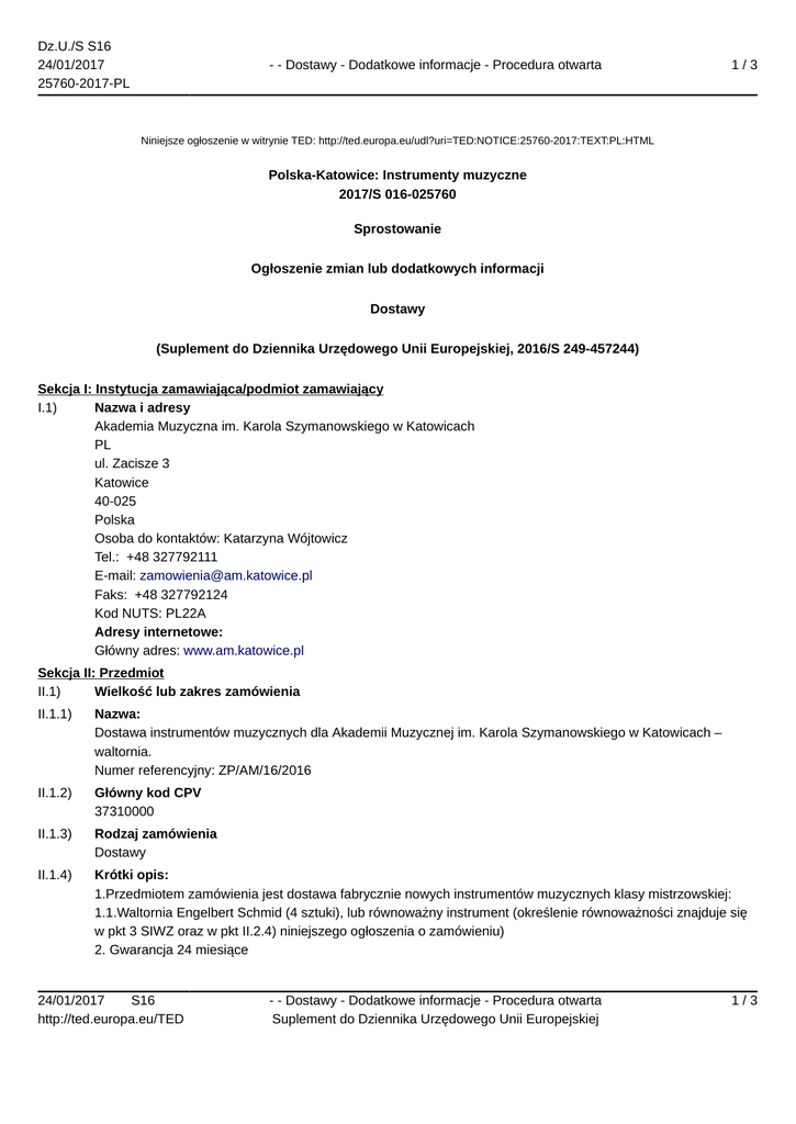 Dz.U./S S16 24/01/2017 25760-2017-PL - - Dostawy - Dodatkowe informacje - Procedura otwarta 1/3 Niniejsze ogłoszenie w witrynie TED: http://ted.europa.eu/udl?uri=TED:NOTICE:25760-2017:TEXT:PL:HTML Polska-Katowice: Instrumenty muzyczne 2017/S 016-025760 Sprostowanie Ogłoszenie zmian lub dodatkowych informacji Dostawy (Suplement do Dziennika Urzędowego Unii Europejskiej, 2016/S 249-457244) Sekcja I: Instytucja zamawiająca/podmiot zamawiający I.1) Nazwa i adresy Akademia Muzyczna im. Karola Szymanowskiego w Katowicach PL ul. Zacisze 3 Katowice 40-025 Polska Osoba do kontaktów: Katarzyna Wójtowicz Tel.: +48 327792111 E-mail: [email protected] Faks: +48 327792124 Kod NUTS: PL22A Adresy internetowe: Główny adres: www.am.katowice.pl Sekcja II: Przedmiot II.1) Wielkość lub zakres zamówienia II.1.1) Nazwa: Dostawa instrumentów muzycznych dla Akademii Muzycznej im. Karola Szymanowskiego w Katowicach – waltornia. Numer referencyjny: ZP/AM/16/2016 II.1.2) Główny kod CPV 37310000 II.1.3) Rodzaj zamówienia Dostawy II.1.4) Krótki opis: 1.Przedmiotem zamówienia jest dostawa fabrycznie nowych instrumentów muzycznych klasy mistrzowskiej: 1.1.Waltornia Engelbert Schmid (4 sztuki), lub równoważny instrument (określenie równoważności znajduje się w pkt 3 SIWZ oraz w pkt II.2.4) niniejszego ogłoszenia o zamówieniu) 2. Gwarancja 24 miesiące 24/01/2017 S16 http://ted.europa.eu/TED - - Dostawy - Dodatkowe informacje - Procedura otwarta Suplement do Dziennika Urzędowego Unii Europejskiej 1/3 Dz.U./S S16 24/01/2017 25760-2017-PL - - Dostawy - Dodatkowe informacje - Procedura otwarta 2/3 3. Dodatkowe wymagania Zamawiającego względem przedmiotu zamówienia (poza tymi wskazanymi w pkt 3 SIWZ) zostały określone we wzorze umowy, stanowiącym załącznik nr 3 do SIWZ. Sekcja VI: Informacje uzupełniające VI.5) Data wysłania niniejszego ogłoszenia: 20/01/2017 VI.6) Numer pierwotnego ogłoszenia Numer ogłoszenia w Dz.Urz. UE – OJ/S: 2016/S 249-457244 Sekcja VII: Zmiany VII.1) Informacje do zmiany lub dodania VII.1.2) Tekst, który należy poprawić w pierwotnym ogłoszeniu Numer sekcji: IV.2.2 Miejsce, w którym znajduje się tekst do modyfikacji: Termin składania ofert lub wniosków o dopuszczenie do udziału Zamiast: Data: 07/02/2017 Czas lokalny: 10:00 Powinno być: Data: 09/02/2017 Czas lokalny: 10:00 Numer sekcji: IV.2.6 Miejsce, w którym znajduje się tekst do modyfikacji: Minimalny okres, w którym oferent będzie związany ofertą Zamiast: Data: 07/04/2017 Powinno być: Data: 09/04/2017 Numer sekcji: IV.2.7 Miejsce, w którym znajduje się tekst do modyfikacji: Warunki otwarcia ofert Zamiast: Data: 07/02/2017 Czas lokalny: 12:00 Powinno być: Data: 09/02/2017 Czas lokalny: 12:00 VII.2) Inne dodatkowe informacje: W pkt. VI 3) ogłoszenia o zamówieniu „Informacje dodatkowe” dodaje się następujące zapisy: Jeżeli Wykonawca ma siedzibę lub miejsce zamieszkania poza terytorium Rzeczypospolitej Polskiej, zamiast dokumentów, o których mowa w pkt 6.3.1.1 SIWZ (Informacji z Krajowego Rejestru Karnego w zakresie określonym w art. 24 ust. 1 pkt 13), 14) i 21) Pzp, wystawionej nie wcześniej niż 6 miesięcy przed upływem terminu składania ofert), składa informację z odpowiedniego rejestru albo, w przypadku braku takiego rejestru, inny równoważny dokument wydany przez właściwy organ sądowy lub administracyjny kraju, w którym Wykonawca ma siedzibę lub miejsce zamieszkania lub miejsce zamieszkania ma osoba, której dotyczy informacja albo dokument, w zakresie określonym w art. 24 ust. 1 pkt 13, 14 i 21 Pzp lub oświadczenie, o którym mowa w pkt. 6.10.2, 6.10.3 SIWZ. 24/01/2017 S16 http://ted.europa.eu/TED - - Dostawy - Dodatkowe informacje - Procedura otwarta Suplement do Dziennika Urzędowego Unii Europejskiej 2/3 Dz.U./S S16 24/01/2017 25760-2017-PL - - Dostawy - Dodatkowe informacje - Procedura otwarta 3/3 Dalsze uregulowania w zakresie podmiotów zagranicznych oraz Wykonawców wspólnie ubiegających się o udzielnie zamówienia zawarto w treści SIWZ. 24/01/2017 S16 http://ted.europa.eu/TED - - Dostawy - Dodatkowe informacje - Procedura otwarta Suplement do Dziennika Urzędowego Unii Europejskiej 3/3