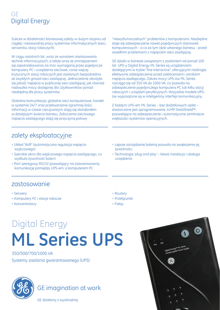 GE Digital Energy Sukces w działalności biznesowej zależy w dużym stopniu od ciągłej i niezawodnej pracy systemów informatycznych (sieci, serwerów, stacji roboczych). W ciągu ostatnich lat, wraz ze wzrostem zastosowania technik informacyjnych, a także wraz ze zmniejszeniem się zapotrzebowania na moc wymaganą przez pojedyncze komputery PC i urządzenia sieciowe, coraz więcej krytycznych stacji roboczych jest zasilanych bezpośrednio ze zwykłych gniazd sieci zasilającej. Jednocześnie obniżyła się jakość napięcia w publicznej sieci zasilającej, jak również nadwyżka mocy dostępnej dla Użytkowników ponad niezbędną dla pracy systemów. Globalna komunikacja, globalne sieci komputerowe, handel w systemie 24/7 oraz przetwarzanie ogromnej ilości informacji w czasie rzeczywistym stają się standardem w dzisiejszym świecie biznesu. Zaburzenia sieciowego napięcia zasilającego stają się przyczyną połowy “niewytłumaczalnych” problemów z komputerami. Niezbędne staje się zabezpieczanie nawet pojedynczych stanowisk komputerowych - a co za tym idzie własnego biznesu - przed wszelkimi problemami z napięciem sieci zasilającej. GE działa w biznesie związanym z zasilaniem od ponad 100 lat. UPS-y Digital Energy ML Series są urządzeniami działającymi w trybie “line interactive”, oferującymi niedrogie, efektywne zabezpieczenie przed zakłóceniami i zanikami napięcia zasilającego. Zakres mocy UPS-ów ML Series rozciąga się od 350 VA do 1000 VA, co pozwala na zabezpieczenie pojedynczego komputera PC lub kilku stacji roboczych i urządzeń peryferyjnych. Wszystkie modele UPSów wyposażone są w inteligentny interfejs komunikacyjny. Z każdym UPS-em ML Series – bez dodatkowych opłat – dostarczane jest oprogramowanie JUMP DataShield™, pozwalające na zabezpieczenie i automatyczne zamknięcie większości systemów operacyjnych. zalety eksploatacyjne • Układ “AVR” (automatyczna regulacja napięcia wyjściowego) • Szerokie okno dla wejściowego napięcia zasilającego, co wydłuża żywotność baterii • Port szeregowy RS232 pozwalający na zaawansowaną komunikację pomiędzy UPS-em, a komputerem PC • Lepsze zarządzanie baterią pozwala na zwiększenie jej żywotności • Technologia ‘plug and play’ – łatwa instalacja i obsługa urządzenia zastosowanie • Serwery • Komputery PC i stacje robocze • Koncentratory Digital Energy • Routery • Przełączniki • Faksy ML Series UPS 350/500/700/1000 VA Systemy zasilania gwarantowanego (UPS) GE imagination at work GE działamy z wyobraźnią parametry techniczne Model Moc znamionowa (VA / W) Baterie (V/Ah) ML 350 ML 500 ML 700 ML 1000 350/210 500/300 700/420 1000/600 12/5 24/7 Standardowy czas autonomii przy 75% obciążeniu (min.) 4 12/7 5 24/5 7 Typ obudowy A A B C 6.5 7.5 11 13 142-300 142-300 142-300 160-254 Waga netto z bateriami (kg) Zakres napięcia wejściowego (Vac) 50Hz +/- 10% Częstotliwość wejściowa (Hz) 230V (+5% / -10% przed niskim stanem baterii) Napięcie wyjściowe (Vac) 50Hz Częstotliwość wyjściowa (Hz) Ilość gniazd wyjściowych IEC 320 7 2 2 2 2 3 godziny (w przybliżeniu) Czas ponownego ładowania baterii do 80% ich pojemności RAL 9005 (czarny) Kolor porty komunikacyjne charakterystyka pracy Temperatura pracy : -10 do 40°C Wilgotność względna : 95% bez kondensacji Poziom hałasu RS 232 Plug and Play : mniejszy, niz 35 db(A) obudowy (wys. x szer. x głęb.): ogólne kryteria konstrukcyjne: Bezpieczeństwo : EN 50091-1-1; EN 60950; IEC 950 A: 150 x 110 x 300mm EMC : EN 50091-2 B: 150 x 110 x 420mm Stopień ochrony : IP20 C: 150 x 110 x 450mm Zawarte w karcie katalogowej opisy i parametry mogą zostać zmienione bez wcześniejszego zawiadomienia produkty dostępne u lokalnego przedstawiciela GE: GE Consumer & Industrial SA Via Cantonale 50 6595 Riazzino (Locarno) Switzerland T +41 (0) 91 850 51 51 F +41 (0) 91 850 52 52 E [email protected] imagination at work www.GEDigitalEnergy.com © General Electric Company, USA Wszelkie prawa zastrzeżone (03a/2010) Kopiowanie dokumentu wymaga pisemnej zgody GE Polska GEA-D 1015 PL CE