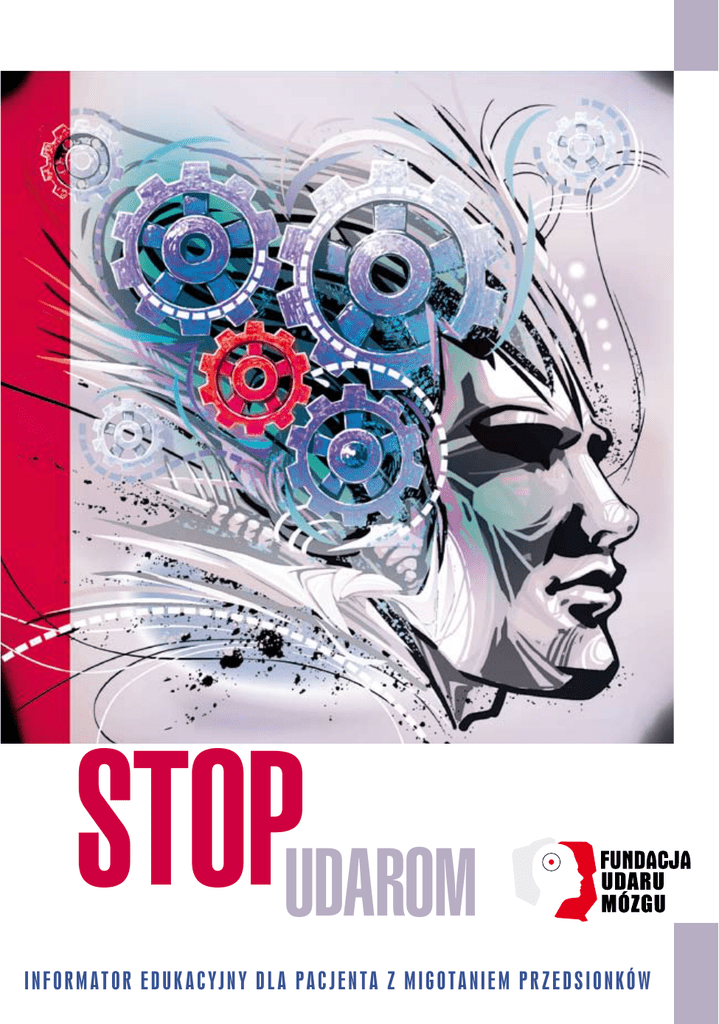 STOPUDAROM Informator eduk acyjn y dl a pac jenta z migotaniem pr zedsionków stopudarom WITAMY Prosimy o skorzystanie z informacji zawartych w tej broszurce, aby dowiedzieć się więcej na temat migotania przedsionków, tego, jak schorzenie to może zwiększyć ryzyko wystąpienia udaru, jak również poznać praktyczne kroki, jakie można podjąć w celu zredukowania tego ryzyka. Migotanie przedsionków może przebiegać z przyspieszonym, zbyt wolnym, a nawet prawidłowym rytmem serca. Migotanie przedsionków występuje u jednej na cztery osoby powyżej 40. roku życia, co powoduje, że jest to najczęściej występujące zaburzenie rytmu u dorosłych na całym świecie. Migotanie przedsionków zwiększa ryzyko udaru. Co roku aż trzy miliony osób doznaje udaru w wyniku migotania przedsionków. Największą szansę zmniejszenia ryzyka udaru stanowi prowadzenie leczenia według zaleceń lekarza, nawet przy braku odczuwalnych objawów. 1 stopudarom POWAŻNE SCHORZENIE, Z KTÓRYM ŻYJESZ NA CO DZIEŃ Osoby, u których rozpoznano migotanie przedsionków, zdają sobie sprawę z tego, że życie z tym schorzeniem bywa problematyczne i niepokojące. Łatwo stracić rachubę, ile razy człowiek budzi się w środku nocy z uczuciem kołatania serca lub jak często występują zawroty głowy czy duszność. Co ciekawe, osoby z migotaniem przedsionków często obawiają się, że odczuwane przez nich objawy wskazują na zbliżający się zawał serca. Biorąc pod uwagę odczuwane objawy, obawa o serce jest rzeczą naturalną. Prawdopodobieństwo, że migotanie przedsionków wywoła zawał serca, jest jednak bardzo znikome. Istnieje jednak inne zagrożenie, z którym żyje się na co dzień – mianowicie fakt, że w wyniku migotania przedsionków może dojść do udaru mózgu. Fakt ten może być zaskakujący. Można jednak poczynić pewne kroki, aby zmniejszyć to zagrożenie – np. zapoznać się z treścią tej broszurki i porozmawiać z lekarzem dla upewnienia się, że leczenie prowadzone jest prawidłowo. Prosimy zatem o uważne przeczytanie tej broszurki i schowanie jej w bezpiecznym miejscu. Zrozumienie, czym jest migotanie przedsionków, stanowi pierwszy krok do zmniejszenia ryzyka udaru 2 CO TO JEST MIGOTANIE PRZEDSIONKÓW? Migotanie przedsionków stanowi najczęściej występujący typ zaburzeń rytmu serca u dorosłych na całym świecie. Dotyka ono ponad dziewięciu milionów osób na terenie samej Europy i Stanów Zjednoczonych. W zasadzie migotanie przedsionków może przebiegać z przyspieszonym, zbyt wolnym, a nawet prawidłowym rytmem serca. Rytm serca jest kontrolowany za pomocą sygnałów elektrycznych przemieszczających się po sercu, sprawiających, że serce kurczy się i pompuje krew. W prawidłowym sercu górne jego jamy (przedsionki) kurczą się, pompując krew do dolnych jam serca (komór). Następnie komory kurczą się, pompując krew do płuc i do pozostałych obszarów organizmu. Do migotania przedsionków dochodzi w wyniku zaburzenia sygnałów elektrycznych w przedsionkach, co powoduje ich drżenie (określane terminem „migotanie”). Oznacza to, że krew nie jest pompowana z przedsionków do komór serca. Część krwi pozostaje w przedsionkach, gdzie gromadzi się poza głównym strumieniem przepływu. Migotanie przedsionków powoduje, że serce nie pracuje prawidłowo 3 stopudarom DLACZEGO DOCHODZI DO MIGOTANIA PRZEDSIONKÓW? Prawdopodobieństwo wystąpienia migotania przedsionków wzrasta wraz z wiekiem (ten typ zaburzenia rytmu występuje u mniej więcej jednej na cztery osoby powyżej 40. roku życia). Do migotania przedsionków dochodzi jednak częściej u osób z chorobą wieńcową lub chorobami serca takimi jak niewydolność serca. Migotanie przedsionków występuje niezwykle rzadko u dzieci. Szczerze mówiąc, niektóre przypadki migotania przedsionków występują bez przyczyny lub przyczyna jest nieznana. Wiadomo jednak, że pewne schorzenia i czynniki dotyczące stylu życia mogą wywoływać migotanie przedsionków. Są to m.in.: nadciśnienie tętnicze, cukrzyca, niewydolność serca, starszy wiek, nadczynność tarczycy, picie alkoholu w zbyt dużych ilościach lub tzw. „ciągi alkoholowe”. Warto rozpoznawać te przyczyny i podjąć starania, aby im przeciwdziałać – np. ograniczając spożycie alkoholu i kawy oraz kontrolując czynniki ryzyka sercowo-naczyniowego takie jak nadciśnienie czy cukrzyca. SPIS OBJAWÓW U wielu osób z migotaniem przedsionków nie występują objawy, szczególnie przy niezbyt szybkim rytmie serca, jednak do często występujących symptomów należą: kołatanie serca, zawroty głowy, ból w klatce piersiowej, duszność. Warto zwrócić uwagę na to, że objawy nie są identyczne u różnych osób. Mogą one występować prawie codziennie, ale mogą być odczuwalne tylko od czasu do czasu, a nawet wcale. W każdym razie ważne jest, aby stosować leczenie według wskazówek lekarza, nawet w przypadku braku odczuwalnych objawów. Jest to optymalne postępowanie zmniejszające ryzyko udaru. Warto umieć rozpoznawać objawy migotania przedsionków Warto zdawać sobie sprawę z czynników, jakie wywołują migotanie przedsionków 4 5 stopudarom DLACZEGO U OSÓB Z MIGOTANIEM PRZEDSIONKÓW WYSTĘPUJE WIĘKSZE RYZYKO UDARU? Migotanie przedsionków powoduje wzrost ryzyka udaru. Oto dlaczego: 1 Ze względu na nieprawidłowe kurczenie się przedsionków krew gromadzi się w przedsionkach poza głównym strumieniem przepływu. 2 Elementy tej niepłynącej krwi zlepiają się w przedsionkach serca i tworzą zakrzepy. 3 Czasem zakrzepy te odrywają się, są niesione z prądem krwi i zaczopowują się w jakimś naczyniu krwionośnym zamykając przepływ krwi. 4 Jeśli dojdzie do zamknięcia napływu krwi do mózgu, neurony zostają pozbawione niezbędnego im do życia tlenu. 5 Niedotlenienie mózgu prowadzi do udaru. Każdego roku aż trzy miliony osób zapada na udar w wyniku migotania przedsionków. Z tego wzglę