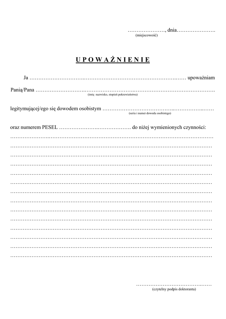 …………………, dnia…………………. (miejscowość) UPOWAśNIENIE Ja ………………………….…………………………………………….…… upowaŜniam Panią/Pana ……………………….……………………….………………………………………. (imię nazwisko, stopień pokrewieństwa) legitymującej/ego się dowodem osobistym …………………………………..……………..…… (seria i numer dowodu osobistego) oraz numerem PESEL ………………….………………. do niŜej wymienionych czynności: ………………….………………………………………………………………………………… …………………………………………………………………………………………………… …………………………………………………………………………………………………… …………………………………………………………………………………………………… …………………………………………………………………………………………………… …………………………………………………………………………………………………… …………………………………………………………………………………………………… …………………………………………………………………………………………………… …………………………………………………………………………………………………… …………………………………………………………………………………………………… …………………………………………………………………………………………………… …………………………………………………………………………………………………… …………………………………………………………………………………………………… …………………………………………………………………………………………………… ……………………………….…… (czytelny podpis doktoranta)