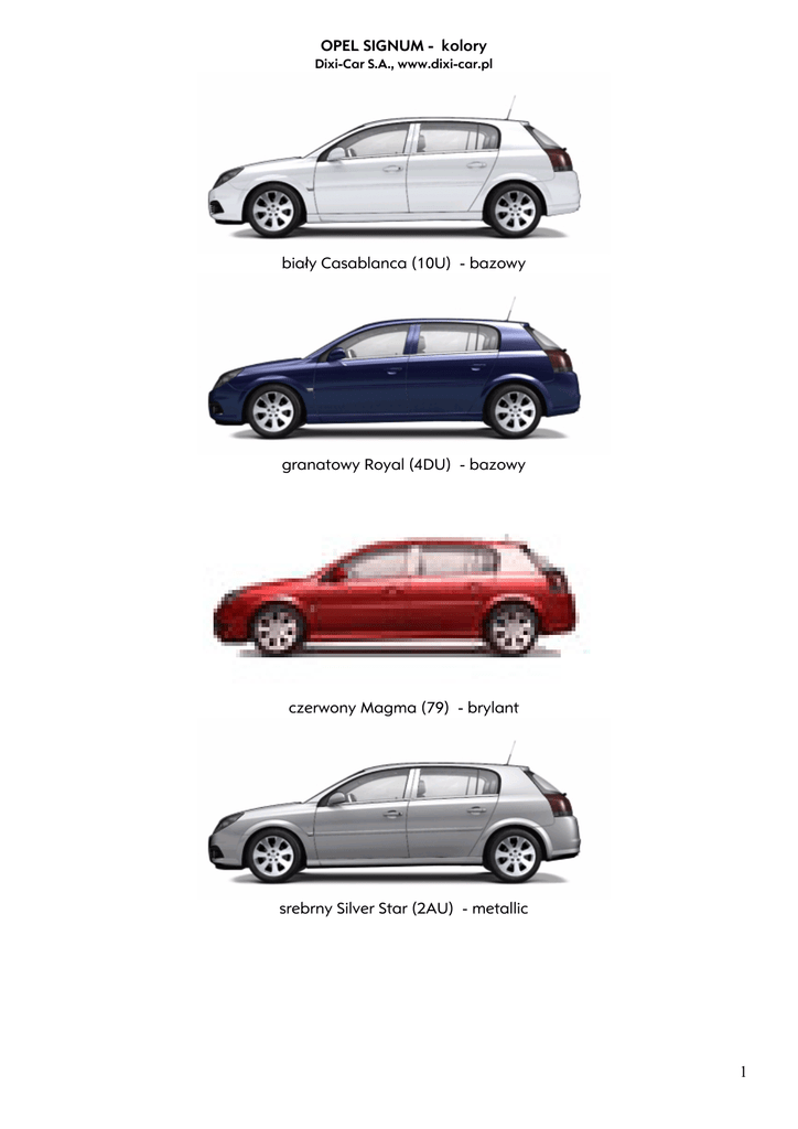 OPEL SIGNUM - kolory Dixi-Car S.A., www.dixi-car.pl biały Casablanca (10U) - bazowy granatowy Royal (4DU) - bazowy czerwony Magma (79) - brylant srebrny Silver Star (2AU) - metallic 1 srebrny Silver Ligthning (4AU) - metallic szary Metro (4XU) - metallic czarny Sapphire (2HU) - metallic jasnozielony Misty Morning (3NU) - metallic niebieski Ultra Blue (4CU) - mica 2 jasnobeżowy Panacotta (1RU) - mica ciemnozielony Digital (4QU) - mica czerwony Granatapple (2GU) – mica zielononiebieski (ACU) 3 OPEL SIGNUM - tapicerki Tapicerka materiałowo-skórzana, czarna (XXPC) Tapicerka materiałowo-skórzana, czarna (XXZK) Tapicerka materiałowo-skórzana, brązowy satynowy (XXZN) Tapicerka skórzana, antracytowa (XXNN) 4 Tapicerka skórzana, beżowa (XXLB) 5