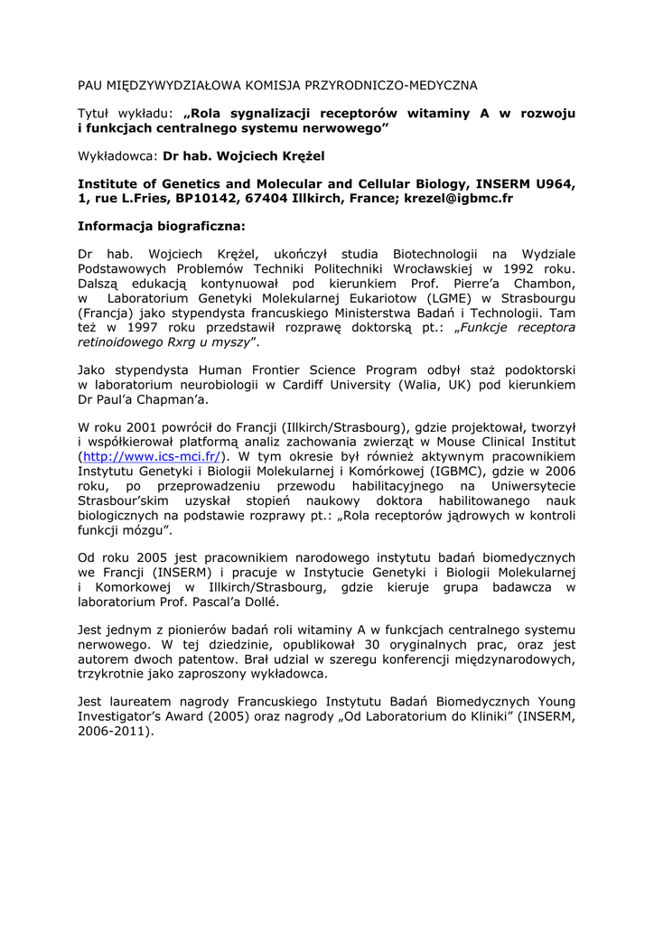 PAU MIĘDZYWYDZIAŁOWA KOMISJA PRZYRODNICZO-MEDYCZNA Tytuł wykładu: „Rola sygnalizacji receptorów witaminy A w rozwoju i funkcjach centralnego systemu nerwowego” Wykładowca: Dr hab. Wojciech Krężel Institute of Genetics and Molecular and Cellular Biology, INSERM U964, 1, rue L.Fries, BP10142, 67404 Illkirch, France; [email protected] Informacja biograficzna: Dr hab. Wojciech Krężel, ukończył studia Biotechnologii na Wydziale Podstawowych Problemów Techniki Politechniki Wrocławskiej w 1992 roku. Dalszą edukacją kontynuował pod kierunkiem Prof. Pierre’a Chambon, w Laboratorium Genetyki Molekularnej Eukariotow (LGME) w Strasbourgu (Francja) jako stypendysta francuskiego Ministerstwa Badań i Technologii. Tam też w 1997 roku przedstawił rozprawę doktorską pt.: „Funkcje receptora retinoidowego Rxrg u myszy”. Jako stypendysta Human Frontier Science Program odbył staż podoktorski w laboratorium neurobiologii w Cardiff University (Walia, UK) pod kierunkiem Dr Paul’a Chapman’a. W roku 2001 powrócił do Francji (Illkirch/Strasbourg), gdzie projektował, tworzył i współkierował platformą analiz zachowania zwierząt w Mouse Clinical Institut (http://www.ics-mci.fr/). W tym okresie był również aktywnym pracownikiem Instytutu Genetyki i Biologii Molekularnej i Komórkowej (IGBMC), gdzie w 2006 roku, po przeprowadzeniu przewodu habilitacyjnego na Uniwersytecie Strasbour’skim uzyskał stopień naukowy doktora habilitowanego nauk biologicznych na podstawie rozprawy pt.: „Rola receptorów jądrowych w kontroli funkcji mózgu”. Od roku 2005 jest pracownikiem narodowego instytutu badań biomedycznych we Francji (INSERM) i pracuje w Instytucie Genetyki i Biologii Molekularnej i Komorkowej w Illkirch/Strasbourg, gdzie kieruje grupa badawcza w laboratorium Prof. Pascal’a Dollé. Jest jednym z pionierów badań roli witaminy A w funkcjach centralnego systemu nerwowego. W tej dziedzinie, opublikował 30 oryginalnych prac, oraz jest autorem dwoch patentow. Brał udzial w szeregu konferencji międzynarodowych, trzykrotnie jako zaproszony wykładowca. Jest laureatem nagrody Francuskiego Instytutu Badań Biomedycznych Young Investigator’s Award (2005) oraz nagrody „Od Laboratorium do Kliniki” (INSERM, 2006-2011).