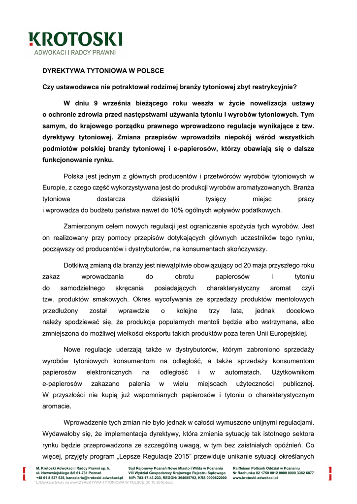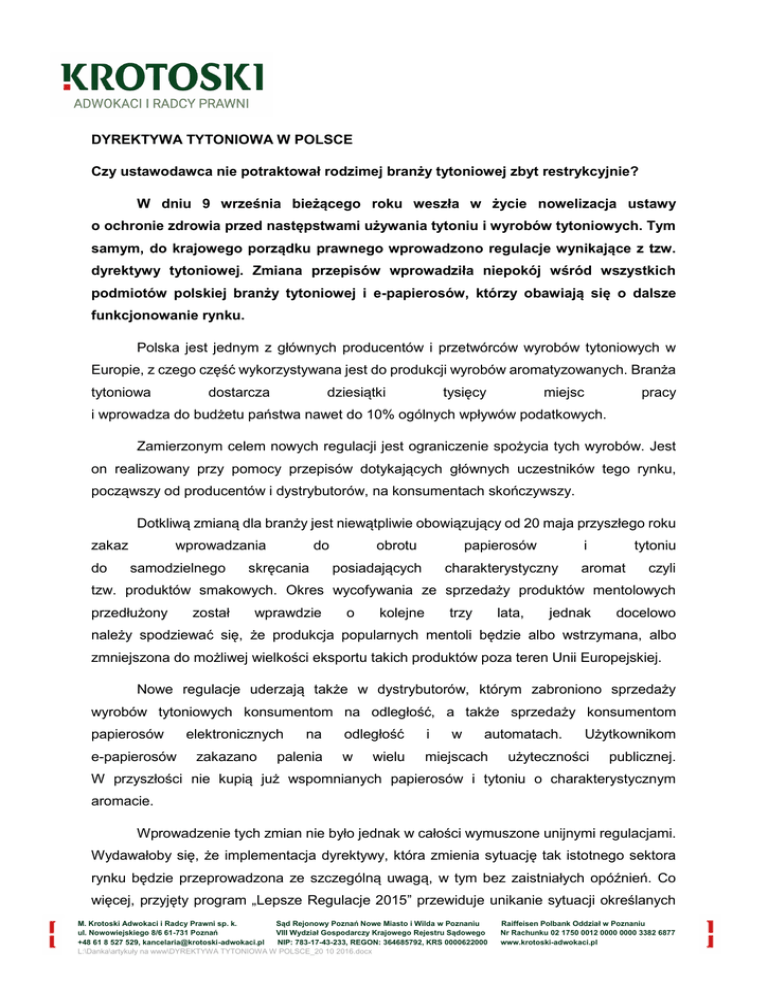 DYREKTYWA TYTONIOWA W POLSCE Czy ustawodawca nie potraktował rodzimej branży tytoniowej zbyt restrykcyjnie? W dniu 9 września bieżącego roku weszła w życie nowelizacja ustawy o ochronie zdrowia przed następstwami używania tytoniu i wyrobów tytoniowych. Tym samym, do krajowego porządku prawnego wprowadzono regulacje wynikające z tzw. dyrektywy tytoniowej. Zmiana przepisów wprowadziła niepokój wśród wszystkich podmiotów polskiej branży tytoniowej i e-papierosów, którzy obawiają się o dalsze funkcjonowanie rynku. Polska jest jednym z głównych producentów i przetwórców wyrobów tytoniowych w Europie, z czego część wykorzystywana jest do produkcji wyrobów aromatyzowanych. Branża dostarcza tytoniowa dziesiątki tysięcy miejsc pracy i wprowadza do budżetu państwa nawet do 10% ogólnych wpływów podatkowych. Zamierzonym celem nowych regulacji jest ograniczenie spożycia tych wyrobów. Jest on realizowany przy pomocy przepisów dotykających głównych uczestników tego rynku, począwszy od producentów i dystrybutorów, na konsumentach skończywszy. Dotkliwą zmianą dla branży jest niewątpliwie obowiązujący od 20 maja przyszłego roku zakaz do wprowadzania samodzielnego do skręcania obrotu papierosów posiadających i charakterystyczny tytoniu aromat czyli tzw. produktów smakowych. Okres wycofywania ze sprzedaży produktów mentolowych przedłużony został wprawdzie o kolejne trzy lata, jednak docelowo należy spodziewać się, że produkcja popularnych mentoli będzie albo wstrzymana, albo zmniejszona do możliwej wielkości eksportu takich produktów poza teren Unii Europejskiej. Nowe regulacje uderzają także w dystrybutorów, którym zabroniono sprzedaży wyrobów tytoniowych konsumentom na odległość, a także sprzedaży konsumentom papierosów e-papierosów elektronicznych zakazano na palenia odległość i w miejscach wielu w automatach. Użytkownikom użyteczności publicznej. W przyszłości nie kupią już wspomnianych papierosów i tytoniu o charakterystycznym aromacie. Wprowadzenie tych zmian nie było jednak w całości wymuszone unijnymi regulacjami. Wydawałoby się, że implementacja dyrektywy, która zmienia sytuację tak istotnego sektora rynku będzie przeprowadzona ze szczególną uwagą, w tym bez zaistniałych opóźnień. Co więcej, przyjęty program „Lepsze Regulacje 2015” przewiduje unikanie sytuacji określanych M. Krotoski Adwokaci i Radcy Prawni sp. k. Sąd Rejonowy Poznań Nowe Miasto i Wilda w Poznaniu ul. Nowowiejskiego 8/6 61-731 Poznań VIII Wydział Gospodarczy Krajowego Rejestru Sądowego +48 61 8 527 529, [email protected] NIP: 783-17-43-233, REGON: 364685792, KRS 0000622000 L:\Danka\artykuły na www\DYREKTYWA TYTONIOWA W POLSCE_20 10 2016.docx Raiffeisen Polbank Oddział w Poznaniu Nr Rachunku 02 1750 0012 0000 0000 3382 6877 www.krotoski-adwokaci.pl jako „gold-plating”, w których krajowe przepisy nakładają na przedsiębiorców bardziej restrykcyjne wymogi, niż wymaga tego dyrektywa. Tymczasem, mimo tego, że z jednej strony bronione były interesy rodzimych przedsiębiorców i producentów tytoniowych, szczególnie w zakresie dotyczącym produkcji papierosów typu slim oraz papierosów mentolowych, z drugiej jednak znowelizowana ustawa przewiduje dodatkowe wymogi i zakazy, wykraczając poza cele wskazane w dyrektywie. Jako przykład służyć może wprowadzenie zakazu produkcji tytoniu do stosowania doustnego, w tym popularnego w Skandynawii snusu. Ustawa zakazuje wprowadzania go do obrotu na terenie naszego kraju, jednak z niezrozumiałych przyczyn, nie można go również produkować na eksport. Dyrektywa tytoniowa zakazuje jedynie wprowadzania takiego tytoniu do obrotu na terenie państw członkowskich, bez uszczerbku dla postanowień art.151 Aktu przystąpienia Austrii, Finlandii i Szwecji. Przyjęte rozwiązanie uderza w tych rodzimych przedsiębiorców, którzy mogliby produkować takie produkty na rynki obce. Wspomniane zakazy dotyczące handlu na odległość również nie wynikają z unijnych regulacji, ponieważ te odnoszą się wyłącznie do sprzedaży transgranicznej, czyli sprzedaży na odległość konsumentowi z innego państwa członkowskiego. Polski przedsiębiorca, w szczególności działający na rynku lokalnym został tym samym pozbawiony możliwości sprzedaży swoich produktów na odległość na terenie naszego kraju. Implementacja dyrektywy tytoniowej wzbudza wiele emocji. Nie sposób nie zgodzić się z twierdzeniem, że zamierzony spadek popytu odbije się negatywnie na uczestnikach rynku tytoniowego i e-papierosów. Z tej przyczyny, mając na uwadze znaczenie branży tytoniowej w Polsce nakładanie dodatkowych restrykcji utrudniających prowadzenie działalności w tym sektorze jest co najmniej niezrozumiałe. Autor: Radca prawny Kamila Piernik-Wierzbowska Poznańska kancelaria M. Krotoski Adwokaci i Radcy Prawni sp.k. 2