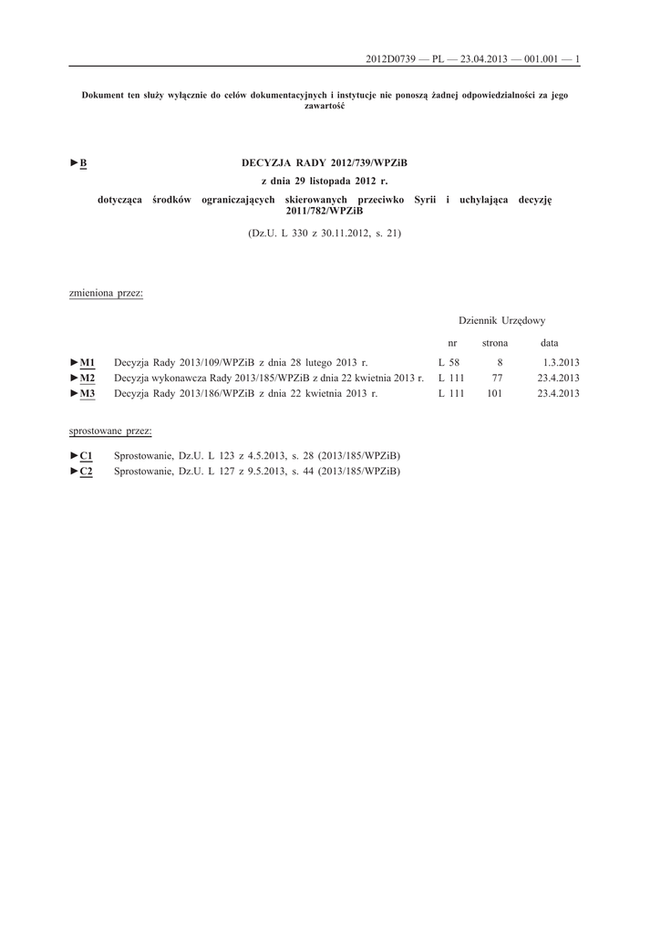 2012D0739 — PL — 23.04.2013 — 001.001 — 1 Dokument ten służy wyłącznie do celów dokumentacyjnych i instytucje nie ponoszą żadnej odpowiedzialności za jego zawartość DECYZJA RADY 2012/739/WPZiB ►B z dnia 29 listopada 2012 r. dotycząca środków ograniczających skierowanych przeciwko Syrii i uchylająca decyzję 2011/782/WPZiB (Dz.U. L 330 z 30.11.2012, s. 21) zmieniona przez: Dziennik Urzędowy ►M1 ►M2 ►M3 Decyzja Rady 2013/109/WPZiB z dnia 28 lutego 2013 r. Decyzja wykonawcza Rady 2013/185/WPZiB z dnia 22 kwietnia 2013 r. Decyzja Rady 2013/186/WPZiB z dnia 22 kwietnia 2013 r. sprostowane przez: ►C1 ►C2 Sprostowanie, Dz.U. L 123 z 4.5.2013, s. 28 (2013/185/WPZiB) Sprostowanie, Dz.U. L 127 z 9.5.2013, s. 44 (2013/185/WPZiB) nr strona L 58 L 111 L 111 8 77 101 data 1.3.2013 23.4.2013 23.4.2013 2012D0739 — PL — 23.04.2013 — 001.001 — 2 ▼B DECYZJA RADY 2012/739/WPZiB z dnia 29 listopada 2012 r. dotycząca środków ograniczających skierowanych przeciwko Syrii i uchylająca decyzję 2011/782/WPZiB RADA UNII EUROPEJSKIEJ, uwzględniając Traktat o Unii Europejskiej, w szczególności jego art. 29, a także mając na uwadze, co następuje: (1) 1 grudnia 2011 r. Rada przyjęła decyzję 2011/782/WPZiB doty czącą środków ograniczających skierowanych przeciwko Syrii (1). (2) Na podstawie przeglądu decyzji 2011/782/WPZiB Rada stwier dziła, że stosowanie środków ograniczających powinno zostać przedłużone do dnia 1 marca 2013 r. (3) Ponadto należy uaktualnić zawarty w załączniku I do decyzji 2011/782/WPZiB wykaz osób i podmiotów objętych środkami ograniczającymi. (4) Dla jasności środki nałożone decyzją 2011/273/WPZiB powinny zostać połączone w jednym akcie prawnym. (5) Decyzję 2011/782/WPZiB należy zatem uchylić. (6) Unia powinna podjąć dalsze działania, aby wprowadzić w życie niektóre środki, PRZYJMUJE NINIEJSZĄ DECYZJĘ: ROZDZIAŁ I OGRANICZENIA EKSPORTU I IMPORTU Artykuł 1 1. Sprzedaż, dostawa, przekazywanie lub eksport do Syrii wszelkich typów uzbrojenia i materiałów z nim związanych, łącznie z bronią i amunicją, pojazdami wojskowymi i sprzętem wojskowym, sprzętem paramilitarnym i częściami zamiennymi do wyżej wymienionych, jak również sprzętu, który mógłby zostać wykorzystany do stosowania wewnętrznych represji, przez obywateli państw członkowskich lub z terytoriów państw członkowskich lub z użyciem statków pływających pod ich banderą lub ich statków powietrznych, są zabronione nieza leżnie od tego, czy pochodzą z terytoriów państw członkowskich. 2. Sprzedaż, dostawa, przekazywanie lub eksport do Syrii niektórych innych: sprzętu, towarów i technologii, które mogłyby zostać wykorzys tane do stosowania wewnętrznych represji, lub do produkcji i konser wacji produktów, które mogłyby zostać wykorzystane do stosowania wewnętrznych represji, przez obywateli państw członkowskich lub z terytoriów państw członkowskich lub z użyciem statków pływających pod ich banderą lub ich statków powietrznych, są zabronione nieza leżnie od tego, czy pochodzą z terytoriów państw członkowskich. (1) Dz.U. L 319 z 2.12.2011, s. 56. 2012D0739 — PL — 23.04.2013 — 001.001 — 3 ▼B Unia podejmuje działania konieczne do określenia odpowiednich przed miotów, które mają być objęte zakresem niniejszego ustępu. 3. Zabronione jest: a) dostarczanie, bezpośrednio lub pośrednio, pomocy technicznej, usług pośrednictwa lub innych usług związanych z przedmiotami, o których mowa w ust. 1 i 2, lub związanych z dostarczaniem, produkcją, konserwacją i używaniem takich przedmiotów, jakiejkolwiek osobie fizycznej lub prawnej, podmiotowi lub organowi w Syrii lub w celu wykorzystania na terytorium tego kraju; b) zapewnianie, bezpośrednio lub pośrednio, finansowania lub pomocy finansowej związanej z przedmiotami, o których mowa w ust. 1 i 2, w tym w szczególności dotacji, pożyczek i ubezpieczeń kredytów eksportowych, a także ubezpieczeń i reasekuracji, w odniesieniu do jakiejkolwiek sprzedaży, dostawy, przekazywania lub eksportu takich przedmiotów, lub w odniesieniu do dostarczania związanej z tym pomocy technicznej, usług pośrednictwa lub innych usług jakiejkol wiek osobie fizycznej lub prawnej, podmiotowi lub organowi w Syrii lub w celu wykorzystania na terytorium Syrii. Artykuł 2 1. Sprzedaż, dostawa, przekazywanie lub eksport do Syrii niektórych: sprzętu, towarów i technologii innych niż te, o których mowa w art. 1 ust. 2, które mogłyby zostać wykorzystane do stosowania wewnętrznych represji, lub do produkcji i konserwacji produktów, które mogłyby zostać wykorzystane do stosowania wewnętrznych represji, przez obywateli państw członkowskich lub z terytoriów państw członkow skich lub z użyciem statków pływających pod ich banderą lub ich statków powietrznych, wymagają zezwolenia wydawanego po rozpat rzeniu każdego indywidualnego przypadku przez właściwe organy państwa członkowskiego eksportu. Unia podejmuje działania konieczne do określenia odpowiednich przed miotów, które mają być objęte zakresem niniejszego ustępu. 2. Zapewnianie: a) pomocy technicznej, usług pośrednictwa lub innych usług związa nych z przedmiotami, o których mowa w ust. 1, lub związanych z zaopatrzeniem, produkcją, konserwacją i używaniem takich przed miotów na rzecz jakiejkolwiek osoby fizycznej lub prawnej, podmiotu lub organu w Syrii lub w celu wykorzystania na teryto rium Syrii; b) finansowania lub pomocy finansowej związanej z przedmiotami, o których mowa w ust. 1, w tym w szczególności dotacji, pożyczek i ubezpieczeń kredytów eksportowych, a także ubezpieczeń i rease kuracji, w odniesieniu do jakiejkolwiek sprzedaży, dostawy, przeka zywania lub eksportu takich przedmiotów, lub w odniesieniu do dostarczania związanej z tym pomocy technicznej, usług pośred nictwa lub innych usług jakiejkolwiek osobie fizycznej l