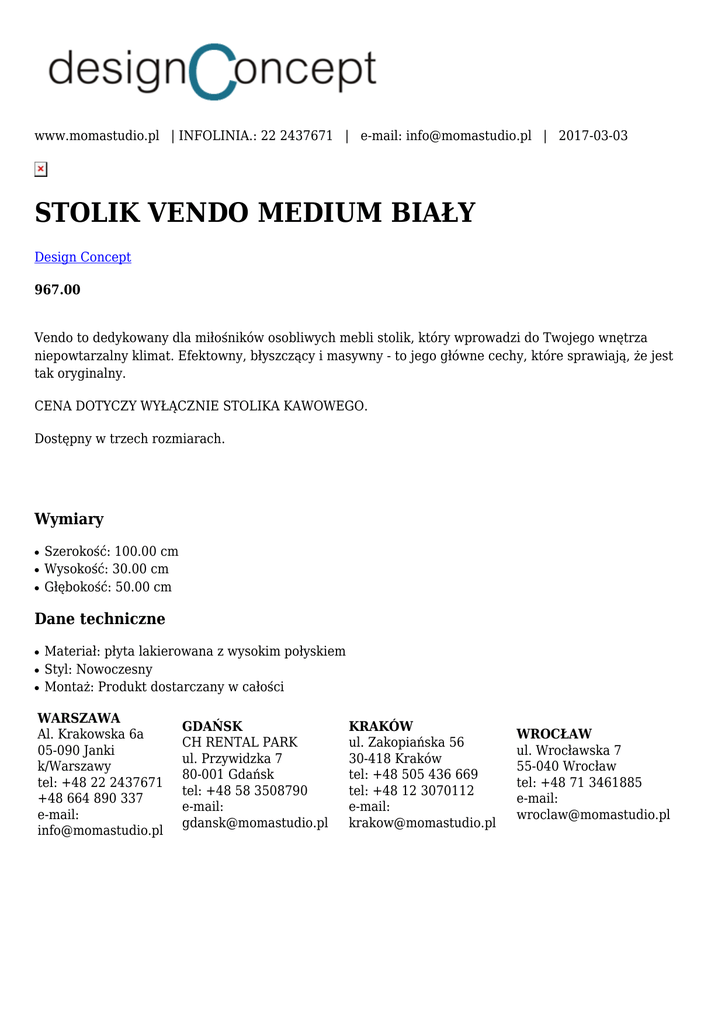 www.momastudio.pl | INFOLINIA.: 22 2437671 | e-mail: [email protected] | 2017-03-03 STOLIK VENDO MEDIUM BIAŁY Design Concept 967.00 Vendo to dedykowany dla miłośników osobliwych mebli stolik, który wprowadzi do Twojego wnętrza niepowtarzalny klimat. Efektowny, błyszczący i masywny - to jego główne cechy, które sprawiają, że jest tak oryginalny. CENA DOTYCZY WYŁĄCZNIE STOLIKA KAWOWEGO. Dostępny w trzech rozmiarach. Wymiary ● ● ● Szerokość: 100.00 cm Wysokość: 30.00 cm Głębokość: 50.00 cm Dane techniczne ● ● ● Materiał: płyta lakierowana z wysokim połyskiem Styl: Nowoczesny Montaż: Produkt dostarczany w całości WARSZAWA Al. Krakowska 6a 05-090 Janki k/Warszawy tel: +48 22 2437671 +48 664 890 337 e-mail: [email protected] GDAŃSK CH RENTAL PARK ul. Przywidzka 7 80-001 Gdańsk tel: +48 58 3508790 e-mail: [email protected] KRAKÓW ul. Zakopiańska 56 30-418 Kraków tel: +48 505 436 669 tel: +48 12 3070112 e-mail: [email protected] WROCŁAW ul. Wrocławska 7 55-040 Wrocław tel: +48 71 3461885 e-mail: [email protected]