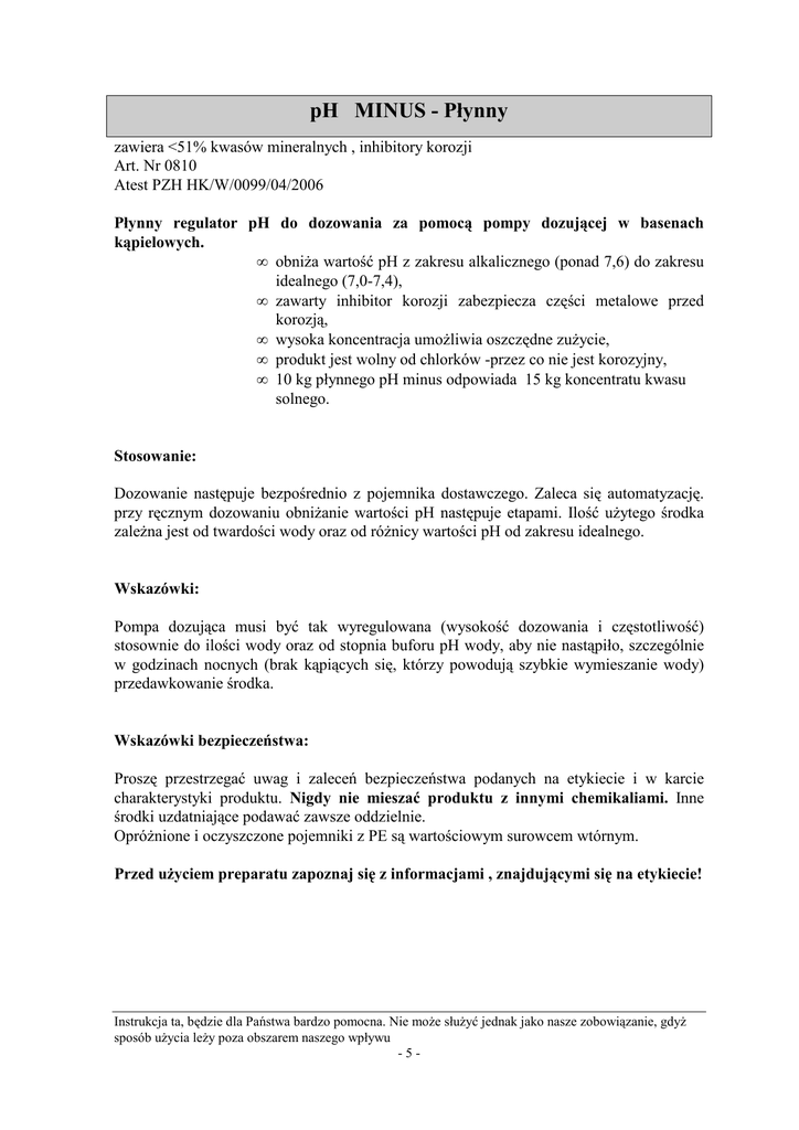 pH MINUS - Płynny zawiera <51% kwasów mineralnych , inhibitory korozji Art. Nr 0810 Atest PZH HK/W/0099/04/2006 Płynny regulator pH do dozowania za pomocą pompy dozującej w basenach kąpielowych. • obniŜa wartość pH z zakresu alkalicznego (ponad 7,6) do zakresu idealnego (7,0-7,4), • zawarty inhibitor korozji zabezpiecza części metalowe przed korozją, • wysoka koncentracja umoŜliwia oszczędne zuŜycie, • produkt jest wolny od chlorków -przez co nie jest korozyjny, • 10 kg płynnego pH minus odpowiada 15 kg koncentratu kwasu solnego. Stosowanie: Dozowanie następuje bezpośrednio z pojemnika dostawczego. Zaleca się automatyzację. przy ręcznym dozowaniu obniŜanie wartości pH następuje etapami. Ilość uŜytego środka zaleŜna jest od twardości wody oraz od róŜnicy wartości pH od zakresu idealnego. Wskazówki: Pompa dozująca musi być tak wyregulowana (wysokość dozowania i częstotliwość) stosownie do ilości wody oraz od stopnia buforu pH wody, aby nie nastąpiło, szczególnie w godzinach nocnych (brak kąpiących się, którzy powodują szybkie wymieszanie wody) przedawkowanie środka. Wskazówki bezpieczeństwa: Proszę przestrzegać uwag i zaleceń bezpieczeństwa podanych na etykiecie i w karcie charakterystyki produktu. Nigdy nie mieszać produktu z innymi chemikaliami. Inne środki uzdatniające podawać zawsze oddzielnie. OpróŜnione i oczyszczone pojemniki z PE są wartościowym surowcem wtórnym. Przed uŜyciem preparatu zapoznaj się z informacjami , znajdującymi się na etykiecie! Instrukcja ta, będzie dla Państwa bardzo pomocna. Nie moŜe słuŜyć jednak jako nasze zobowiązanie, gdyŜ sposób uŜycia leŜy poza obszarem naszego wpływu -5-