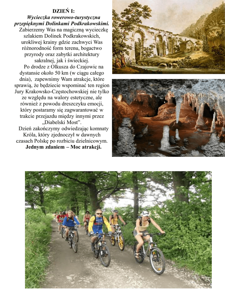 DZIEŃ I: Wycieczka rowerowo-turystyczna przepięknymi Dolinkami Podkrakowskimi. Zabierzemy Was na magiczną wycieczkę szlakiem Dolinek Podkrakowskich, urokliwej krainy gdzie zachwyci Was różnorodność form terenu, bogactwo przyrody oraz zabytki architektury sakralnej, jak i świeckiej. Po drodze z Olkusza do Czajowic na dystansie około 50 km (w ciągu całego dnia), zapewnimy Wam atrakcje, które sprawią, że będziecie wspominać ten region Jury Krakowsko-Częstochowskiej nie tylko ze względu na walory estetyczne, ale również z powodu dreszczyku emocji, który postaramy się zagwarantować w trakcie przejazdu między innymi przez „Diabelski Most”. Dzień zakończymy odwiedzając komnaty Króla, który zjednoczył w dawnych czasach Polskę po rozbiciu dzielnicowym. Jednym zdaniem – Moc atrakcji. DZIEŃ II: Zabawy linowo-wysokościowe z rowerem Z rowerami... Ci dla których to nie jest pierwsze spotkanie z firmą Survival-Dynamis wiedzą, że jest to możliwe. Dlatego pewnie z zaciekawieniem i nutką niepewności wsiądziecie rano na rowery by na pętli mającej około 15 km. zmierzyć się z niespodziankami przygotowanymi przez instruktorów naszej firmy. Trasa będzie prowadziła szlakiem Dolinek Krakowskich takich jak: Dolina Kobylańska, Bolechowicka i Kluczowody, więc walorów estetycznych i pięknych krajobrazów będzie również pod dostatkiem. Oczywiście to nie wszystko co przygotowaliśmy dla Was na ten dzień, gdyż po drodze zobaczycie ruiny zamku oraz zwiedzicie Jaskinię Mamutową. Jednym zdaniem – Dużo, dużo dobrej zabawy. DZIEŃ III: Pradawnym szlakiem naszych przodków. Nadszedł dzień by wyruszyć w drogę ku przygodzie królową Dolinek Krakowskich, Doliną Prądnika. Dokładnie tak jak za dawnych czasów podróżowali nasi przodkowie by dotrzeć do Krakowa. To tu po drodze zobaczymy Bramę Krakowską, Zamek w Ojcowie, Kaplicę na Wodzie, Maczugę Herkulesa oraz Zamek na Pieskowej Skale, do którego zaprosimy Was na krótką przerwę by podziwiać piękno okolicy pijąc kawę lub herbatę. Ta przerwa da Wam niewątpliwie energię by dalej popedałować w kierunku Zamku w Bydlinie, skąd już jest tylko kawałek do celu podróży jakim jest Zamek w Smoleniu. Dzień pełen wrażeń, podczas którego pokonacie około 60 km, zakończymy noclegiem na świeżym powietrzu w warunkach zapowiadających kolejne atrakcje ;). Wcześniej oczywiście grill i ognisko, a dla wytrwałych czyli niewątpliwie dla wszystkich - niespodzianka. Jednym zdaniem – Spotkanie z historią w siodle, no może w siodełku ;). DZIEŃ IV: „Słuchaj tego, który wie, że wie. Naucz tego, który wie, że nie wie. Obudź tego, który nie wie, że wie. Od tego, który nie wie, że nie wie uciekaj.” To chińskie przysłowie będzie Naszym mottem w trakcie zmagań, które przygotujemy Wam w 4 dniu naszej wspólnej zabawy. W tym szczególnym dniu pokażemy, że można bawić się w naturalny sposób, zapominając o zgiełku życia codziennego. Odstawimy komputery, telefony i wielkomiejski szum by przemierzać dziewicze tereny, wsłuchując się w śpiew ptaków, szelest liści drzew i rozsmakować się w darach lasu. Oczywiście połączymy przyjemne z pożytecznym i przy okazji pokażemy Wam jak bezpiecznie poruszać się w leśnych ostępach i radzić sobie gdy nasze życie jest zagrożone. Czym jest zdobywanie wiedzy bez sprawdzenia czy potrafimy ją wykorzystać?. Przygotujemy grę terenową, w trakcie której sprawdzicie własną wytrzymałość, zaradność i umiejętność pracy w zespole. Bawiąc się i ucząc, ucząc się i bawiąc przejedziemy około 20 km i dojedziemy do Ogrodzieńca, gdzie czeka nas cywilizacja i … spotkanie z duchami. Jednym zdaniem – Survival pełną gębą ;) DZIEŃ V: „Makumba, Makumba Ska, Polska – Afryka, Afryka - Polska” Ze słowami zabawnej piosenki grupy Big Cyc na ustach ruszymy by eksplorować kawałek Afryki w Polsce. Tak, tak będziemy na pustyni i będziemy ją zwiedzać w odmienny sposób niż przez ostatnie dni bo pieszo. Po około 20 kilometrach jazdy rowerem urokliwą Jurą zamiast w rękach trzymać kierownicę chwycicie kije w dłonie i poznając tajniki Nordic Walking'u przemierzycie pustynię Błędowską. Ewenement na skalę Europejską, który już od dawna był wykorzystywany jako poligon dla wojska. To tu w czasie II wojny światowej oddziały niemieckiej Afrika Korps przygotowywały się do walki w Północnej Afryce. Teraz obszar ten po części wciąż służy jako poligon dla wojska, ale również jest dostępny dla turystów, pragnących zasmakować jak My Afryki w Polsce. Następnie leśnymi drogami z wykorzystaniem kijów po przebyciu około 15 km dojdziemy do Zamku w Rabsztynie, gdzie jest już tylko krok do Olkusza skąd rozpoczęliśmy naszą wędrówkę. W pobliżu Zamku zapraszamy Was na wieczór przy ognisku, by w przyjemny, radosny sposób, może do rana ;-), podsumować nasze 5dniowe zmagania . Jednym zdaniem – Jak ten czas szybko leci.