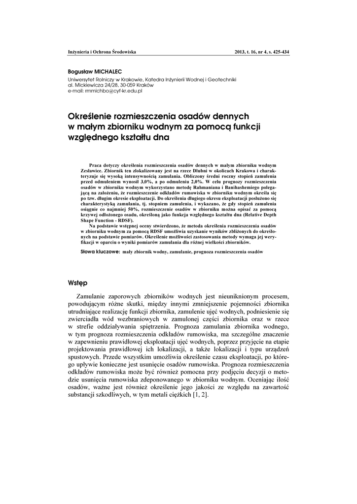 Inżynieria i Ochrona Środowiska 2013, t. 16, nr 4, s. 425-434 Bogusław MICHALEC Uniwersytet Rolniczy w Krakowie, Katedra Inżynierii Wodnej i Geotechniki al. Mickiewicza 24/28, 30-059 Kraków e-mail: [email protected] Określenie rozmieszczenia osadów dennych w małym zbiorniku wodnym za pomocą funkcji względnego kształtu dna Praca dotyczy określenia rozmieszczenia osadów dennych w małym zbiorniku wodnym Zesławice. Zbiornik ten zlokalizowany jest na rzece Dłubni w okolicach Krakowa i charakteryzuje się wysoką intensywnością zamulania. Obliczony średni roczny stopień zamulenia przed odmuleniem wynosił 3,0%, a po odmuleniu 2,0%. W celu prognozy rozmieszczenia osadów w zbiorniku wodnym wykorzystano metodę Rahmaniana i Banihashemiego polegającą na założeniu, że rozmieszczenie odkładów rumowiska w zbiorniku wodnym określa się po tzw. długim okresie eksploatacji. Do określenia długiego okresu eksploatacji posłużono się charakterystyką zamulania, tj. stopniem zamulenia, i wykazano, że gdy stopień zamulenia osiągnie co najmniej 50%, rozmieszczenie osadów w zbiorniku można opisać za pomocą krzywej odłożonego osadu, określoną jako funkcja względnego kształtu dna (Relative Depth Shape Function - RDSF). Na podstawie wstępnej oceny stwierdzono, że metoda określenia rozmieszczenia osadów w zbiorniku wodnym za pomocą RDSF umożliwia uzyskanie wyników zbliżonych do określonych na podstawie pomiarów. Określenie możliwości zastosowania metody wymaga jej weryfikacji w oparciu o wyniki pomiarów zamulania dla różnej wielkości zbiorników. Słowa kluczowe: mały zbiornik wodny, zamulanie, prognoza rozmieszczenia osadów Wstęp Zamulanie zaporowych zbiorników wodnych jest nieuniknionym procesem, powodującym różne skutki, między innymi zmniejszenie pojemności zbiornika utrudniające realizację funkcji zbiornika, zamulenie ujęć wodnych, podniesienie się zwierciadła wód wezbraniowych w zamulonej części zbiornika oraz w rzece w strefie oddziaływania spiętrzenia. Prognoza zamulania zbiornika wodnego, w tym prognoza rozmieszczenia odkładów rumowiska, ma szczególne znaczenie w zapewnieniu prawidłowej eksploatacji ujęć wodnych, poprzez przyjęcie na etapie projektowania prawidłowej ich lokalizacji, a także lokalizacji i typu urządzeń spustowych. Przede wszystkim umożliwia określenie czasu eksploatacji, po którego upływie konieczne jest usunięcie osadów rumowiska. Prognoza rozmieszczenia odkładów rumowiska może być również pomocna przy podjęciu decyzji o metodzie usunięcia rumowiska zdeponowanego w zbiorniku wodnym. Oceniając ilość osadów, ważne jest również określenie jego jakości ze względu na zawartość substancji szkodliwych, w tym metali ciężkich [1, 2]. 426 B. Michalec Spośród metod empirycznych, służących prognozowaniu zamulania, czyli objętości rumowiska odłożonego w zbiorniku po upływie określonego czasu, można wymienić metodę Ortha z 1934 roku [3], Šamova z 1959 roku [3], Gončarova z 1962 roku [4] i Łapszenkova z 1957 roku [5]. Obecnie, ze względu na rozwój technik obliczeniowych, najczęściej stosuje się metody numeryczne, które wraz z analitycznymi zaliczane są do metod teoretycznych. Metody numeryczne obliczeń transportu rumowiska dają możliwości symulacji przepływu w jednym, dwóch i trzech wymiarach. Wśród wielu jednowymiarowych modeli numerycznych najczęściej stosowanych wyróżnić można modele HEC-6 [6], MIKE11, FLUVIAL [7] i MORMO [8]. Najpopularniejsze modele dwuwymiarowe: to MIKE21, TABS-MD, CCHED2, HSCTM2D i GSTARS [9]. Spośród modeli trójwymiarowych należy wymienić między innymi: SSIIM, ECOMSED, CCHED3, Delft-3D [5]. Dystrybucję osadów rumowiska w zbiorniku wodnym można określić za pomocą metod numerycznych i empirycznych. Spośród metod empirycznych służących prognozowaniu lub umożliwiających opis rozmieszczenia przestrzennego osadów w zbiornikach wodnych można wymienić między innymi metody: Cristofano [10], Borlanda i Millera [11], Lary [12], Hobbsa [13], Borlanda [14], a także nową metodę Rahmaniana i Banihashemiego [15]. Metody te zostały opracowane na podstawie analizy rozmieszczenia osadów w średnich i dużych zbiornikach wodnych, a ich zastosowanie w prognozowaniu rozmieszczenia rumowiska w małych zbiornikach wodnych wymaga weryfikacji. Dokonanie weryfikacji tych metod wymaga natomiast dysponowania wynikami pomiarów zamulenia małych zbiorników wodnych i opracowanym na ich podstawie rozmieszczeniem osadów. Prace badawcze dotyczące rozmieszczenia osadów prowadzone są od kilku lat w Katedrze Inżynierii Wodnej i Geotechniki Uniwersytetu Rolniczego w Krakowie. W pracy Michalca i Tarnawskiego [22] przedstawiono wstępną ocenę zastosowania metody Roosebooma i Annandale’a [16]. Ocena ta dotyczyła możliwości prognozowania rozmieszczenia rumowiska w małym zbiorniku wodnym w Krempnej. Szczegółową ocenę tej metody, opracowaną na podstawie badań procesu zamulania dwunastu małych zbiorników wodnych, zamieszczono w pracy Michalca [17]. Aplikacja wyżej wymienionych metod do określenia rozmieszczenia osadów dennych w małych zbiornikach wodnych nie zawsze jest możliwa. Według metody empirycznej Area Increment Method (AIM), opracowanej przez Christofano, przyjmuje się miąższość osadu w części przyzaporowej zbiornika wodnego i zakłada się, że rumowisko będzie odkładać się jedynie w martwej strefie pojemności zbiornika [5]. Natomiast metoda Borlanda-Millera (Empirical Area-Reduction Method - EARM) została opracowana na podstawie wyników pomiarów zamulenia 30 zbiorników wodnych o pojemnościach od 49 mln m3 do 37 mld m3 [5]. Z tego też względu nie znajduje ona zastosowania w przypadku małych zbiorników wodnych, podobnie jak metoda Christofano. Nową empiryczną metodą, służącą prognozowaniu rozmieszczenia osadów dennych w zbiorniku wodnym, jest opracowana przez Rahmaniana i B