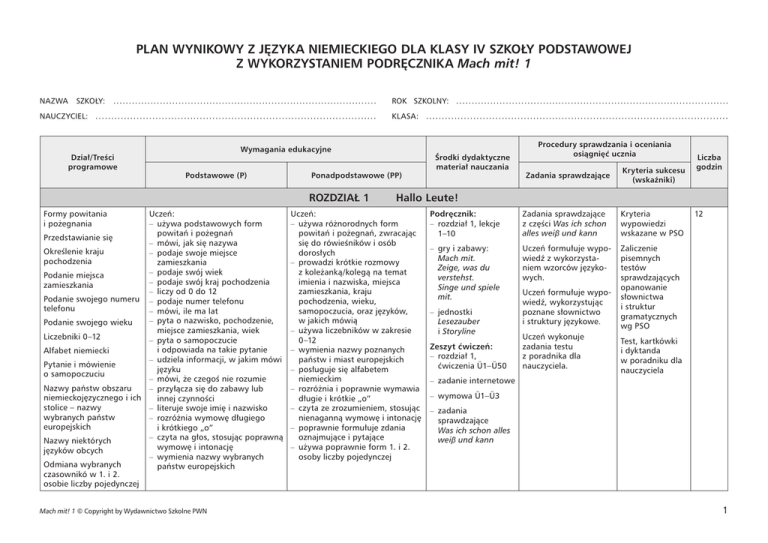 PLAN WYNIKOWY Z JĘZYKA NIEMIECKIEGO DLA KLASY IV SZKOŁY PODSTAWOWEJ Z WYKORZYSTANIEM PODRĘCZNIKA Mach mit! 1 NAZWA SZKOŁY: . . . . . . . . . . . . . . . . . . . . . . . . . . . . . . . . . . . . . . . . . . . . . . . . . . . . . . . . . . . . . . . . . . . . . . . . . . . . . . . . . . . . . ROK SZKOLNY: . . . . . . . . . . . . . . . . . . . . . . . . . . . . . . . . . . . . . . . . . . . . . . . . . . . . . . . . . . . . . . . . . . . . . . . . . . . . . . . . . . . . . . . . NAUCZYCIEL: . . . . . . . . . . . . . . . . . . . . . . . . . . . . . . . . . . . . . . . . . . . . . . . . . . . . . . . . . . . . . . . . . . . . . . . . . . . . . . . . . . . . . . . . . KLASA: . . . . . . . . . . . . . . . . . . . . . . . . . . . . . . . . . . . . . . . . . . . . . . . . . . . . . . . . . . . . . . . . . . . . . . . . . . . . . . . . . . . . . . . . . . . . . . . . Dział/Treści programowe Wymagania edukacyjne Podstawowe (P) Ponadpodstawowe (PP) ROZDZIAŁ 1 Formy powitania i pożegnania Przedstawianie się Określenie kraju pochodzenia Podanie miejsca zamieszkania Podanie swojego numeru telefonu Podanie swojego wieku Liczebniki 0–12 Alfabet niemiecki Pytanie i mówienie o samopoczuciu Nazwy państw obszaru niemieckojęzycznego i ich stolice – nazwy wybranych państw europejskich Nazwy niektórych języków obcych Odmiana wybranych czasownikó w 1. i 2. osobie liczby pojedynczej Uczeń: –– używa podstawowych form powitań i pożegnań –– mówi, jak się nazywa –– podaje swoje miejsce zamieszkania –– podaje swój wiek –– podaje swój kraj pochodzenia –– liczy od 0 do 12 –– podaje numer telefonu –– mówi, ile ma lat –– pyta o nazwisko, pochodzenie, miejsce zamieszkania, wiek –– pyta o samopoczucie i odpowiada na takie pytanie –– udziela informacji, w jakim mówi języku –– mówi, że czegoś nie rozumie –– przyłącza się do zabawy lub innej czynności –– literuje swoje imię i nazwisko –– rozróżnia wymowę długiego i krótkiego „o” –– czyta na głos, stosując poprawną wymowę i intonację –– wymienia nazwy wybranych państw europejskich Mach mit! 1 © Copyright by Wydawnictwo Szkolne PWN Środki dydaktyczne materiał nauczania Procedury sprawdzania i oceniania osiągnięć ucznia Zadania sprawdzające Kryteria sukcesu (wskaźniki) Liczba godzin Hallo Leute! Uczeń: –– używa różnorodnych form powitań i pożegnań, zwracając się do rówieśników i osób dorosłych –– prowadzi krótkie rozmowy z koleżanką/kolegą na temat imienia i nazwiska, miejsca zamieszkania, kraju pochodzenia, wieku, samopoczucia, oraz języków, w jakich mówią –– używa liczebników w zakresie 0–12 –– wymienia nazwy poznanych państw i miast europejskich –– posługuje się alfabetem niemieckim –– rozróżnia i poprawnie wymawia długie i krótkie „o” –– czyta ze zrozumieniem, stosując nienaganną wymowę i intonację –– poprawnie formułuje zdania oznajmujące i pytające –– używa poprawnie form 1. i 2. osoby liczby pojedynczej Podręcznik: –– rozdział 1, lekcje 1–10 Zadania sprawdzające z części Was ich schon alles weiβ und kann Kryteria wypowiedzi wskazane w PSO –– gry i zabawy: Mach mit. Zeige, was du verstehst. Singe und spiele mit. Uczeń formułuje wypowiedź z wykorzystaniem wzorców językowych. Zaliczenie pisemnych testów sprawdzających opanowanie słownictwa i struktur gramatycznych wg PSO –– jednostki Lesezauber i Storyline Zeszyt ćwiczeń: –– rozdział 1, ćwiczenia Ü1–Ü50 Uczeń formułuje wypowiedź, wykorzystując poznane słownictwo i struktury językowe. Uczeń wykonuje zadania testu z poradnika dla nauczyciela. 12 Test, kartkówki i dyktanda w poradniku dla nauczyciela –– zadanie internetowe –– wymowa Ü1–Ü3 –– zadania sprawdzające Was ich schon alles weiβ und kann 1 Dział/Treści programowe Wymagania edukacyjne Podstawowe (P) Ponadpodstawowe (PP) –– zna budowę zdania czasowników wohnen, heißen, oznajmującego i pytającego kommen, sein, sprechen –– zna i stosuje zaimki osobowe ich –– rozumie selektywnie krótki tekst i du czytany i słuchany oraz –– zna formę 1. i 2. osoby liczby wyszukuje w nim potrzebne pojedynczej czasowników: informacje wohnen, heiβen, kommen, sein, –– uczeń formułuje poprawne sprechen wypowiedzi pisemne. –– rozumie ogólny sens tekstu czytanego i słuchanego –– uczeń formułuje poprawne wypowiedzi pisemne. ROZDZIAŁ 2 Nazwy ulubionych czynności Nazwy dyscyplin sportowych Nazwy instrumentów Nazwy gier towarzyskich Rozmowa na temat własnych zainteresowaniach Zainteresowania innych osób Wyrażanie pozytywnej i negatywnej opinii Tworzenie pytań przez inwersję Koniugacja czasowników w liczbie pojedynczej i mnogiej Rodzajniki określone i nieokreślone 2 Uczeń: –– wymienia nazwy zainteresowań, dyscyplin sportowych, instrumentów, gier towarzyskich –– mówi, czym się interesuje, jaki uprawia sport, na jakim instrumencie gra lub chciałby grać –– pyta koleżankę/kolegę, co robi w wolnym czasie –– pyta i mówi o tym, co inna osoba robi w wolnym czasie –– mówi, jak ocenia daną czynność –– tworzy pytania przez inwersję –– odmienia czasowniki: lesen i sprechen w liczbie pojedynczej i mnogiej –– rozróżnia rodzajniki określone i nieokreślone –– rozróżnia wymowę długiego i krótkiego „e” –– czyta na głos, stosując poprawną wymowę i intonację –– rozumie ogólny sens tekstu czytanego i słuchanego –– uczeń formułuje poprawne wypowiedzi pisemne. Środki dydaktyczne materiał nauczania Procedury sprawdzania i oceniania osiągnięć ucznia Zadania sprawdzające Kryteria sukcesu (wskaźniki) Liczba godzin –– gramatyka Eine Prise Grammatik 1–4 Ich spiele gern Ball Uczeń: –– bezbłędnie wymienia nazwy zainteresowań, dyscyplin sportowych, instrumentów, gier towarzyskich –– opisuje zain