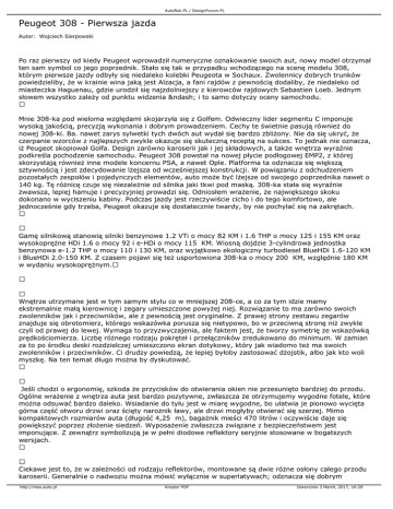 AutoRok.PL / DesignForum.PL Peugeot 308 - Pierwsza jazda Autor: Wojciech Sierpowski Po raz pierwszy od kiedy Peugeot wprowadził numeryczne oznakowanie swoich aut, nowy model otrzymał ten sam symbol co jego poprzednik. Stało się tak w przypadku wchodzącego na scenę modelu 308, którym pierwsze jazdy odbyły się niedaleko kolebki Peugeota w Sochaux. Zwolennicy dobrych trunków powiedzieliby, że w krainie wina jaką jest Alzacja, a fani rajdów z pewnością dodaliby, że niedaleko od miasteczka Haguenau, gdzie urodził się najzdolniejszy z kierowców rajdowych Sebastien Loeb. Jednym słowem wszystko zależy od punktu widzenia – i to samo dotyczy oceny samochodu. Mnie 308-ka pod wieloma względami skojarzyła się z Golfem. Odwieczny lider segmentu C imponuje wysoką jakością, precyzją wykonania i dobrym prowadzeniem. Cechy te świetnie pasują również do nowej 308-ki. Ba. nawet zarys sylwetki tych dwóch aut wydał się bardzo zbliżony. Nie da się ukryć, że czerpanie wzorców z najlepszych zwykle okazuje się skuteczną receptą na sukces. To jednak nie oznacza, iż Peugeot skopiował Golfa. Design zarówno karoserii jak i jej składowych, a także wnętrza wyraźnie podkreśla pochodzenie samochodu. Peugeot 308 powstał na nowej płycie podłogowej EMP2, z której skorzystają również inne modele koncernu PSA, a nawet Ople. Platforma ta odznacza się większą sztywnością i jest zdecydowanie lżejsza od wcześniejszej konstrukcji. W powiązaniu z odchudzeniem pozostałych zespołów i pojedynczych elementów, auto może być lżejsze od swojego poprzednika nawet o 140 kg. Tę różnicę czuje się niezależnie od silnika jaki tkwi pod maską. 308-ka stała się wyraźnie żwawsza, lepiej hamuje i precyzyjniej prowadzi się. Odniosłem wrażenie, że największego skoku dokonano w wyciszeniu kabiny. Podczas jazdy jest rzeczywiście cicho i do tego komfortowo, ale jednocześnie gdy trzeba, Peugeot okazuje się dostatecznie twardy, by nie pochylać się na zakrętach. Gamę silnikową stanowią silniki benzynowe 1.2 VTi o mocy 82 KM i 1.6 THP o mocy 125 i 155 KM oraz wysokoprężne HDi 1.6 o mocy 92 i e-HDi o mocy 115 KM. Wiosną dojdzie 3-cylindrowa jednostka benzynowa e-1.2 THP o mocy 110 i 130 KM, oraz wyjątkowo ekologiczny turbodiesel BlueHDi 1.6-120 KM i BlueHDi 2.0-150 KM. Z czasem pojawi się też usportowiona 308-ka o mocy 200 KM, względnie 180 KM w wydaniu wysokoprężnym. Wnętrze utrzymane jest w tym samym stylu co w mniejszej 208-ce, a co za tym idzie mamy ekstremalnie małą kierownicę i zegary umieszczone powyżej niej. Rozwiązanie to ma zarówno swoich zwolenników jak i przeciwników, ale z pewnością jest oryginalne. Z prawej strony zestawu zegarów znajduje się obrotomierz, którego wskazówka porusza się nietypowo, bo w przeciwną stronę niż zwykle czyli od prawej do lewej. Wymaga to przyzwyczajenia, ale faktem jest, że tworzy symetrię ze wskazówką prędkościomierza. Liczbę różnego rodzaju pokręteł i przełączników zredukowano do minimum. W zamian za to po środku deski rozdzielczej umieszczono ekran dotykowy, który jak wiadomo też ma swoich zwolenników i przeciwników. Ci drudzy powiedzą, że lepiej byłoby zastosować dżojstik, albo jak kto woli myszkę. Na ten temat długo można by dyskutować. Jeśli chodzi o ergonomię, szkoda że przycisków do otwierania okien nie przesunięto bardziej do przodu. Ogólne wrażenie z wnętrza auta jest bardzo pozytywne, zwłaszcza że otrzymujemy wygodne fotele, które można odsuwać bardzo daleko. Wsiadanie do tyłu jest w miarę wygodne, bo ułatwia je pionowo wycięta górna część otworu drzwi oraz ścięty narożnik ławy, ale drzwi mogłyby otwierać się szerzej. Mimo kompaktowych rozmiarów auta (długość 4,25 m), bagażnik mieści 470 litrów i oczywiście daje się powiększyć poprzez złożenie siedzeń. Wyposażenie zwłaszcza związane z bezpieczeństwem jest imponujące. Z zewnątrz symbolizują je w pełni diodowe reflektory seryjnie stosowane w bogatszych wersjach. Ciekawe jest to, że w zależności od rodzaju reflektorów, montowane są dwie różne osłony całego przodu karoserii. Generalnie o nadwoziu można mówić wyłącznie w superlatywach; odznacza się dobrym http://mas.auto.pl Kreator PDF Utworzono 3 March, 2017, 16:28 AutoRok.PL / DesignForum.PL stonowanym designem oraz niskim współczynnikiem doskonałości aerodynamicznej Cx-0,28. Do tego wydaje się urokliwe, o co w segmencie stawiającym na funkcjonalność wcale nie łatwo. Wojciech Sierpowski Galeria zdjęć http://mas.auto.pl Kreator PDF Utworzono 3 March, 2017, 16:28