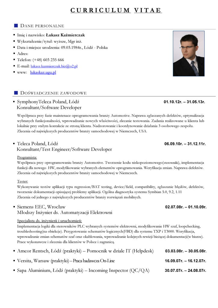 CURRICULUM VITAE D ANE PERSONALNE Imię i nazwisko: Łukasz Kaźmierczak Wykształcenie/tytuł: wyższe, Mgr inż. Data i miejsce urodzenia: 09.03.1984r., Łódź - Polska Adres: Telefon: (+48) 603 235 666 E-mail: [email protected] www: lukaskaz.ugu.pl D OŚWIADCZENIE ZAWODOWE SymphonyTeleca Poland, Łódź 01.10.12r. – 31.05.13r. Konsultant/Software Developer Współpraca przy fazie maintenace oprogramowania branży Automotive. Naprawa zgłaszanych defektów, optymalizacja wybranych funkcjonalności, wprowadzanie nowych właściwości, zlecanie testowania. Zadania realizowane u klienta lub lokalnie przy stałym kontakcie ze stroną klienta. Nadzorowanie i koordynowanie działania 3 osobowego zespołu. Zlecenia od największych producentów branży samochodowej w Niemczech, USA. Teleca Poland, Łódź 06.09.10r. – 31.12.11r. Konsultant/Test Engineer/Software Developer Programista: Wspólpraca przy oprogramowaniu branży Automotive. Tworzenie kodu niskopoziomowego(sterowniki), implementacja funkcji dla nowego HW, modyfikowanie wybranych elementów oprogramowania. Weryfikacja zmian. Naprawa defektów. Zlecenia od największych producentów branży samochodowej w Niemczech. Tester: Wykonywanie testów aplikacji typu regression/BAT testing, device/field, compatibility, zgłaszanie błędów, defektów, tworzenie dokumentacji opisującej problemy aplikacji. Ogólna diagnostyka systemu Symbian 5.0, 9.2, 1.11 Zlecenia od jednego z największych producentów branży rozwiązań mobilnych. Siemens EEC, Wrocław 02.07.08r. – 01.10.09r. Młodszy Inżynier ds. Automatyzacji Elektrowni Specjalista ds. inżynierii i uruchomień: Implementacja logiki dla sterowników PLC wybranych systemów elektrowni, modyfikowanie HW szaf, loopchecking, troubleshooting(na obiekcje). Przygotowanie schematów logicznych(FBD) dla systemu TXP i T3000. Weryfikacja, wprowadzanie zmian schematów szaf oraz okablowania, wprowadzanie kolejnych rewizji bieżącej dokumentacji(w biurze). Prace wykonawcze i zlecenia dla klientów w Polsce i zagranicą. Amcor Rentsch, Łódź (praktyki) – Pomocnik w dziale IT (Helpdesk) 03.03.08r. – 30.05.08r. Versita, Warsaw (praktyki) – Praca badawcza On-Line 16.09.07r. – 16.12.07r. Sapa Aluminium, Łódź (praktyki) – Incoming Inspector (QC/QA) 30.07.07r. – 24.08.07r. KURSY/SZKOLENIA Techniki pracy z kodem (najlepsze praktyki programowania objektowego i wzoce projektowe, strategia czystego kodu, refaktoryzacja, testy jednostkowe) Systemy komunikacji w pojazdach: teoria/diagnostyka/analiza (magistrale danych CAN, LIN i MOST) Komputerowe wspomaganie projektowania: AutoCAD – 2D/ AutoCAD – 3D, podstawy, edycja zaawansowana Analiza oraz interpretacja schematów obwodowych, montażowych oraz procesów P&ID Zasady przeprowadzania uruchomień systemowych w zakresie programowym/sprzętowym/HMI ( certyfikat LUniversity/Power Academy) Architektura, struktura oraz funkcjonowanie szaf systemu automatyki (m.in. systemu T2000/T3000) Zasady technologii oraz automatyzacji elektrowni System klasyfikacji sekcji elektrowni (KKS) Wizualizacja, struktura oraz implementacje w systemie SPPA Teleperm XP oraz SPPA T3000 Graficzne wspomaganie elementów sprzętowych/Hardware – Tec4FDE/Tec4Fun – podstawy Zarządzanie czasem dla programistów Metodologia zarządzania SCRUM w projektach informatycznych Zarządzanie projektami zgodnie z metodyką PRINCE2 (certyfikat OGC PRINCE2 Foundation) − Harmonogramowanie projektów (MS Project, zarządzanie ryzykiem, kontrola realizacji projektu) − Praktyczne aspekty Project Managera (komunikacja w zespole/projekcie, motywowanie, konflikty, negocjacje) Zasady delegowania i wykonywania zleconych prac u klienta (oddelegowań) System zarządzania jakością QM jako Wewnętrzny System Kontroli oraz zasady eksportu/ECCN U MIEJĘTNOŚCI Dobra znajomość: Środowiska Linux(POSIX, systemy/aplikacje wielowątkowe), Windows(WinAPI, aplikacje wielowątkowe), MS Office(głownie użytkowanie, okazjonalne tworzenie wspierającego oprogramowania w VB) Architektury, zasady działania i programowania kontrolerów rodzin 8-bitowych (m.in. MCS51: AT89C51RD2; AVR: ATtiny84, ATmega162, ATmega644; PIC: PIC16F628, PIC16F887) Architektury, zasady działania i programowania kontrolerów rodzin 32-bitowych (m.in. architektura: ARMv4 – rdzenie 7TDMI, ARMv5 – rdzenie ARM926EJ, ARMv6 – rdzenie CortexM0, ARMv7 – rdzenie CortexM3, CortexM4, CortexR4F, kontrolery dwurdzeniowe CortexM4/M0) Programowania niskopoziomowego C i Assembler (m.in. wg standardu MISRA C) Programowania C++ zorientowane obiektowo/strukturalnie Współpracy przy oprogramowaniu zorientowanym multi-site (systemy kontroli wersji: git, mercurial, svn) Projektowania, tworzenia, modyfikacji, usuwania błędów aplikacji systemów wbudowanych i sterowników Systemów operacyjnych embedded (np. OSEK, uCOS, FreeOS, uClinux) Przemysłowych protokołów komunikacyjnych (np. MODBUS, ProfiBUS/HART) Magistrli danych i protokołów komunikacyjnych w pojazdach (CAN, LIN i MOST) Programowanie w dedykowanych środowiskach IDE Obsługi precyzyjnych urządzeń pomiarowych (np. multimetry, oscyloskopy, zasilacze laboratoryjne) Obsługi i dostosowanie urządzeń diagnostycznych (np. skopometry, analizatory logiczne) Obsługi urządzeń i oprogramowania diagnostyki protokołów (np. PEAK, PCAN-PC, CAN-Card, CANoe) Budowy, struktury hardware,u i funkcjonowania komputerów PC (notebooków) Projektowanie 2D w AutoCAD (np. Keil uVision, AVR Studio, MPLAB IDE Code Composer, Eclipse C/JEE, Rational Software Architect IBM)) Średnia znajomość: Programowanie w Visual Basic Tworzenie i operowanie na bazach danych SQL, MySQL, Access Projektowanie stron WWW z wykorzystaniem HTML, JavaScript, CSS, Flash Symulowanie i modelowanie procesów w programach Matlab (Simulink), Protel, Proteus, OrCAD Zakresu sterowników PLC i programowaniu w Simatic S5/S7 (Ladder logic, STL, FBD) Wizualizacji procesów technologicznych w SCADA, DCS (InTouch, SPPA 