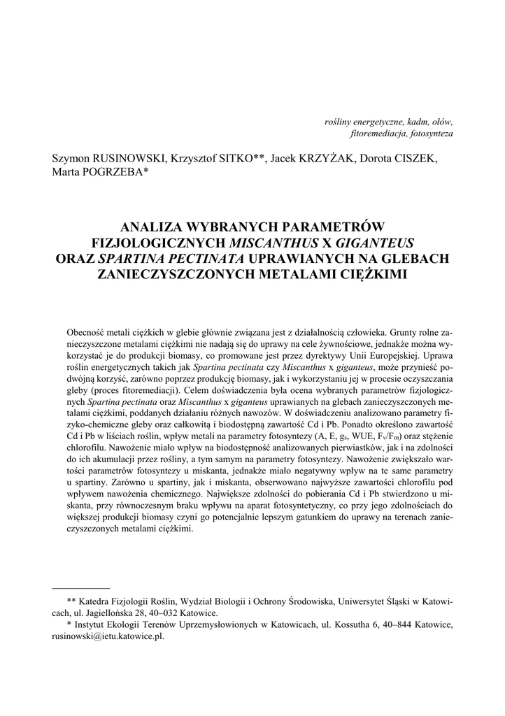 rośliny energetyczne, kadm, ołów, fitoremediacja, fotosynteza Szymon RUSINOWSKI, Krzysztof SITKO**, Jacek KRZYŻAK, Dorota CISZEK, Marta POGRZEBA* ANALIZA WYBRANYCH PARAMETRÓW FIZJOLOGICZNYCH MISCANTHUS X GIGANTEUS ORAZ SPARTINA PECTINATA UPRAWIANYCH NA GLEBACH ZANIECZYSZCZONYCH METALAMI CIĘŻKIMI Obecność metali ciężkich w glebie głównie związana jest z działalnością człowieka. Grunty rolne zanieczyszczone metalami ciężkimi nie nadają się do uprawy na cele żywnościowe, jednakże można wykorzystać je do produkcji biomasy, co promowane jest przez dyrektywy Unii Europejskiej. Uprawa roślin energetycznych takich jak Spartina pectinata czy Miscanthus x giganteus, może przynieść podwójną korzyść, zarówno poprzez produkcję biomasy, jak i wykorzystaniu jej w procesie oczyszczania gleby (proces fitoremediacji). Celem doświadczenia była ocena wybranych parametrów fizjologicznych Spartina pectinata oraz Miscanthus x giganteus uprawianych na glebach zanieczyszczonych metalami ciężkimi, poddanych działaniu różnych nawozów. W doświadczeniu analizowano parametry fizyko-chemiczne gleby oraz całkowitą i biodostępną zawartość Cd i Pb. Ponadto określono zawartość Cd i Pb w liściach roślin, wpływ metali na parametry fotosyntezy (A, E, gs, WUE, Fv/Fm) oraz stężenie chlorofilu. Nawożenie miało wpływ na biodostępność analizowanych pierwiastków, jak i na zdolności do ich akumulacji przez rośliny, a tym samym na parametry fotosyntezy. Nawożenie zwiększało wartości parametrów fotosyntezy u miskanta, jednakże miało negatywny wpływ na te same parametry u spartiny. Zarówno u spartiny, jak i miskanta, obserwowano najwyższe zawartości chlorofilu pod wpływem nawożenia chemicznego. Największe zdolności do pobierania Cd i Pb stwierdzono u miskanta, przy równoczesnym braku wpływu na aparat fotosyntetyczny, co przy jego zdolnościach do większej produkcji biomasy czyni go potencjalnie lepszym gatunkiem do uprawy na terenach zanieczyszczonych metalami ciężkimi. __________ ** Katedra Fizjologii Roślin, Wydział Biologii i Ochrony Środowiska, Uniwersytet Śląski w Katowicach, ul. Jagiellońska 28, 40–032 Katowice. * Instytut Ekologii Terenów Uprzemysłowionych w Katowicach, ul. Kossutha 6, 40–844 Katowice, [email protected]. Analiza wybranych parametrów fizjologicznych Miscanthus x giganteus oraz Spartina… 1. 183 WSTĘP Gleba jest środowiskiem, które może być zanieczyszczone wieloma różnym związkami lub/i toksycznymi pierwiastkami. Zanieczyszczenia te mogą mieć pochodzenie antropogeniczne (huty, kopalnie, pestycydy, rafinerie) lub środowiskowe (erupcje wulkaniczne) [2]. Zanieczyszczenia w glebie stanowią poważny problem, ponieważ pośrednio mogą być szkodliwe dla człowieka wpływając na jakość i ilość produktów rolniczych [24]. Biomasa jest to materia organiczna pochodzenia roślinnego (drzewa, rośliny jednoroczne, rośliny wieloletnie, glony) powstała w wyniku fotosyntezy na drodze konwersji CO2, wody oraz energii słonecznej w węglowodany, które są głównym składnikiem budującym strukturę tkanek roślinnych [21]. W dobie pogłębiającego się kryzysu klimatycznego i wyczerpywania paliw kopalnianych, wdrażanie każdej technologii, umożliwiającej produkcję czystej energii jest pożądane. Ograniczenie wykorzystania paliw kopalnych na rzecz biomasy, jest jedną z możliwości przeciwstawiania się globalnemu ociepleniu. Dyrektywa Unii Europejskiej (2009/28/EC) odnosząca się do odnawialnych źródeł energii (RES) dotyczy promowania strategii proekologicznych wśród państw członkowskich [11]. Państwa te zobowiązane są do zwiększania udziału źródeł odnawialnych w gospodarce energetycznej do 20% z końcem 2020 roku. Dyrektywa ta ponadto zawiera informację na temat kategorii terenów, na których produkcja biomasy jest niewskazana - należą do niej głównie tereny bardzo żyzne oraz charakteryzujące się dużą bioróżnorodnością. Tym samym dyrektywa ta pośrednio zaleca uprawę roślin energetycznych na zanieczyszczonych glebach rolniczych oraz gruntach marginalnych niskiej klasy [27]. Uprawa roślin energetycznych na glebach zanieczyszczonych metalami ciężkimi, poza zagospodarowaniem gruntów nienadających się do produkcji rolnej, może również poprzez naturalne ich zdolności do pobierania metali ciężkich przyczyniać się do oczyszczania gleb (proces fitoremediacji) [31]. Fitoremediacja gleb skażonych metalami ciężkimi może przebiegać w dwojaki sposób, zależnie od rodzaju zanieczyszczeń oraz uprawianego gatunku rośliny. Rośliny mogą stabilizować metale ciężkie w obrębie korzeni, tym samym ograniczając ich migrację w głąb struktury gleby, równocześnie chroniąc ją przed erozją. Alternatywnie rośliny mogą być zdolne do ekstrakcji metali ciężkich z gleby, co może być związane z poprawą jej jakości [26]. Rośliny energetyczne nie są hiperakumulatorami, jednakże dzięki swoim naturalnym zdolnościom do produkcji dużych ilości biomasy mogą całościowo ekstrahować większe ilości zanieczyszczeń [22]. Miscanthus x giganteus to wieloletnia trawa rozmnażająca się poprzez kłącza, zdolna do przeprowadzania fotosyntezy typu C4. Miskant olbrzymi jest triploidalną sterylną hybrydą diploidalnego Miscanthus sinennsis oraz tetraploidalnego Miscanthus sacchariflorus pochodzących z Japonii [34]. Należy do roślin energetycznych drugiej 184 S. RUSINOWSKI i in. generacji co oznacza, że plon nie jest wykorzystywany wyłącznie do produkcji bioetanolu i z powodzeniem po wysuszeniu może być wykorzystywany w elektrowniach i elektrociepłowniach jako paliwo. Miskant poza zdolnością do produkcji dużych ilości biomasy posiada jeszcze inne zalety - zdolność do transportu związków mineralnych do kłącza przed zimowaniem, wysoki współczynnik wykorzystania wody, a ponadto jego plon charakteryzuje się bardzo wysoką kalorycznością [