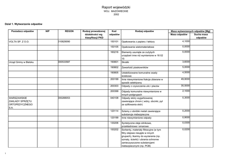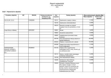 Raport wojewódzki WOJ. MAZOWIECKIE 2002 Dział 1. Wytwarzanie odpadów Posiadacz odpadów VOLTA SP. Z O.O. Urząd Gminy w Bielsku NIP REGON 010829090 000533587 Rodzaj prowadzonej działalności wg. klasyfikacji PKD Kod odpadów Opakowania z papieru i tektury 4,1000 150105 Opakowania wielomateriałowe 0,0000 160216 0,0000 190801 Elementy usunięte ze zużytych urządzeń inne niż wymienione w 16 02 15 Skratki 190802 Zawartość piaskowników 5,0000 190805 Ustabilizowane komunalne osady ściekowe Inne niewymienione frakcje zbierane w sposób selektywny Odpady z czyszczenia ulic i placów 4,5000 200303 200399 000288053 040108 120114 120199 130206 150202 1 Masa wytworzonych odpadów [Mg] Masa odpadów Sucha masa odpadów 150101 200199 WARSZAWSKIE ZAKŁADY SPRZĘTU ORTOPEDYCZNEGO S.A. Rodzaj odpadów 3,6000 49,9000 35,5000 Odpady komunalne niewymienione w innych podgrupach Odpady skóry wygarbowanej zawierające chrom ( wióry, obcinki, pył ze szlifowania skór) 2,1000 Szlamy z obróbki metali zawierające substancje niebezpieczne Inne niewymienione odpady 0,2000 Syntetyczne oleje silnikowe, przekładniowe i smarowe Sorbenty, materiały filtracyjne (w tym filtry olejowe nieujęte w innych grupach), tkaniny do wycierania (np. szmaty, ścierki) i ubrania ochronne zanieczyszczone substancjami niebezpiecznymi (np. PCB) 0,0300 0,3000 0,9000 0,0200 0,0340 170401 Zużyte urządzenia zawierające niebezpieczne elementy inne niż wymienione w 16 02 09 do 16 02 12 Miedź, brąz, mosiądz 170402 Aluminium 0,4000 170405 Żelazo i stal 170605 Materiały konstrukcyjne zawierające azbest Papier i tektura 0,1120 080112 Odpady farb i lakierów inne niż wymienione w 08 01 11 0,0000 120101 080199 Odpady z toczenia i piłowania żelaza oraz jego stopów Sorbenty, materiały filtracyjne, tkaniny do wycierania (np. szmaty, ścierki) i ubrania ochronne inne niż wymienione w 15 02 02 Inne niewymienione odpady 150102 Opakowania z tworzyw sztucznych 1,2000 150110 Opakowania zawierające pozostałości substancji niebezpiecznych lub nimi zanieczyszczone (np. środkami ochrony roślin I i II klasy toksyczności - bardzo toksyczne i toksyczne) Zużyte katalizatory zawierające złoto, srebro, ren, rod, pallad, iryd lub platynę (z wyłączeniem 16 08 07) Uwodnione odpady ciekłe zawierające substancje niebezpieczne Tworzywa sztuczne 1,0500 Niesegregowane (zmieszane) odpady komunalne Narzędzia chirurgiczne i zabiegowe oraz ich resztki (z wyłączeniem 18 01 03) 2,2000 160213 200101 Gramet sport Sp. z o.o. Zakład produkcyjny 012747681 150203 TAL SP Z O.O. 008047159 160801 161001 170203 200301 Indywidualna Specjalistyczna Praktyka Lekarska Tytus Brągoszewski 2 710091510 180101 1,3000 13,7000 1,3000 20,0000 0,7000 200,0000 0,7000 1,8200 1,0000 0,0000 180103 PW "RAPIMEX" PIOTR CHODYRA DELITISSUE SP Z O.O. 670895765 016163215 150101 150102 Opakowania z tworzyw sztucznych 22,7000 170904 69,7000 200101 Zmieszane odpady z budowy, remontów i demontażu inne niż wymienione w 17 09 01, 17 09 02, 17 09 03 Papier i tektura 200139 Tworzywa sztuczne 5,6000 200201 Odpady ulegające biodegradacji 0,1000 200301 Niesegregowane (zmieszane) odpady komunalne Inne odpady, które zawierają żywe drobnoustroje chorobotwórcze lub ich toksyny oraz inne formy zdolne do przeniesienia materiału genetycznego, o których wiadomo lub co do których istnieją wiarygodne podstawy do sądzenia, że wywołują choroby u ludzi i zwi Mineralne oleje silnikowe, przekładniowe i smarowe niezawierające związków chlorowcoorganicznych Inne oleje silnikowe, przekładniowe i smarowe Szlamy z odwadniania olejów w separatorach Zaolejona woda z odwadniania olejów w separatorach 120103 DE21.22.Z 080314 NZOZ "ANNA - LAB" PRACOWNIA ANALIZ LEKARSKICH 006923651 180103 SHELL AUTOSERV POLSKA Sp. z .o.o. 191914714 130205 130208 130502 130507 3 0,0120 Inne odpady, które zawierają żywe drobnoustroje chorobotwórcze lub ich toksyny oraz inne formy zdolne do przeniesienia materiału genetycznego, o których wiadomo lub co do których istnieją wiarygodne podstawy do sądzenia, że wywołują choroby u ludzi i zwi Odpady z toczenia i piłowania metali nieżelaznych Szlamy farb drukarskich zawierające substancje niebezpieczne Opakowania z papieru i tektury 0,0000 110,0000 138,9000 722,6000 49,2000 0,1570 5,1800 4,6800 1,4130 4,0820 130508 4 160103 160107 Filtry olejowe 0,8990 160113 Płyny hamulcowe 0,0200 160114 0,0250 160117 Płyny zapobiegające zamarzaniu zawierające niebezpieczne substancje Metale żelazne 160601 Baterie i akumulatory ołowiowe 1,2720 Inne odpady, które zawierają żywe drobnoustroje chorobotwórcze lub ich toksyny oraz inne formy zdolne do przeniesienia materiału genetycznego, o których wiadomo lub co do których istnieją wiarygodne podstawy do sądzenia, że wywołują choroby u ludzi i zwi Inne odpady, które zawierają żywe drobnoustroje chorobotwórcze lub ich toksyny oraz inne formy zdolne do przeniesienia materiału genetycznego, o których wiadomo lub co do których istnieją wiarygodne podstawy do sądzenia, że wywołują choroby u ludzi i zwi Inne odpady, które zawierają żywe drobnoustroje chorobotwórcze lub ich toksyny oraz inne formy zdolne do przeniesienia materiału genetycznego, o których wiadomo lub co do których istnieją wiarygodne podstawy do sądzenia, że wywołują choroby u ludzi i zwi Osady zawierające chrom, zwłaszcza z zakładowych oczyszczalni ścieków 0,0180 PRACOWNIA DIAGNOSTYKI MEDYCZNEJ lek.med. Sylwester Oniszk 710248756 180103 PRYWATNY GABINET STOMATOLOGICZNY 710458040 180103 NZOP NR 793 Fundacja Hospicjum Onkologiczne 001411060 180103 WODOCIĄGI MIEJSKIE W RADOMIU SP. Z O.O. 670110416 E40.30.A 0,9000 Mieszanina odpadów z piaskowników i z odwadniania olejów w separatorach Zużyte opony 040106 040199 Inne niewymienione odpady 100101 Żużle, popioły paleniskowe i pyły z kotłów (z wyłączeniem pyłów z kotłów wymienionych w 10 01 04) 29,6000 1,2000 0,0380 0,9270 172,2000 0,1000 18,