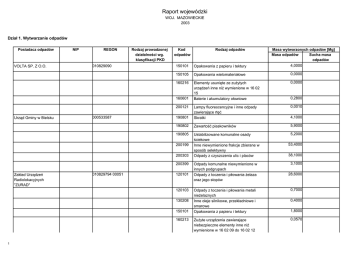 Raport wojewódzki WOJ. MAZOWIECKIE 2003 Dział 1. Wytwarzanie odpadów Posiadacz odpadów VOLTA SP. Z O.O. NIP REGON 010829090 Rodzaj prowadzonej działalności wg. klasyfikacji PKD Kod odpadów Opakowania z papieru i tektury 4,0000 150105 Opakowania wielomateriałowe 0,0000 160216 Elementy usunięte ze zużytych urządzeń inne niż wymienione w 16 02 15 Baterie i akumulatory ołowiowe 0,0000 0,0010 190801 Lampy fluorescencyjne i inne odpady zawierające rtęć Skratki 190802 Zawartość piaskowników 5,9000 190805 Ustabilizowane komunalne osady ściekowe Inne niewymienione frakcje zbierane w sposób selektywny Odpady z czyszczenia ulic i placów 5,2000 200121 000533587 200199 200303 200399 Zakład Urządzeń Radiolokacyjnych "ZURAD" 010829794 00051 120101 120103 130208 150101 160213 1 Masa wytworzonych odpadów [Mg] Masa odpadów Sucha masa odpadów 150101 160601 Urząd Gminy w Bielsku Rodzaj odpadów Odpady komunalne niewymienione w innych podgrupach Odpady z toczenia i piłowania żelaza oraz jego stopów 0,2800 4,1000 53,4000 38,1000 3,1000 28,6000 Odpady z toczenia i piłowania metali nieżelaznych Inne oleje silnikowe, przekładniowe i smarowe Opakowania z papieru i tektury 0,7000 Zużyte urządzenia zawierające niebezpieczne elementy inne niż wymienione w 16 02 09 do 16 02 12 0,0570 0,4000 1,8000 RAIFFEISEN AGRARCENTRUM-PO LSKA Sp. z o.o. WARSZAWSKIE ZAKŁADY SPRZĘTU ORTOPEDYCZNEGO S.A. 012279518 020101 Osady z mycia i czyszczenia 7,6000 000288053 040108 Odpady skóry wygarbowanej zawierające chrom ( wióry, obcinki, pył ze szlifowania skór) 0,1000 120114 Szlamy z obróbki metali zawierające substancje niebezpieczne Syntetyczne oleje silnikowe, przekładniowe i smarowe Opakowania wielomateriałowe 0,0500 0,1000 170401 Sorbenty, materiały filtracyjne (w tym filtry olejowe nieujęte w innych grupach), tkaniny do wycierania (np. szmaty, ścierki) i ubrania ochronne zanieczyszczone substancjami niebezpiecznymi (np. PCB) Niebezpieczne elementy lub części składowe usunięte ze zużytych urządzeń Miedź, brąz, mosiądz 170402 Aluminium 0,4000 170405 Żelazo i stal 200101 Papier i tektura 200301 Niesegregowane (zmieszane) odpady komunalne Odpady farb i lakierów inne niż wymienione w 08 01 11 30,7000 Odpady z toczenia i piłowania żelaza oraz jego stopów Sorbenty, materiały filtracyjne, tkaniny do wycierania (np. szmaty, ścierki) i ubrania ochronne inne niż wymienione w 15 02 02 Skratki 20,0000 Ustabilizowane komunalne osady ściekowe 58,8000 130206 150105 150202 160215 Gramet sport Sp. z o.o. Zakład produkcyjny 012747681 080112 120101 150203 URZĄD GMINY POMIECHÓWEK 000546590 190801 190805 2 0,1800 0,0000 0,0060 0,0000 10,3000 1,0000 0,0000 0,7000 4,9000 Niesegregowane (zmieszane) odpady komunalne Narzędzia chirurgiczne i zabiegowe oraz ich resztki (z wyłączeniem 18 01 03) 1,7000 0,0160 030399 Inne odpady, które zawierają żywe drobnoustroje chorobotwórcze lub ich toksyny oraz inne formy zdolne do przeniesienia materiału genetycznego, o których wiadomo lub co do których istnieją wiarygodne podstawy do sądzenia, że wywołują choroby u ludzi i zwi Odpady z sortowania papieru i tektury przeznaczone do recyklingu Osady z zakładowych oczyszczalni ścieków inne niż wymienione w 03 03 10 Inne niewymienione odpady 070213 Odpady tworzyw sztucznych 080116 150101 Szlamy wodne zawierające farby i lakiery inne niż wymienione w 08 01 15 Opakowania z papieru i tektury 150102 Opakowania z tworzyw sztucznych 150104 Opakowania z metali 1,2000 150110 Opakowania zawierające pozostałości substancji niebezpiecznych lub nimi zanieczyszczone (np. środkami ochrony roślin I i II klasy toksyczności - bardzo toksyczne i toksyczne) Zmieszane odpady z budowy, remontów i demontażu inne niż wymienione w 17 09 01, 17 09 02, 17 09 03 Niesegregowane (zmieszane) odpady komunalne 0,0220 200301 Indywidualna Specjalistyczna Praktyka Lekarska Tytus Brągoszewski 710091510 180101 180103 DELITISSUE SP Z O.O. 016163215 DE21.22.Z 030308 030311 170904 200301 3 0,0000 898,9000 33,3000 15,2000 30,7000 203,5000 130,1000 84,5000 24,1000 144,7000 NZOZ "ANNA - LAB" PRACOWNIA ANALIZ LEKARSKICH 006923651 180103 SHELL AUTOSERV POLSKA Sp. z .o.o. 191914714 130205 160103 160107 Filtry olejowe 0,8800 160601 Baterie i akumulatory ołowiowe 1,5850 020401 Osady z oczyszczania i mycia buraków 020402 020480 Nienormatywny węglan wapnia oraz kreda cukrownicza (wapno defekacyjne) Wysłodki 020499 Inne niewymienione odpady 4 332,0000 100180 2 058,0000 170407 Mieszanki popiołowo - żużlowe z mokrego odprowadzania odpadów paleniskowych Mineralne oleje silnikowe, przekładniowe i smarowe niezawierające związków chlorowcoorganicznych Mieszaniny metali 190801 Skratki 130208 Krajowa Spółaka Cukrowa S.A. w Toruniu "Cukrownia Mała Wieś" 870363980 00061 130205 4 0,1640 Inne odpady, które zawierają żywe drobnoustroje chorobotwórcze lub ich toksyny oraz inne formy zdolne do przeniesienia materiału genetycznego, o których wiadomo lub co do których istnieją wiarygodne podstawy do sądzenia, że wywołują choroby u ludzi i zwi Mineralne oleje silnikowe, przekładniowe i smarowe niezawierające związków chlorowcoorganicznych Inne oleje silnikowe, przekładniowe i smarowe Zużyte opony 4,3450 5,8000 23,9000 13 000,0000 8 143,0000 66 278,0000 2,8000 97,7000 2,5000 PRACOWNIA DIAGNOSTYKI MEDYCZNEJ lek.med. Sylwester Oniszk 710248756 180103 PRYWATNY GABINET STOMATOLOGICZNY 710458040 180103 NZOP NR 793 Fundacja Hospicjum Onkologiczne 001411060 180103 WODOCIĄGI MIEJSKIE W RADOMIU SP. Z O.O. 670110416 E40.30.A 040106 040199 Inne niewymienione odpady 100101 Żużle, popioły paleniskowe i pyły z kotłów (z wyłączeniem pyłów z kotłów wymienionych w 10 01 04) Odpady z toczenia i piłowania żelaza oraz jego stopów Mineralne oleje hydrauliczne niezawierające związków chlorowcoorganicznych Mineralne oleje silnikowe, przekładniowe i smarowe niezawierające związków chlorowcoorganicznych Synte