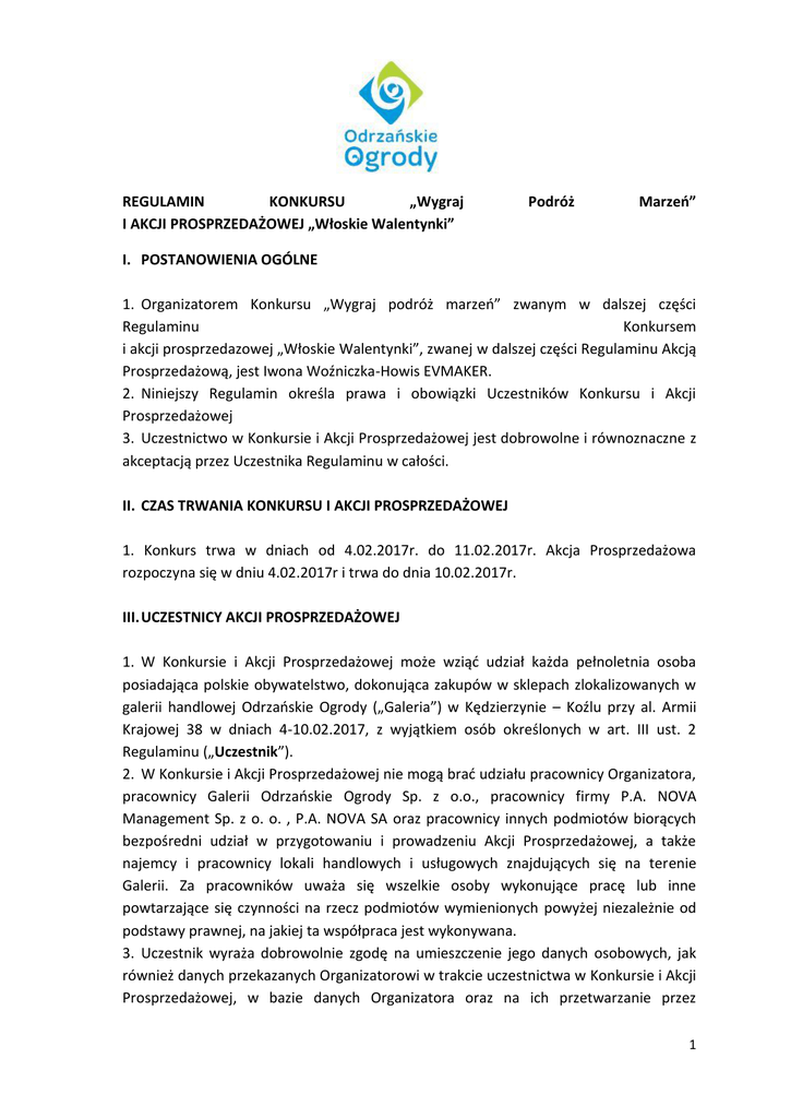 REGULAMIN KONKURSU „Wygraj I AKCJI PROSPRZEDAŻOWEJ „Włoskie Walentynki” Podróż Marzeń” I. POSTANOWIENIA OGÓLNE 1. Organizatorem Konkursu „Wygraj podróż marzeń” zwanym w dalszej części Regulaminu Konkursem i akcji prosprzedazowej „Włoskie Walentynki”, zwanej w dalszej części Regulaminu Akcją Prosprzedażową, jest Iwona Woźniczka-Howis EVMAKER. 2. Niniejszy Regulamin określa prawa i obowiązki Uczestników Konkursu i Akcji Prosprzedażowej 3. Uczestnictwo w Konkursie i Akcji Prosprzedażowej jest dobrowolne i równoznaczne z akceptacją przez Uczestnika Regulaminu w całości. II. CZAS TRWANIA KONKURSU I AKCJI PROSPRZEDAŻOWEJ 1. Konkurs trwa w dniach od 4.02.2017r. do 11.02.2017r. Akcja Prosprzedażowa rozpoczyna się w dniu 4.02.2017r i trwa do dnia 10.02.2017r. III. UCZESTNICY AKCJI PROSPRZEDAŻOWEJ 1. W Konkursie i Akcji Prosprzedażowej może wziąć udział każda pełnoletnia osoba posiadająca polskie obywatelstwo, dokonująca zakupów w sklepach zlokalizowanych w galerii handlowej Odrzańskie Ogrody („Galeria”) w Kędzierzynie – Koźlu przy al. Armii Krajowej 38 w dniach 4-10.02.2017, z wyjątkiem osób określonych w art. III ust. 2 Regulaminu („Uczestnik”). 2. W Konkursie i Akcji Prosprzedażowej nie mogą brać udziału pracownicy Organizatora, pracownicy Galerii Odrzańskie Ogrody Sp. z o.o., pracownicy firmy P.A. NOVA Management Sp. z o. o. , P.A. NOVA SA oraz pracownicy innych podmiotów biorących bezpośredni udział w przygotowaniu i prowadzeniu Akcji Prosprzedażowej, a także najemcy i pracownicy lokali handlowych i usługowych znajdujących się na terenie Galerii. Za pracowników uważa się wszelkie osoby wykonujące pracę lub inne powtarzające się czynności na rzecz podmiotów wymienionych powyżej niezależnie od podstawy prawnej, na jakiej ta współpraca jest wykonywana. 3. Uczestnik wyraża dobrowolnie zgodę na umieszczenie jego danych osobowych, jak również danych przekazanych Organizatorowi w trakcie uczestnictwa w Konkursie i Akcji Prosprzedażowej, w bazie danych Organizatora oraz na ich przetwarzanie przez 1 Organizatora dla celów przeprowadzenia Konkursu i Akcji Prosprzedażowej, zgodnie z Ustawą z dnia 29 sierpnia 1997 r. o ochronie danych osobowych w celach marketingowych. Administratorem danych osobowych zebranych podczas niniejszego Konkursu i Akcji Prosprzedażowej jest – w rozumieniu wspomnianej wyżej ustawy – Organizator. Uczestnik ma prawo wglądu do swoich danych osobowych oraz ich poprawiania. Uczestnik ma również prawo do żądania usunięcia danych, przy czym żądanie takie zgłoszone przed zakończeniem Konkursu i Akcji Prosprzedażowej jest jednoznaczne z rezygnacją z udziału w Konkursie i Akcji Prosprzedażowej. 4. Podanie danych osobowych przez Uczestnika jest dobrowolne, ale odmowa podania danych osobowych uniemożliwia wzięcie udziału w Konkursie i Akcji Prosprzedażowej. Za dane osobowe Organizator przyjmuje: imię, nazwisko, miejsce zamieszkania (miasto), nr telefonu oraz adres e-mail (nieobowiązkowe). IV. ZASADY I PRZEBIEG AKCJI PROSPRZEDAŻOWEJ I KONKURSU 1. Aby wziąć udział w Konkursie i Akcji Prosprzedażowej należy dokonać w dniach 410.02.2017r na terenie Galerii zakupów za min. 50 zł, udokumentowanych paragonem. Na podstawie tych samych paragonów Uczestnicy mogą wziąć udział zarówno w Konkursie, jak w Akcji Prosprzedażowej. 2. Przez dokonanie zakupu rozumie się zakup towarów lub usług dokonany w formie płatności gotówką lub kartą płatniczą wydaną przez bank. W akcji pro-sprzedażowej i Konkursie mogą brać udział tylko paragony dokumentujące zakup dokonany gotówką lub kartą płatniczą wydaną przez bank. W Konkursie i Akcji Prosprzedażowej nie mogą brać udziału paragony dokumentujące zakup dokonany kartą podarunkową lub bonem podarunkowym, pochodzące z marketu Biedronka, a także paragony dokumentujące zakup produktów alkoholowych lub tytoniowych oraz paragon/potwierdzenia skorzystania z usług bankomatu lub kantoru. 3. Paragony podlegają zgłoszeniu w wyznaczonym na terenie Galerii Punkcie Konkursowym („Punkt”), który czynny jest w terminie 4.02.2017r w godzinach 10.0021.00, 5.02.2017r., w godzinach 10.00-20.00, w dniach 6 – 10.02.2017r. w godzinach 10:00 – 21:00. Punkt zlokalizowany jest na pasażu obok wejścia głównego do Galerii. Przedstawione przez Uczestników paragony zostaną opieczętowane. 4. Akcja Prosprzedażowa: a. Każdy z uczestników powinien zrobić zakupy w dniach od 4-10.02.2017r na terenie Galerii Odrzańskie Ogrody o minimalnej wartości 50,00 zł (na jednym paragonie), z zastrzeżeniem art. IV ust. 2 Regulaminu. 2 b. Celem odbioru upominku Uczestnik powinien zgłosić się do punktu obsługi akcji Prosprzedażowej w godzinach jej funkcjonowania, czyli od poniedziałku do soboty w godzinach od 10.00-21.00 oraz w niedzielę w godzinach od 10.00-20.00. c. Podstawą wzięcia udziału w akcji Prosprzedażowej jest okazanie paragonu hostessie w punkcie obsługi Akcji Prosprzedażowej o minimalnej wartości 50,00zł. Paragon na kwotę minimum 50 zł uprawnia do otrzymania jednego upominku – bombonierki o wartości 6,12 zł netto. Paragon na kwotę minimum 150 zł uprawnia do otrzymania jednego upominku – biletu do Kina Helios, o wartości 24 zł brutto. Paragony nie podlegają sumowaniu. d. Hostessa przy wydawaniu kuponów spisuje numer paragonu, sklep oraz kwotę, na którą zostały zrobione zakupy oraz przekazuje Uczestnikom wypełniony formularz, który muszą podpisać. Hostessa ma również obowiązek oznaczyć paragony jako wykorzystane. e. Liczba upominków w akcji pro-sprzedażowej jest ograniczona. f. Organizator zastrzega, iż akcja pro-sprzedażowa może zakończyć się wcześniej, po wcześniejszym wykorzystaniu limitu gwarantowanych upominków. 5. Konkurs „Wygraj wycieczkę marzeń”: a) b) c) d) I ETAP KONKURSU Aby wziąć udział w Konkursie należy dokonać w dniach 4-10.0
