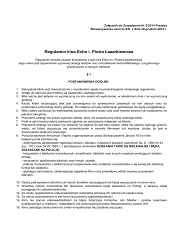 Załącznik do Zarządzenia Nr 3/2014 Prezesa Stowarzyszenia Jarocin XXI z dnia 20 grudnia 2014 r. Regulamin kina Echo i. Piotra Łazarkiewicza Regulamin określa zasady korzystania z sali kina Echo im. Piotra Łazarkiewicza Jego celem jest zapewnienie sprawnej obsługi widzów oraz umożliwienie bezkonfliktowego i przyjemnego przebywania w naszym obiekcie. §1 POSTANOWIENIA OGÓLNE: 1. Zakupienie biletu jest równoznaczne z wyrażeniem zgody na przestrzeganie niniejszego regulaminu. 2. Wstęp do sali kina jest możliwy za okazaniem ważnego biletu. 3. Bilet ważny jest jedynie na wyznaczony na nim seans lub wydarzenie, w określonym dniu i na wyznaczoną godzinę. 4. Każdy klient otrzymujący bilet jest zobowiązany do sprawdzenia zawartych na nim danych oraz do przeliczenia otrzymanej reszty gotówki. Po odejściu od kasy reklamacje gotówkowe nie będą uwzględniane. 5. Bilet należy zachować do ewentualnej ponownej kontroli przez cały czas trwania seansu lub wydarzenia, na jaki jest zakupiony. 6. Pracownik obsługi ma prawo wyprosić klienta, który nie posiada przy sobie ważnego biletu. 7. Fotel w sali kinowej należy zajmować zgodnie ze wskazanym miejscem na bilecie. 8. Pracownik obsługi ma prawo nie zezwolić na wejście do sali kina osobie, która nie spełnia wymogu granicy wieku, od której dopuszcza się uczestniczenie w seansie filmowym lub imprezie, chyba, że jest w towarzystwie opiekuna prawnego. 9. Podczas seansów filmowych i imprez organizowanych przez Stowarzyszenie Jarocin XXI w kinie kategorycznie zabrania się: - dokonywania jakiejkolwiek rejestracji obrazu i dźwięku. (Ustawa o prawach autorskich Dz. U. 1994 Nr 43 poz. 170 z dnia 04.02.1994 r. z późniejszymi zmianami) DZIAŁANIA TAKIE SĄ NIELEGALNE I BĘDĄ ZGŁASZANE NA POLICJĘ, - korzystania z telefonów komórkowych, smartfonów, tabletów oraz innych urządzeń emitujących światło i dźwięk, - wnoszenia i spożywania alkoholu oraz innych używek, - palenia i korzystania z elektronicznych papierosów oraz urządzeń i przedmiotów o tej samej lub zbliżonej funkcji lub działaniu, - głośnego zachowania, zakłócającego oglądanie filmu oraz prawidłowy odbiór imprezy pozostałym klientom. 10. Osoby pod wpływem alkoholu lub innych środków odurzających nie będą wpuszczane na teren kina. 11. Wszelkie celowe zniszczenia lub dokonane uszkodzenia będą zgłaszane na Policję, a sprawcy będą pociągnięci do odpowiedzialności. 12. Za osoby niepełnoletnie odpowiedzialność materialną ponoszą ich rodzice lub opiekunowie. 13. Za rzeczy pozostawione w sali kina nie ponosimy odpowiedzialności. 14. Kino nie ponosi odpowiedzialności za błędy dotyczące terminów, cen biletów i opisów repertuaru publikowanych w mediach i materiałach, nie wykonywanych przez Stowarzyszenia Jarocin XXI . 15. Kino zastrzega sobie prawo do zmian w repertuarze bez podania przyczyny. §2 POSTANOWIENIA SZCZEGÓŁOWE: 1. Informacje o seansach filmowych i wydarzeniach oraz sposobie zakupu biletów można uzyskać na naszej stronie internetowej: www.kino.jarocin.pl lub pod numerem telefonu 62 747 11 19 lub osobiście w kasie kina. 2. Kasa kina czynna jest i sprzedaż biletów na projekcje filmowe, odbywa się na pół godziny przed pierwszym, zaplanowanym w danym dniu, seansem filmowym. 3. W kasie kina istnieje możliwość zakupu biletu i płatności gotówką lub kartą. 4. Płatności kartą można dokonać za całość transakcji, nie ma możliwości częściowej zapłaty kartą za zakupione bilety. 5. Kasjer może odmówić sprzedaży biletu wstępu w następujących, szczególnych przypadkach: - wykonanie usługi nie jest możliwe, pomimo wcześniejszej deklaracji repertuarowej, poprzez brak wszystkich koniecznych elementów do jej wykonania, z przyczyn leżących po stronie dystrybutora. - w przypadku, gdy klient jest w stanie nietrzeźwym, pod wpływem środków odurzających, posiada przy sobie przedmioty niebezpieczne lub swoim zachowaniem zagraża bezpieczeństwu pozostałych widzów, - osobie, która nie spełnia wymogu granicy wieku, od której dopuszcza się uczestniczenie w seansie filmowym lub imprezie, chyba, że jest w towarzystwie opiekuna prawnego, - wystąpienia sił i zdarzeń losowych niezależnych od Stowarzyszenia Jarocin XXI 6. Zwrot pieniędzy za bilety zakupione za gotówkę, możliwy jest tylko w przypadkach: - braku zasilania w energię elektryczną, - awarii sprzętu projekcyjnego, - innej usterki technicznej, której nie można było wcześniej przewidzieć, następujących w trakcie seansu. 7. Zwrot kosztów zakupu w przypadku dokonania płatności kartą lub przelewem, w sytuacjach określonych w pkt. 9, nastąpi drogą zwrotną analogicznie do sposobu płatności po przedstawieniu dowodu potwierdzającego płatność w terminie nie przekraczającym 7 dni kalendarzowych. 8. Kasjer ma prawo odmówić przyjęcia zwrotu zakupionych biletów wstępu oraz dokonania wypłaty kwoty należnej za bilety w następujących przypadkach: - jeśli zaistnieją przyczyny formalne (np. brak paragonu, potwierdzenia transakcji z terminala, potwierdzenia dokonania płatności przelewem oraz ważnego biletu wstępu), - jeśli zwracany bilet, paragon lub potwierdzenie transakcji z terminala jest wyraźnie uszkodzone, zniszczone i nieczytelne, - klient chce zwrócić bilet po rozpoczęciu seansu filmowego lub imprezy z powodów nieleżących po stronie Stowarzyszenia Jarocin XXI 9. Zwrot pieniędzy za bilet zakupiony gotówką w przypadku rezygnacji klienta z seansu możliwy jest pod warunkiem, że klient zgłosi rezygnację najpóźniej w godzinie rozpoczęcia seansu, po przedstawieniu biletu i dowodu zakupu, z uwzględnieniem okoliczności, o których mowa w pkt. 11. 10. Zwrot kosztów zakupu biletów dokonanych za pomocą karty lub przelewu, w przypadku rezygnacji klienta z seansu możliwy jest pod warunkiem, że klient zgłosi rezygnację najpóźniej w godzinie rozpoczęcia seansu, po przedstawieni