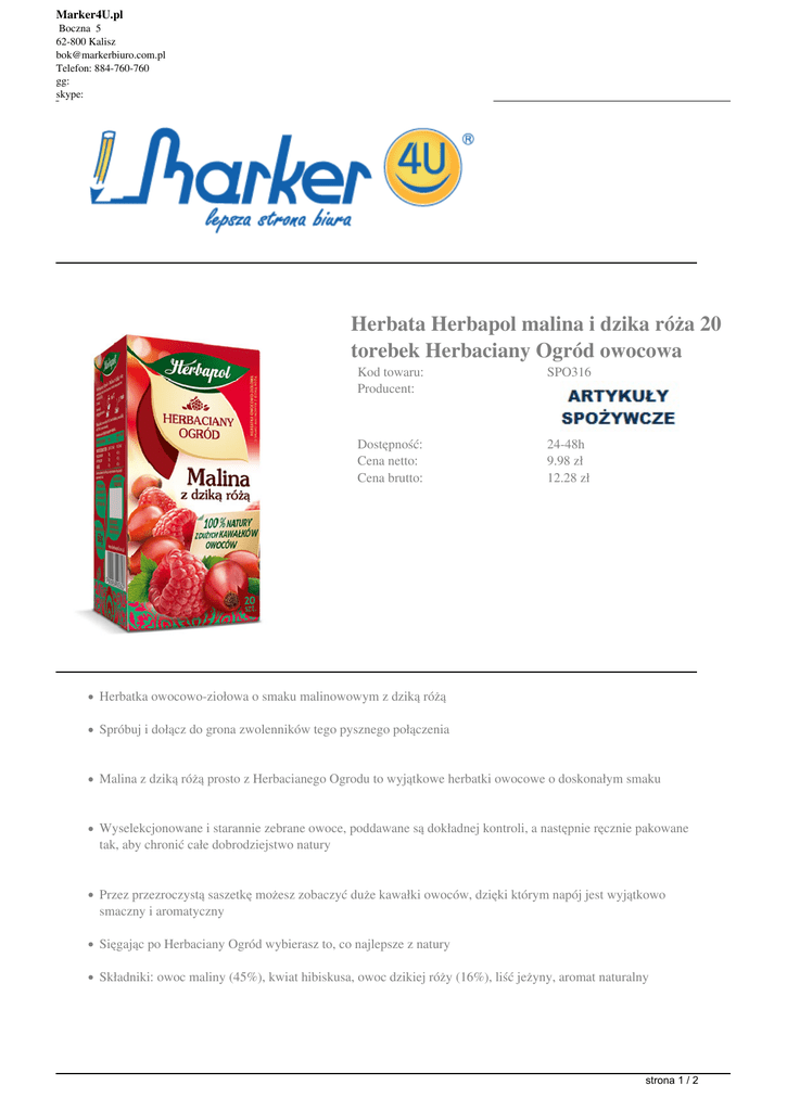 Marker4U.pl Boczna 5 62-800 Kalisz [email protected] Telefon: 884-760-760 gg: skype: Herbata Herbapol malina i dzika róża 20 torebek Herbaciany Ogród owocowa Kod towaru: Producent: SPO316 Dostępność: Cena netto: Cena brutto: 24-48h 9.98 zł 12.28 zł Herbatka owocowo-ziołowa o smaku malinowowym z dziką różą Spróbuj i dołącz do grona zwolenników tego pysznego połączenia Malina z dziką różą prosto z Herbacianego Ogrodu to wyjątkowe herbatki owocowe o doskonałym smaku Wyselekcjonowane i starannie zebrane owoce, poddawane są dokładnej kontroli, a następnie ręcznie pakowane tak, aby chronić całe dobrodziejstwo natury Przez przezroczystą saszetkę możesz zobaczyć duże kawałki owoców, dzięki którym napój jest wyjątkowo smaczny i aromatyczny Sięgając po Herbaciany Ogród wybierasz to, co najlepsze z natury Składniki: owoc maliny (45%), kwiat hibiskusa, owoc dzikiej róży (16%), liść jeżyny, aromat naturalny strona 1 / 2 Marker4U.pl Boczna 5 62-800 Kalisz [email protected] Telefon: 884-760-760 gg: skype: 20 torebek w opakowaniu strona 2 / 2 Powered by TCPDF (www.tcpdf.org)