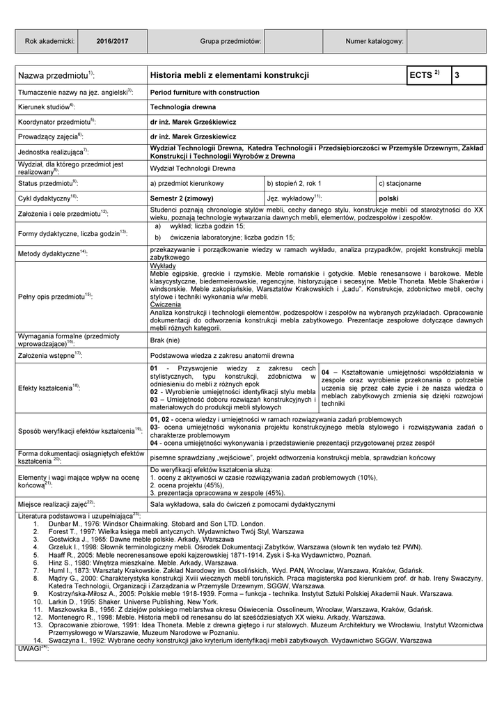 Rok akademicki: Grupa przedmiotów: 2016/2017 Numer katalogowy: Nazwa przedmiotu1): Historia mebli z elementami konstrukcji Tłumaczenie nazwy na jęz. angielski3): Period furniture with construction Kierunek studiów4): Technologia drewna 5) Koordynator przedmiotu : dr inż. Marek Grześkiewicz Prowadzący zajęcia6): dr inż. Marek Grzeskiewicz ECTS 2) 3 Jednostka realizująca : Wydział Technologii Drewna, Katedra Technologii i Przedsiębiorczości w Przemyśle Drzewnym, Zakład Konstrukcji i Technologii Wyrobów z Drewna Wydział, dla którego przedmiot jest realizowany8): Wydział Technologii Drewna 7) 9) Status przedmiotu : a) przedmiot kierunkowy b) stopień 2, rok 1 c) stacjonarne Cykl dydaktyczny10): Semestr 2 (zimowy) Jęz. wykładowy11): polski Studenci poznają chronologie stylów mebli, cechy danego stylu, konstrukcje mebli od starożytności do XX wieku, poznają technologie wytwarzania dawnych mebli, elementów, podzespołów i zespołów. a) wykład; liczba godzin 15; 12) Założenia i cele przedmiotu : Formy dydaktyczne, liczba godzin13): b) ćwiczenia laboratoryjne; liczba godzin 15; przekazywanie i porządkowanie wiedzy w ramach wykładu, analiza przypadków, projekt konstrukcji mebla zabytkowego Wykłady Meble egipskie, greckie i rzymskie. Meble romańskie i gotyckie. Meble renesansowe i barokowe. Meble klasycystyczne, biedermeierowskie, regencyjne, historyzujące i secesyjne. Meble Thoneta. Meble Shakerów i windsorskie. Meble zakopiańskie, Warsztatów Krakowskich i „Ładu”. Konstrukcje, zdobnictwo mebli, cechy stylowe i techniki wykonania w/w mebli. Ćwiczenia Analiza konstrukcji i technologii elementów, podzespołów i zespołów na wybranych przykładach. Opracowanie dokumentacji do odtworzenia konstrukcji mebla zabytkowego. Prezentacje zespołowe dotyczące dawnych mebli różnych kategorii. Metody dydaktyczne14): Pełny opis przedmiotu15): Wymagania formalne (przedmioty wprowadzające)16): Brak (nie) 17) Założenia wstępne : Podstawowa wiedza z zakresu anatomii drewna Efekty kształcenia18): 01 - Przyswojenie wiedzy z zakresu cech stylistycznych, typu konstrukcji, zdobnictwa w odniesieniu do mebli z różnych epok 02 - Wyrobienie umiejętności identyfikacji stylu mebla 03 – Umiejętność doboru rozwiązań konstrukcyjnych i materiałowych do produkcji mebli stylowych 19) Sposób weryfikacji efektów kształcenia : 04 – Kształtowanie umiejętności współdziałania w zespole oraz wyrobienie przekonania o potrzebie uczenia się przez całe życie i że nasza wiedza o meblach zabytkowych zmienia się dzięki rozwojowi techniki 01, 02 - ocena wiedzy i umiejętności w ramach rozwiązywania zadań problemowych 03- ocena umiejętności wykonania projektu konstrukcyjnego mebla stylowego i rozwiązywania zadań o charakterze problemowym 04 - ocena umiejętności wykonywania i przedstawienie prezentacji przygotowanej przez zespół Forma dokumentacji osiągniętych efektów pisemne sprawdziany „wejściowe”, projekt odtworzenia konstrukcji mebla, sprawdzian końcowy kształcenia 20): Do weryfikacji efektów kształcenia służą: Elementy i wagi mające wpływ na ocenę 1. oceny z aktywności w czasie rozwiązywania zadań problemowych (10%), końcową21): 2. ocena projektu (45%), 3. prezentacja opracowana w zespole (45%). Miejsce realizacji zajęć22): Sala wykładowa, sala do ćwiczeń z pomocami dydaktycznymi 23) Literatura podstawowa i uzupełniająca : 1. Dunbar M., 1976: Windsor Chairmaking. Stobard and Son LTD. London. 2. Forest T., 1997: Wielka księga mebli antycznych. Wydawnictwo Twój Styl, Warszawa 3. Gostwicka J., 1965: Dawne meble polskie. Arkady, Warszawa 4. Grzeluk I., 1998: Słownik terminologiczny mebli. Ośrodek Dokumentacji Zabytków, Warszawa (słownik ten wydało też PWN). 5. Haaff R., 2005: Meble neorenesansowe epoki kajzerowskiej 1871-1914. Zysk i S-ka Wydawnictwo, Poznań. 6. Hinz S., 1980: Wnętrza mieszkalne. Meble. Arkady, Warszawa. 7. Huml I., 1873: Warsztaty Krakowskie. Zakład Narodowy im. Ossolińskich,. Wyd. PAN, Wrocław, Warszawa, Kraków, Gdańsk. 8. Mądry G., 2000: Charakterystyka konstrukcji Xviii wiecznych mebli toruńskich. Praca magisterska pod kierunkiem prof. dr hab. Ireny Swaczyny, Katedra Technologii, Organizacji i Zarządzania w Przemyśle Drzewnym, SGGW, Warszawa. 9. Kostrzyńska-Miłosz A., 2005: Polskie meble 1918-1939. Forma – funkcja - technika. Instytut Sztuki Polskiej Akademii Nauk. Warszawa. 10. Larkin D., 1995: Shaker. Universe Publishing, New York. 11. Maszkowska B., 1956: Z dziejów polskiego meblarstwa okresu Oświecenia. Ossolineum, Wrocław, Warszawa, Kraków, Gdańsk. 12. Montenegro R., 1998: Meble. Historia mebli od renesansu do lat sześćdziesiątych XX wieku. Arkady, Warszawa. 13. Opracowanie zbiorowe, 1991: Idea Thoneta. Meble z drewna giętego i rur stalowych. Muzeum Architektury we Wrocławiu, Instytut Wzornictwa Przemysłowego w Warszawie, Muzeum Narodowe w Poznaniu. 14. Swaczyna I., 1992: Wybrane cechy konstrukcji jako kryterium identyfikacji mebli zabytkowych. Wydawnictwo SGGW, Warszawa UWAGI24): Wskaźniki ilościowe charakteryzujące moduł/przedmiot25) : Szacunkowa sumaryczna liczba godzin pracy studenta (kontaktowych i pracy własnej) niezbędna dla osiągnięcia zakładanych efektów kształcenia18) - na tej podstawie należy wypełnić pole ECTS2: 67 (37+30) h Łączna liczba punktów ECTS, którą student uzyskuje na zajęciach wymagających bezpośredniego udziału nauczycieli akademickich 2,2 ECTS Łączna liczba punktów ECTS, którą student uzyskuje w ramach zajęć o charakterze praktycznym, takich jak zajęcia laboratoryjne, projektowe, itp.: 1,2 ECTS Tabela zgodności kierunkowych efektów kształcenia efektami przedmiotu 26) Nr /symbol efektu 01 Wymienione w wierszu efekty kształcenia: Przyswojenie wiedzy z zakresu cech stylistycznych, typu konstrukcji, zdobnictwa w odniesieniu do mebli z różnych epok Odniesienie do efektów dla programu kształcenia na kierun