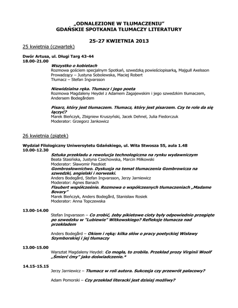 „ODNALEZIONE W TŁUMACZENIU” GDAŃSKIE SPOTKANIA TŁUMACZY LITERATURY 25-27 KWIETNIA 2013 25 kwietnia (czwartek) Dwór Artusa, ul. Długi Targ 43-44 18.00-21.00 Wszystko o kobietach Rozmowa gościem specjalnym Spotkań, szwedzką powieściopisarką, Majgull Axelsson Prowadzący – Justyna Sobolewska, Maciej Robert Tłumacz – Stefan Ingvarsson Niewidzialna ręka. Tłumacz i jego poeta Rozmowa Magdaleny Heydel z Adamem Zagajewskim i jego szwedzkim tłumaczem, Andersem Bodegårdem Pisarz, który jest tłumaczem. Tłumacz, który jest pisarzem. Czy te role da się łączyć? Marek Bieńczyk, Zbigniew Kruszyński, Jacek Dehnel, Julia Fiedorczuk Moderator: Grzegorz Jankowicz 26 kwietnia (piątek) Wydział Filologiczny Uniwersytetu Gdańskiego, ul. Wita Stwosza 55, aula 1.48 10.00-12.30 Sztuka przekładu a rewolucja technologiczna na rynku wydawniczym Beata Stasińska, Justyna Czechowska, Marcin Miłkowski Moderator: Sławomir Paszkiet Gombrosłownictwo. Dyskusja na temat tłumaczenia Gombrowicza na szwedzki, angielski i norweski. Anders Bodegård, Stefan Ingvarsson, Jerzy Jarniewicz Moderator: Agnes Banach Flaubert współcześnie. Rozmowa o współczesnych tłumaczeniach „Madame Bovary” Marek Bieńczyk, Anders Bodegård, Stanisław Rosiek Moderator: Anna Topczewska 13.00-14.00 Stefan Ingvarsson – Co zrobić, żeby pikietowe cioty były odpowiednio przegięte po szwedzku w "Lubiewie" Witkowskiego? Refleksje tłumacza nad przekładem Anders Bodegård – Okiem i ręką: kilka słów o pracy poetyckiej Wisławy Szymborskiej i jej tłumaczy 13.00-15.00 Warsztat Magdaleny Heydel: Co mogła, to zrobiła. Przekład prozy Virginii Woolf „Śmierć ćmy” jako doświadczenie.* 14.15-15.15 Jerzy Jarniewicz – Tłumacz w roli autora. Sukcesja czy przewrót pałacowy? Adam Pomorski – Czy przekład literacki jest dzisiaj możliwy? Instytut Kultury Miejskiej, ul. Długi Targ 39/40 godz. 17.30 Nie wolno kłamać. Tłumacz dzieciom. O literaturze dla dzieci w przekładzie* Katarzyna Skalska, Bogusława Sochańska, Barbara Gawryluk, Tomasz Kuźmicki Moderator: Magdalena Heydel Na spotkanie zapraszamy rodziców z dziećmi - podczas panelu odbędą się również warsztaty dla najmłodszych przygotowane przez Wydawnictwo EneDueRabe. Gdańska Galeria Güntera Grassa, ul. Szeroka 34/35, 36, 37 godz. 19.00 „Spojrzenia” - wernisaż wystawy fotograficznej Cato Leina Podczas wystawy zaprezentujemy portrety polskich i zagranicznych pisarzy i tłumaczy autorstwa szwedzkiego fotografika, Cato Leina. Wystawa otwarta będzie do 12 maja. 27 kwietnia (sobota) Instytut Kultury Miejskiej, ul. Długi Targ 39/40 11.00-12.30 To samo nie tak samo. Zakamarkowe zabawy w słowa.* prowadzenie: Agnieszka Stróżyk, tłumaczka; warsztat dla dzieci (5-10 lat) Nadbałtyckie Centrum Kultury, ul. Korzenna 33/35 11.00-12.45 Pisarze podróżujący i osiadli - tłumacze rzeczywistości Joanna Bator, Grażyna Plebanek, Szczepan Twardoch Moderator: Anna Dziewit-Meller Koszmar złych tłumaczeń. Krytyka przekładu w Polsce. Jacek Dehnel, Anna Topczewska, Justyna Sobolewska, Michał Chaciński Moderator: Anna Dziewit–Meller 13.00-14.45 Sytuacja tłumaczy literatury w Polsce. Czy w Szwecji jest podobnie? Sławomir Paszkiet, Justyna Czechowska, Jerzy Jarniewicz, Stefan Ingvarsson Moderator: Katarzyna Tubylewicz Tłumaczyć poezję Julia Fiedorczuk, Tadeusz Dąbrowski, Dariusz Suska, Irena Grönberg Moderator: Agnieszka Wolny-Hamkało *zapisy i kontakt: [email protected] Wstęp na wszystkie wydarzenia jest bezpłatny, wcześniejszej rejestracji wymaga wyłącznie udział w warsztatach