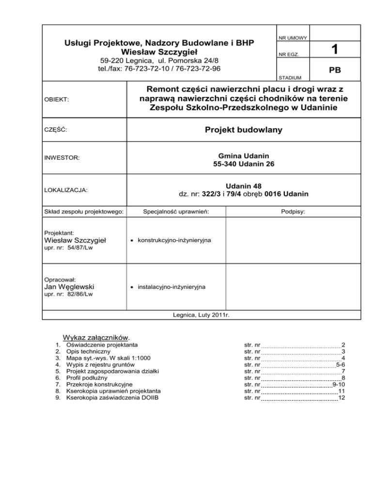 Usługi Projektowe, Nadzory Budowlane i BHP Wiesław Szczygieł NR UMOWY NR EGZ. 59-220 Legnica, ul. Pomorska 24/8 tel./fax: 76-723-72-10 / 76-723-72-96 1 PB STADIUM OBIEKT: Remont części nawierzchni placu i drogi wraz z naprawą nawierzchni części chodników na terenie Zespołu Szkolno-Przedszkolnego w Udaninie CZĘŚĆ: Projekt budowlany Gmina Udanin 55-340 Udanin 26 INWESTOR: Udanin 48 dz. nr: 322/3 i 79/4 obręb 0016 Udanin LOKALIZACJA: Skład zespołu projektowego: Specjalność uprawnień: Podpisy: Projektant: Wiesław Szczygieł • konstrukcyjno-inżynieryjna upr. nr: 54/87/Lw Opracował: Jan Węglewski • instalacyjno-inżynieryjna upr. nr: 82/86/Lw Legnica, Luty 2011r. Wykaz załączników. 1. 2. 3. 4. 5. 6. 7. 8. 9. Oświadczenie projektanta Opis techniczny Mapa syt.-wys. W skali 1:1000 Wypis z rejestru gruntów Projekt zagospodarowania działki Profil podłużny Przekroje konstrukcyjne Kserokopia uprawnień projektanta Kserokopia zaświadczenia DOIIB str. nr str. nr str. nr str. nr str. nr str. nr str. nr str. nr str. nr 2 3 4 5-6 7 8 9-10 11 12 OPIS TECHNICZNY Przedmiotem opracowania jest remont części nawierzchni placu i drogi wraz z naprawą nawierzchni części chodników na terenie należącym do Gminy Udanin a będącym w zarządzie Zespołu Szkolno-Przedszkolnego w Udaninie. Parametry techniczne części przeznaczonej do remontu: - nawierzchnia jezdni 609,00m² - nawierzchnia zatok parkingowych 59,00m² - nawierzchnia chodników 267,00m² - krawężniki betonowe do wymiany 181,00mb Stan istniejący Nawierzchnia jezdni dróg wewnętrznych i zatok parkingowych w całości została wykonana z betonu B-20, wylewanego na mokro w przestrzeniach między krawężnikami i dylatowanego poprzecznie do osi drogi w odstępach 3,00m. Beton mocno popękany z licznymi wykruszającymi się wybojami i koleinami nie nadający się do remontu – wymaga rozbiórki. Krawężniki wystające o wym. 15 x 30 x 100cm wykonane zostały na ławie betonowej na podsypce cementowo-piaskowej są pozałamywane i wykruszone. Ciągi piesze na dojściu głównym i wokół budynku szkolnego wykonano z kostki typu "polbruk" na podsypce piaskowej. Powierzchnia chodników w częściowo popękanymi kostkami. pasie przykrawężnikowym pozałamywana z Rozwiązanie projektowe Odtworzenie nawierzchni jezdnych i dotychczasowych rzędnych wysokościowych. chodników należy wykonać na W ramach robót remontowych należy: - dokonać rozbiórki nawierzchni betonowych wyznaczonej powierzchni wjazdu na teren szkolny i drogi wewnętrznej; - dokonać rozbiórki wyznaczonej powierzchni chodnika wykonanego z kostki typu Polbruk na podsypce piaskowej; - dokonać rozbiórki uszkodzonych krawężników wraz z elementami ławy betonowej wraz z załadunkiem i wywozem oraz kosztem opłat z tytułu składowania gruzu betonowego z rozbiórki na składowisku odpadów stałych. Nowe krawężniki betonowe 15*30cm ustawić na ławie betonowej z oporem z betonu B-15. Całość rozebranej nawierzchni w ciągu jezdnym i zatok parkingowych odtworzyć z kostki typu "polbruk" wzór BEHATON o grub. 100mm na podsypce cementowo-piaskowej gr. 5cm i podbudowie z mieszanki kamiennej 0/31,5mm o grubości warstwy 30cm i warstwie odsączającej z piasku o grubości warstwy 10cm. Rozebrane elementy chodnika odtworzyć kostką typu "polbruk" o grub. 60mm na podsypce cementowo-piaskowej o grubości warstwy 5cm (w stosunku: 70% - kostka z odzysku + 30% - kostka nowa), oraz na podbudowie z mieszanki kamiennej 0/31,5mm o grubości warstwy 10cm. Kolor i kształt kostki na chodnikach należy dopasować do pozostałej przeznaczonej do ponownego wbudowania kostki z rozbiórki. Całość robót odtworzeniowych nawierzchni części jezdnej należy poprzedzić regulacją pionową studzienek i wpustów urządzeń podziemnych (wpusty drogowe, kraty, włazy, ...). Opracował:
