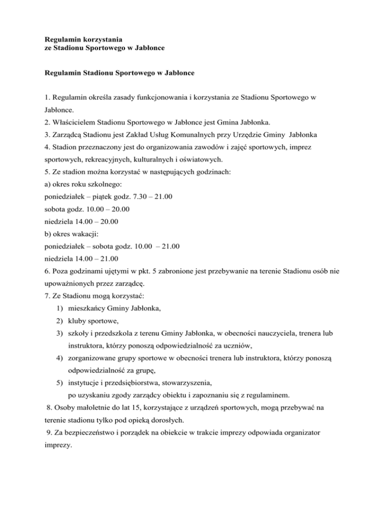 Regulamin korzystania ze Stadionu Sportowego w Jabłonce Regulamin Stadionu Sportowego w Jabłonce 1. Regulamin określa zasady funkcjonowania i korzystania ze Stadionu Sportowego w Jabłonce. 2. Właścicielem Stadionu Sportowego w Jabłonce jest Gmina Jabłonka. 3. Zarządcą Stadionu jest Zakład Usług Komunalnych przy Urzędzie Gminy Jabłonka 4. Stadion przeznaczony jest do organizowania zawodów i zajęć sportowych, imprez sportowych, rekreacyjnych, kulturalnych i oświatowych. 5. Ze stadion moŜna korzystać w następujących godzinach: a) okres roku szkolnego: poniedziałek – piątek godz. 7.30 – 21.00 sobota godz. 10.00 – 20.00 niedziela 14.00 – 20.00 b) okres wakacji: poniedziałek – sobota godz. 10.00 – 21.00 niedziela 14.00 – 21.00 6. Poza godzinami ujętymi w pkt. 5 zabronione jest przebywanie na terenie Stadionu osób nie upowaŜnionych przez zarządcę. 7. Ze Stadionu mogą korzystać: 1) mieszkańcy Gminy Jabłonka, 2) kluby sportowe, 3) szkoły i przedszkola z terenu Gminy Jabłonka, w obecności nauczyciela, trenera lub instruktora, którzy ponoszą odpowiedzialność za uczniów, 4) zorganizowane grupy sportowe w obecności trenera lub instruktora, którzy ponoszą odpowiedzialność za grupę, 5) instytucje i przedsiębiorstwa, stowarzyszenia, po uzyskaniu zgody zarządcy obiektu i zapoznaniu się z regulaminem. 8. Osoby małoletnie do lat 15, korzystające z urządzeń sportowych, mogą przebywać na terenie stadionu tylko pod opieką dorosłych. 9. Za bezpieczeństwo i porządek na obiekcie w trakcie imprezy odpowiada organizator imprezy. 10. Wszystkie osoby przebywające na terenie obiektu, zobowiązane są do podporządkowania się poleceniom słuŜb porządkowych, osób upowaŜnionych przez zarządcę oraz instruktorów sportu. 11. Urząd Gminy Jabłonka i Zarządca Stadionu nie ponosi odpowiedzialności za wypadki powstałe w trakcie korzystania z obiektu 12. Za rzeczy pozostawione w szatni zarządca nie ponosi odpowiedzialności. 13. Korzystający ze Stadionu ponoszą odpowiedzialność materialną za zniszczenia i dewastację obiektu (sprzęt sportowy, szatnie, trybuny dla kibiców i inne wykorzystywane pomieszczenia). Jednocześnie są zobowiązani do zgłaszania wyrządzonych szkód słuŜbom porządkowym, osobom upowaŜnionym przez zarządcę oraz instruktorom sportu. 14. Boiska nie mogą być uŜywane w przypadku rozmiękłej nawierzchni spowodowanej deszczem lub śniegiem. 15. SprzedaŜ, podawanie i spoŜywanie napojów alkoholowych na terenie Stadionu moŜe odbywać się tylko za zezwoleniem i tylko w miejscach do tego wyznaczonych. 16. Osoby, które będą zakłócały porządek, będą zmuszone do opuszczenia obiektu. 17. Nadzór nad utrzymaniem i konserwacją Stadionu oraz terminami, organizacją imprez, treningów i zajęć sportowych sprawuje Urząd Gminy Jabłonka i Zarządca Stadionu. 18. Rozgrywki sportowe, mecze, programowe zajęcia oraz inne imprezy rekreacyjno sportowe, kulturalne i oświatowe odbywają się wg wcześniej ustalonego przez zarządcę stadionu harmonogramu. 19. Na terenie Stadionu zakazuje się: 1. wchodzenia na ogrodzenia, słupy oświetleniowe, maszty, dachy, bramki, 2. umieszczania na budynkach, urządzeniach, drogach lub ogrodzeniach napisów, plakatów, reklam lub ogłoszeń - bez zgody zarządcy, 3. zaśmiecania terenu stadionu sportowego. 20. Wszelkie zmiany w treści regulaminu wymagają Uchwały Rady Gminy Jabłonka.