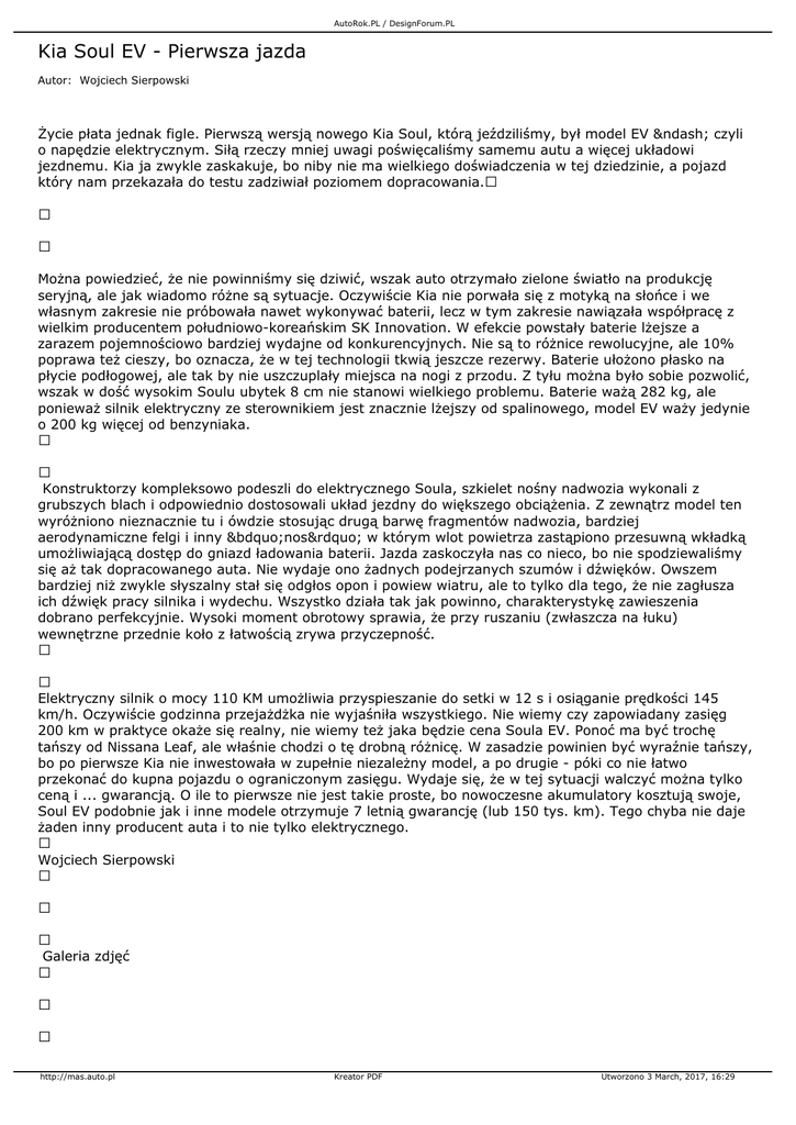 AutoRok.PL / DesignForum.PL Kia Soul EV - Pierwsza jazda Autor: Wojciech Sierpowski Życie płata jednak figle. Pierwszą wersją nowego Kia Soul, którą jeździliśmy, był model EV – czyli o napędzie elektrycznym. Siłą rzeczy mniej uwagi poświęcaliśmy samemu autu a więcej układowi jezdnemu. Kia ja zwykle zaskakuje, bo niby nie ma wielkiego doświadczenia w tej dziedzinie, a pojazd który nam przekazała do testu zadziwiał poziomem dopracowania. Można powiedzieć, że nie powinniśmy się dziwić, wszak auto otrzymało zielone światło na produkcję seryjną, ale jak wiadomo różne są sytuacje. Oczywiście Kia nie porwała się z motyką na słońce i we własnym zakresie nie próbowała nawet wykonywać baterii, lecz w tym zakresie nawiązała współpracę z wielkim producentem południowo-koreańskim SK Innovation. W efekcie powstały baterie lżejsze a zarazem pojemnościowo bardziej wydajne od konkurencyjnych. Nie są to różnice rewolucyjne, ale 10% poprawa też cieszy, bo oznacza, że w tej technologii tkwią jeszcze rezerwy. Baterie ułożono płasko na płycie podłogowej, ale tak by nie uszczuplały miejsca na nogi z przodu. Z tyłu można było sobie pozwolić, wszak w dość wysokim Soulu ubytek 8 cm nie stanowi wielkiego problemu. Baterie ważą 282 kg, ale ponieważ silnik elektryczny ze sterownikiem jest znacznie lżejszy od spalinowego, model EV waży jedynie o 200 kg więcej od benzyniaka. Konstruktorzy kompleksowo podeszli do elektrycznego Soula, szkielet nośny nadwozia wykonali z grubszych blach i odpowiednio dostosowali układ jezdny do większego obciążenia. Z zewnątrz model ten wyróżniono nieznacznie tu i ówdzie stosując drugą barwę fragmentów nadwozia, bardziej aerodynamiczne felgi i inny „nos” w którym wlot powietrza zastąpiono przesuwną wkładką umożliwiającą dostęp do gniazd ładowania baterii. Jazda zaskoczyła nas co nieco, bo nie spodziewaliśmy się aż tak dopracowanego auta. Nie wydaje ono żadnych podejrzanych szumów i dźwięków. Owszem bardziej niż zwykle słyszalny stał się odgłos opon i powiew wiatru, ale to tylko dla tego, że nie zagłusza ich dźwięk pracy silnika i wydechu. Wszystko działa tak jak powinno, charakterystykę zawieszenia dobrano perfekcyjnie. Wysoki moment obrotowy sprawia, że przy ruszaniu (zwłaszcza na łuku) wewnętrzne przednie koło z łatwością zrywa przyczepność. Elektryczny silnik o mocy 110 KM umożliwia przyspieszanie do setki w 12 s i osiąganie prędkości 145 km/h. Oczywiście godzinna przejażdżka nie wyjaśniła wszystkiego. Nie wiemy czy zapowiadany zasięg 200 km w praktyce okaże się realny, nie wiemy też jaka będzie cena Soula EV. Ponoć ma być trochę tańszy od Nissana Leaf, ale właśnie chodzi o tę drobną różnicę. W zasadzie powinien być wyraźnie tańszy, bo po pierwsze Kia nie inwestowała w zupełnie niezależny model, a po drugie - póki co nie łatwo przekonać do kupna pojazdu o ograniczonym zasięgu. Wydaje się, że w tej sytuacji walczyć można tylko ceną i ... gwarancją. O ile to pierwsze nie jest takie proste, bo nowoczesne akumulatory kosztują swoje, Soul EV podobnie jak i inne modele otrzymuje 7 letnią gwarancję (lub 150 tys. km). Tego chyba nie daje żaden inny producent auta i to nie tylko elektrycznego. Wojciech Sierpowski Galeria zdjęć http://mas.auto.pl Kreator PDF Utworzono 3 March, 2017, 16:29 AutoRok.PL / DesignForum.PL http://mas.auto.pl Kreator PDF Utworzono 3 March, 2017, 16:29