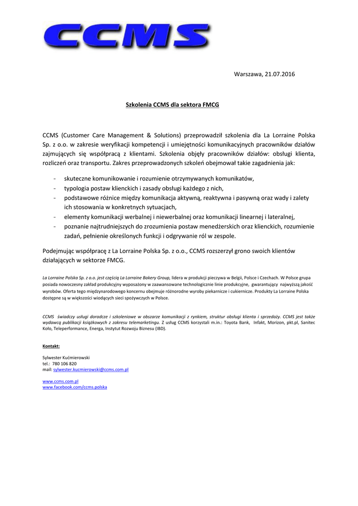 Warszawa, 21.07.2016 Szkolenia CCMS dla sektora FMCG CCMS (Customer Care Management & Solutions) przeprowadził szkolenia dla La Lorraine Polska Sp. z o.o. w zakresie weryfikacji kompetencji i umiejętności komunikacyjnych pracowników działów zajmujących się współpracą z klientami. Szkolenia objęły pracowników działów: obsługi klienta, rozliczeń oraz transportu. Zakres przeprowadzonych szkoleń obejmował takie zagadnienia jak: - skuteczne komunikowanie i rozumienie otrzymywanych komunikatów, typologia postaw klienckich i zasady obsługi każdego z nich, podstawowe różnice między komunikacja aktywną, reaktywna i pasywną oraz wady i zalety ich stosowania w konkretnych sytuacjach, elementy komunikacji werbalnej i niewerbalnej oraz komunikacji linearnej i lateralnej, poznanie najtrudniejszych do zrozumienia postaw menedżerskich oraz klienckich, rozumienie zadań, pełnienie określonych funkcji i odgrywanie ról w zespole. Podejmując współpracę z La Lorraine Polska Sp. z o.o., CCMS rozszerzył grono swoich klientów działających w sektorze FMCG. La Lorraine Polska Sp. z o.o. jest częścią La Lorraine Bakery Group, lidera w produkcji pieczywa w Belgii, Polsce i Czechach. W Polsce grupa posiada nowoczesny zakład produkcyjny wyposażony w zaawansowane technologicznie linie produkcyjne, gwarantujący najwyższą jakość wyrobów. Oferta tego międzynarodowego koncernu obejmuje różnorodne wyroby piekarnicze i cukiernicze. Produkty La Lorraine Polska dostępne są w większości wiodących sieci spożywczych w Polsce. CCMS świadczy usługi doradcze i szkoleniowe w obszarze komunikacji z rynkiem, struktur obsługi klienta i sprzedaży. CCMS jest także wydawcą publikacji książkowych z zakresu telemarketingu. Z usług CCMS korzystali m.in.: Toyota Bank, Infakt, Morizon, pkt.pl, Sanitec Koło, Teleperformance, Energa, Instytut Rozwoju Biznesu (IBD). Kontakt: Sylwester Kućmierowski tel.: 780 106 820 mail: [email protected] www.ccms.com.pl www.facebook.com/ccms.polska