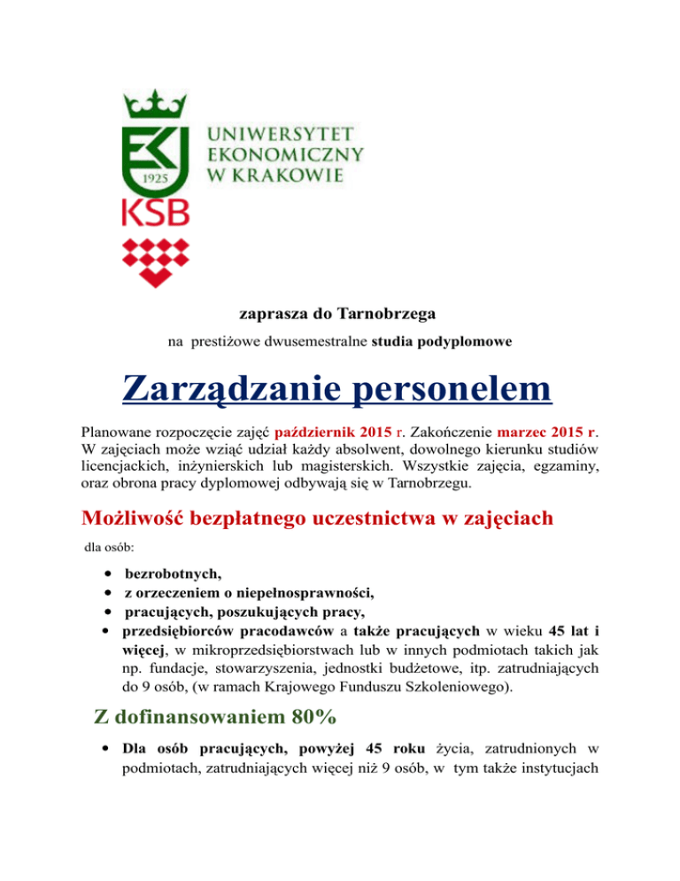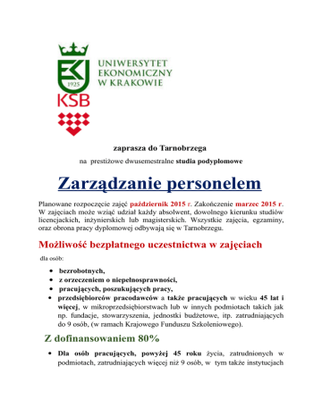 zaprasza do Tarnobrzega na prestiżowe dwusemestralne studia podyplomowe Zarządzanie personelem Planowane rozpoczęcie zajęć październik 2015 r. Zakończenie marzec 2015 r. W zajęciach może wziąć udział każdy absolwent, dowolnego kierunku studiów licencjackich, inżynierskich lub magisterskich. Wszystkie zajęcia, egzaminy, oraz obrona pracy dyplomowej odbywają się w Tarnobrzegu. Możliwość bezpłatnego uczestnictwa w zajęciach dla osób: bezrobotnych, z orzeczeniem o niepełnosprawności, pracujących, poszukujących pracy, przedsiębiorców pracodawców a także pracujących w wieku 45 lat i więcej, w mikroprzedsiębiorstwach lub w innych podmiotach takich jak np. fundacje, stowarzyszenia, jednostki budżetowe, itp. zatrudniających do 9 osób, (w ramach Krajowego Funduszu Szkoleniowego). Z dofinansowaniem 80% Dla osób pracujących, powyżej 45 roku życia, zatrudnionych w podmiotach, zatrudniających więcej niż 9 osób, w tym także instytucjach i jednostkach sektora finansów publicznych np. szkoły, szpitale, samorządy, itp. (w ramach Krajowego Funduszu Szkoleniowego). Cel studiów: Celem studiów jest zaznajomienie słuchaczy ze współczesnym podejściem do zarządzania personelem, stosowanymi metodami i technikami realizacji polityki personalnej. Profil słuchacza: Ze względu na interdyscyplinarny charakter tematów poruszanych w trakcie zajęć, studia przeznaczone są dla wszystkich zainteresowanych problematyką zarządzania personelem, ze szczególnym uwzględnieniem osób, które pracują lub zamierzają w przyszłości podjąć pracę w komórkach personalnych. Studia dwusemestralne, 200 godzin zajęć. cena - 4300 zł 1. Strategie, cele i funkcje zarządzania personelem - Celem zajęć jest wprowadzenie do tematyki realizacji funkcji personalnej we współczesnych organizacjach. Wskazanie charakterystyk kapitału ludzkiego, które sprawiają, że jest on postrzegany jako strategiczne źródło konkurencyjności organizacji. 2. Rynek pracy - Zajęcia poświęcone są kwestiom związanym z współczesnymi trendami na rynku pracy. W ramach przedmiotu omawiane są aspekty związane z pozyskiwaniem środków unijnych z PO KL. 3. Elementy socjologii i psychologii w zarządzaniu personelem: o zachowania w sytuacjach trudnych psychologicznie o socjotechniczne aspekty zarządzania zasobami ludzkimi o asertywność w kierowaniu ludźmi Blok przedmiotów socjologiczno- psychologicznych poświęcony jest metodom i narzędziom zarządzania relacjami społecznymi. 4. Elementy prawa pracy - Celem przedmiotu jest przedstawienie kluczowych kwestii związanych z prawno-formalnymi aspektami relacji pracobiorca-pracodawca. 5. Techniki twórczego myślenia - Zajęcia dedykowane są kwestiom diagnozowania i kreatywnego rozwiązywania problemów w relacjach interpersonalnych. 6. Racjonalizacja zatrudnienia – zatrudnianie i zwalnianie - Blok poświęcony jest kwestiom efektywnego pozyskiwania pracowników. Część bloku poświęcona jest również kwestiom de rekrutacji pracowników. 7. Motywowanie pracowników - Celem zajęć jest omówienie zagadnień związanych z pozafinansowymi aspektami motywowania pracowników. W szczególności omawiane są teorie potrzeb oraz ich wpływu na zaangażowanie pracowników. 8. System ocen okresowych pracowników - Celem zajęć jest zapoznanie uczestników z celami, zasadami oraz pozostałymi elementami konstrukcji systemu ocen okresowych pracowników. 9. Zarządzanie systemami wynagradzania - Celem bloku jest podstaw prawnych tworzenia systemów wynagradzania pracowników. W związku z powyższym omówione zostaną kolejne etapy tworzenia efektywnego i zorientowanego na wspieranie celów biznesowych firmy systemu wynagrodzeń. 10.Szkolenie i doskonalenie zawodowe - Celem zajęć jest rozwinięcie u uczestników wiedzy i umiejętności projektowania, wdrażania i badania efektywności szkoleń w organizacjach. 11.Planowanie karier zawodowych - Celem zajęć jest zaznajomienie słuchaczy z problematyką karier zawodowych w organizacji. Przedstawione zostaną miejsce i rola problematyki karier wśród innych aktywności zarządzania zasobami ludzkimi oraz organizacyjne instrumenty kształtowania karier. 12.Tworzenie zespołów - Blok poświęcony jest kwestiom związanych z tworzeniem i zarządzaniem zespołami pracowniczymi w organizacji. 13.Przywództwo w zarządzaniu zasobami ludzkimi - Efektywne przywództwo stanowi jeden z kluczowych czynników zarządzania pracownikami. Celem zajęć jest zatem zdefiniowanie pojęcia przywództwa oraz wskazanie zasad efektywnego przywództwa w organizacji. 14.Ubezpieczenia społeczne - Blok poświęcony jest kwestiom organizacji oraz funkcjonowania systemu ubezpieczeń w Polsce. W czasie zajęć omówione zostaną kwestie związane z administrowaniem ubezpieczeniami społecznymi zatrudnionych pracowników. 15.Podstawy komunikowania - Program zajęć obejmuje kwestie związane z procesem efektywnego komunikowania się. W czasie zajęć omówione zostaną kwestię barier w komunikowaniu się oraz metody i narzędzia efektywnej komunikacji. 16.Sztuka negocjacji - Tematyka bloku poświęcona jest profesjonalizacji procesu negocjacji. W czasie zajęć omówione zostaną strategie, metody i techniki efektywnych negocjacji. 17.Controlling personalny - Podstawowym celem zajęć jest przedstawienia istoty i zakresu controllingu funkcji personalnej. W czasie zajęć omówione zostaną metody i narzędzia wykorzystywane w controllingu personalnym. 18. Zarządzanie zmianą w dziedzinie zasobów ludzkich - Celem zajęć jest omówienie kwestii metodologicznego podejścia do zarządzania zmianą w obszarze funkcji personalnej. W czasie zajęć omówione zostaną również kwestie przezwyciężania oporu przeciwko zmianom. 19. Systemy informatyczne w zarządzaniu personelem - Blok ukierunkowany jest na poszerzenie zakresu wiedzy i umiejętności uczestników z zakresu obsługi programów informatycznych wspomaga