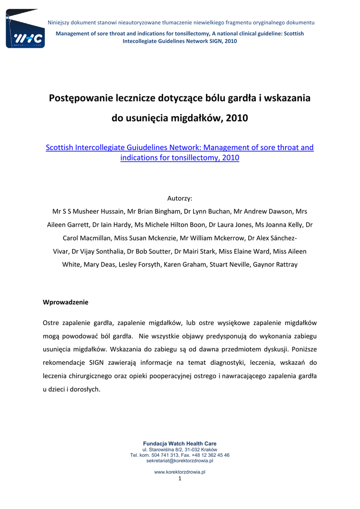 Niniejszy dokument stanowi nieautoryzowane tłumaczenie niewielkiego fragmentu oryginalnego dokumentu Management of sore throat and indications for tonsillectomy, A national clinical guideline: Scottish Intecollegiate Guidelines Network SIGN, 2010 Postępowanie lecznicze dotyczące bólu gardła i wskazania do usunięcia migdałków, 2010 Scottish Intercollegiate Guiudelines Network: Management of sore throat and indications for tonsillectomy, 2010 Autorzy: Mr S S Musheer Hussain, Mr Brian Bingham, Dr Lynn Buchan, Mr Andrew Dawson, Mrs Aileen Garrett, Dr Iain Hardy, Ms Michele Hilton Boon, Dr Laura Jones, Ms Joanna Kelly, Dr Carol Macmillan, Miss Susan Mckenzie, Mr William Mckerrow, Dr Alex SánchezVivar, Dr Vijay Sonthalia, Dr Bob Soutter, Dr Mairi Stark, Miss Elaine Ward, Miss Aileen White, Mary Deas, Lesley Forsyth, Karen Graham, Stuart Neville, Gaynor Rattray Wprowadzenie Ostre zapalenie gardła, zapalenie migdałków, lub ostre wysiękowe zapalenie migdałków mogą powodować ból gardła. Nie wszystkie objawy predysponują do wykonania zabiegu usunięcia migdałków. Wskazania do zabiegu są od dawna przedmiotem dyskusji. Poniższe rekomendacje SIGN zawierają informacje na temat diagnostyki, leczenia, wskazań do leczenia chirurgicznego oraz opieki pooperacyjnej ostrego i nawracającego zapalenia gardła u dzieci i dorosłych. Fundacja Watch Health Care ul. Starowiślna 8/2, 31-032 Kraków Tel. kom. 504 741 313, Fax. +48 12 362 45 46 [email protected] www.korektorzdrowia.pl 1 Niniejszy dokument stanowi nieautoryzowane tłumaczenie niewielkiego fragmentu oryginalnego dokumentu Management of sore throat and indications for tonsillectomy, A national clinical guideline: Scottish Intecollegiate Guidelines Network SIGN, 2010 Zalecenia ogólne: 1. Zaleca się stosowanie ibuprofenu (400 mg trzy razy na dobę) w łagodzeniu gorączki, bólu głowy i bólu gardła u dorosłych z bólem gardła. 2. U dorosłych z bólem gardła, którzy nie tolerują ibuprofenu, zaleca się stosowanie paracetamolu (1 g cztery razy na dobę). 3. Zaleca się stosowanie ibuprofenu jako alternatywę dla paracetamolu u dzieci. 4. Nie należy stosować rutynowo ibuprofenu u dzieci narażonych na odwodnienie. 5. W celu łagodzenie objawów bólu gardła nie należy stosować antybiotyków. Leczenie chirurgiczne: 1. U dzieci z lekkim bólem gardła zaleca się obserwację gardła zamiast wykonywania zabiegu usunięcia migdałków. 2. Wycięcie migdałków jest zalecane w przypadku nawrotowej i ciężkiej postaci bólu gardła u dorosłych. Wskazania do rozpatrzenia zabiegu wycięcia migdałków w nawrotowym ostrym zapaleniu gardła u dzieci i u dorosłych: ból gardła spowodowany ostrym zapaleniem migdałków; częste epizody ból gardła uniemożliwiające normalne funkcjonowanie; siedem lub więcej udokumentowanych epizodów bólu gardła w roku poprzednim/pięć lub więcej takich epizodów w dwóch ostatnich latach/trzy lub więcej takich epizodów w trzech poprzednich latach. Fundacja Watch Health Care ul. Starowiślna 8/2, 31-032 Kraków Tel. kom. 504 741 313, Fax. +48 12 362 45 46 [email protected] www.korektorzdrowia.pl 2 Niniejszy dokument stanowi nieautoryzowane tłumaczenie niewielkiego fragmentu oryginalnego dokumentu Management of sore throat and indications for tonsillectomy, A national clinical guideline: Scottish Intecollegiate Guidelines Network SIGN, 2010 Opieka pooperacyjna: 1. Pacjenci powinni być poinformowani o możliwości wystąpienia bólu, występującym maksymalnie do 6 dni od wykonania zabiegu wycięcia migdałków. 2. Zaleca się rutynowe stosowanie leków przeciwwymiotnych w zapobieganiu pooperacyjnym nudnościom i wymiotom po zabiegu wycięcia migdałków. 3. W zapobieganiu pooperacyjnym wymiotom u dzieci poddawanych zabiegowi wycięcia migdałków zaleca się stosowanie pojedynczej dawki deksametazonu (dawka 0,15 do 1,0 mg/kg, maksymalna dawka 8 do 25 mg). 4. W celu zapobiegania pooperacyjnym nudnościom i wymiotom zaleca się stosowanie pojedynczej dawki deksametazonu (10 mg) przy znieczuleniu pacjenta. Fundacja Watch Health Care ul. Starowiślna 8/2, 31-032 Kraków Tel. kom. 504 741 313, Fax. +48 12 362 45 46 [email protected] www.korektorzdrowia.pl 3