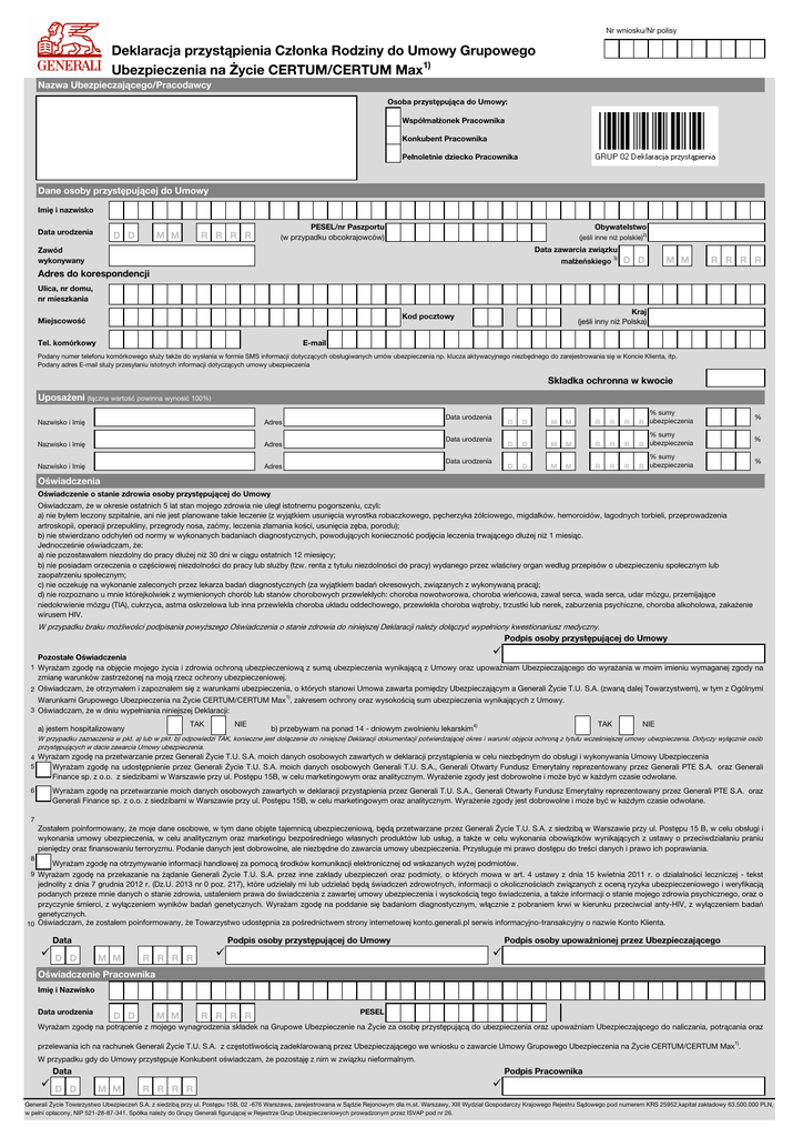 Nr wniosku/Nr polisy Deklaracja przystąpienia Członka Rodziny do Umowy Grupowego 1) Ubezpieczenia na Życie CERTUM/CERTUM Max [nowe logo] Nazwa Ubezpieczającego/Pracodawcy Osoba przystępująca do Umowy: Współmałżonek Pracownika Konkubent Pracownika Pełnoletnie dziecko Pracownika Dane osoby przystępującej do Umowy Imię i nazwisko Data urodzenia D D M M Obywatelstwo PESEL/nr Paszportu (w przypadku obcokrajowców) R R R R (jeśli inne niż polskie) Data zawarcia związku małżeńskiego 3) Zawód wykonywany 2) D D M M R R R R Adres do korespondencji Ulica, nr domu, nr mieszkania Kraj (jeśli inny niż Polska) Kod pocztowy Miejscowość Tel. komórkowy E-mail Podany numer telefonu komórkowego służy także do wysłania w formie SMS informacji dotyczących obsługiwanych umów ubezpieczenia np. klucza aktywacyjnego niezbędnego do zarejestrowania się w Koncie Klienta, itp. Podany adres E-mail służy przesyłaniu istotnych informacji dotyczących umowy ubezpieczenia Składka ochronna w kwocie Uposażeni (łączna wartość powinna wynosić 100%) Nazwisko i Imię Data urodzenia Adres Nazwisko i Imię Data urodzenia Adres D Data urodzenia Adres Nazwisko i Imię D D D D D M M M M M M R R R R R R R % sumy R ubezpieczenia % R % sumy R ubezpieczenia % R % sumy R ubezpieczenia % Oświadczenia Oświadczenie o stanie zdrowia osoby przystępującej do Umowy Oświadczam, że w okresie ostatnich 5 lat stan mojego zdrowia nie uległ istotnemu pogorszeniu, czyli: a) nie byłem leczony szpitalnie, ani nie jest planowane takie leczenie (z wyjątkiem usunięcia wyrostka robaczkowego, pęcherzyka żółciowego, migdałków, hemoroidów, łagodnych torbieli, przeprowadzenia artroskopii, operacji przepukliny, przegrody nosa, zaćmy, leczenia złamania kości, usunięcia zęba, porodu); b) nie stwierdzano odchyleń od normy w wykonanych badaniach diagnostycznych, powodujących konieczność podjęcia leczenia trwającego dłużej niż 1 miesiąc. Jednocześnie oświadczam, że: a) nie pozostawałem niezdolny do pracy dłużej niż 30 dni w ciągu ostatnich 12 miesięcy; b) nie posiadam orzeczenia o częściowej niezdolności do pracy lub służby (tzw. renta z tytułu niezdolności do pracy) wydanego przez właściwy organ według przepisów o ubezpieczeniu społecznym lub zaopatrzeniu społecznym; c) nie oczekuję na wykonanie zaleconych przez lekarza badań diagnostycznych (za wyjątkiem badań okresowych, związanych z wykonywaną pracą); d) nie rozpoznano u mnie którejkolwiek z wymienionych chorób lub stanów chorobowych przewlekłych: choroba nowotworowa, choroba wieńcowa, zawał serca, wada serca, udar mózgu, przemijające niedokrwienie mózgu (TIA), cukrzyca, astma oskrzelowa lub inna przewlekła choroba układu oddechowego, przewlekła choroba wątroby, trzustki lub nerek, zaburzenia psychiczne, choroba alkoholowa, zakażenie wirusem HIV. W przypadku braku możliwości podpisania powyższego Oświadczenia o stanie zdrowia do niniejszej Deklaracji należy dołączyć wypełniony kwestionariusz medyczny. Podpis osoby przystępującej do Umowy Pozostałe Oświadczenia 1 Wyrażam zgodę na objęcie mojego życia i zdrowia ochroną ubezpieczeniową z sumą ubezpieczenia wynikającą z Umowy oraz upoważniam Ubezpieczającego do wyrażania w moim imieniu wymaganej zgody na zmianę warunków zastrzeżonej na moją rzecz ochrony ubezpieczeniowej. 2 Oświadczam, że otrzymałem i zapoznałem się z warunkami ubezpieczenia, o których stanowi Umowa zawarta pomiędzy Ubezpieczającym a Generali Życie T.U. S.A. (zwaną dalej Towarzystwem), w tym z Ogólnymi Warunkami Grupowego Ubezpieczenia na Życie CERTUM/CERTUM Max1), zakresem ochrony oraz wysokością sum ubezpieczenia wynikających z Umowy. 3 Oświadczam, że w dniu wypełniania niniejszej Deklaracji: TAK a) jestem hospitalizowany NIE TAK b) przebywam na ponad 14 - dniowym zwolnieniu lekarskim4) NIE W przypadku zaznaczenia w pkt. a) lub w pkt. b) odpowiedzi TAK, konieczne jest dołączenie do niniejszej Deklaracji dokumentacji potwierdzającej okres i warunki objęcia ochroną z tytułu wcześniejszej umowy ubezpieczenia. Dotyczy wyłącznie osób przystępujących w dacie zawarcia Umowy ubezpieczenia. 4 Wyrażam zgodę na przetwarzanie przez Generali Życie T.U. S.A. moich danych osobowych zawartych w deklaracji przystąpienia w celu niezbędnym do obsługi i wykonywania Umowy Ubezpieczenia 5 Wyrażam zgodę na udostępnienie przez Generali Życie T.U. S.A. moich danych osobowych Generali T.U. S.A., Generali Otwarty Fundusz Emerytalny reprezentowany przez Generali PTE S.A. oraz Generali Finance sp. z o.o. z siedzibami w Warszawie przy ul. Postępu 15B, w celu marketingowym oraz analitycznym. Wyrażenie zgody jest dobrowolne i może być w każdym czasie odwołane. 6 Wyrażam zgodę na przetwarzanie moich danych osobowych zawartych w deklaracji przystąpienia przez Generali T.U. S.A., Generali Otwarty Fundusz Emerytalny reprezentowany przez Generali PTE S.A. oraz Generali Finance sp. z o.o. z siedzibami w Warszawie przy ul. Postępu 15B, w celu marketingowym oraz analitycznym. Wyrażenie zgody jest dobrowolne i może być w każdym czasie odwołane. 7 Zostałem poinformowany, że moje dane osobowe, w tym dane objęte tajemnicą ubezpieczeniową, będą przetwarzane przez Generali Życie T.U. S.A. z siedzibą w Warszawie przy ul. Postępu 15 B, w celu obsługi i wykonania umowy ubezpieczenia, w celu analitycznym oraz marketingu bezpośredniego własnych produktów lub usług, a także w celu wykonania obowiązków wynikających z ustawy o przeciwdziałaniu praniu pieniędzy oraz finansowaniu terroryzmu. Podanie danych jest dobrowolne, ale niezbędne do zawarcia umowy ubezpieczenia. Przysługuje mi prawo dostępu do treści danych i prawo ich poprawiania. 8 Wyrażam zgodę na otrzymywanie informacji handlowej za pomocą środków komunikacji elektronicznej od wskazanych wyżej podmiotów. 9 Wyrażam zgodę na przekazanie na żądanie Generali 