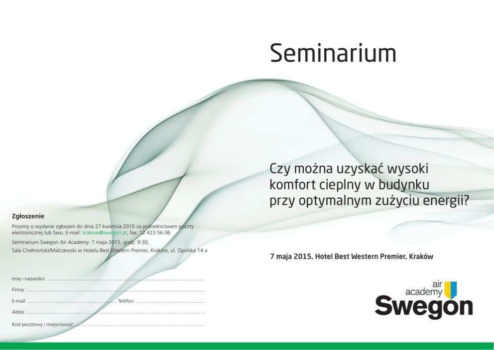 Seminarium Czy można uzyskać wysoki komfort cieplny w budynku przy optymalnym zużyciu energii? Zgłoszenie Prosimy o wysłanie zgłoszeń do dnia 27 kwietnia 2015 za pośrednictwem poczty elektronicznej lub faxu. E-mail: [email protected], fax: 12 423 56 06 Seminarium Swegon Air Academy: 7 maja 2015, godz. 9:30, Sala Chełmoński/Malczewski w Hotelu Best Western Premier, Kraków, ul. Opolska 14 a Imię i nazwisko: ................................................................................................................. Firma: ................................................................................................................................ E-mail: ................................................................ Telefon: ................................................. Adres: ................................................................................................................................ Kod pocztowy i miejscowość: ............................................................................................. 7 maja 2015, Hotel Best Western Premier, Kraków Naszymi prelegentami będą uznani w swych środowiskach specjaliści: Peter Simmonds, Ph. D. i Carlos Lisboa, Eng. PETER SIMMONDS, Ph.D., członek ASHRAE Managing Director/Principal Building and Systems Analytics LLC Marina del Rey, California i Hong Kong Peter Simmonds ma stopień inżyniera z Technical College w Reading w zakresie Inżynierii Mechanicznej i drugi z Badań i Rozwoju tej samej uczelni, tytuł magistra z HTS, Den Bosch, Holandia oraz tytuł doktora z T.U. Delft. Od 1989 roku jest członkiem ASHRAE. Dr Simmonds jest uznanym autorytetem w dziedzinie systemów chłodzenia i ogrzewania radiacyjnego, a także komfortu cieplnego. Od 1983 roku jest zaangażowany w tworzenie i rozwój belek pasywnych i aktywnych, zaprojektował też wiele systemów na całym świecie. W 1993 roku otrzymał Brązowy Medal Cartera. Jest autorem lub współautorem ponad 60 rozpraw naukowych, artykułów i książek. Jest członkiem kilku Komitetów Technicznych ASHRAE, a także jego wyróżnionym wykładowcą. Obecnie wykłada na Uniwersytecie Południowokalifornijskim. CARLOS LISBOA, Eng., Dyrektor BLC Navitas Lda. Carlos Lisboa jest profesjonalnym doradcą technicznym w zakresie efektywności energetycznej oraz ogrzewania, wentylacji i klimatyzacji zwłaszcza pod kątem projektowania instalacji HVAC, oceny systemów HVAC, symulacji zużycia energii, oceny i zarządzania zużyciem energii oraz jakości powietrza wewnątrz pomieszczeń. Carlos Lisboa piastuje stanowisko dyrektora BLC Navitas Lda., jest również zaangażowany w działalność stowarzyszeniową. Jest prezesem Portugalskiego Stowarzyszenia Inżynierów Chłodnictwa i Klimatyzacji (EFRIARC) i bierze udział w działalności ASHRAE w Portugalii. Carlos Lisboa wykłada również na Universidade Nova de Lisboa i jest autorem wielu artykułów na temat belek chłodzących, budynków zeroenergetycznych, symulacji zużyciem energii w budynkach i wentylacji. Jest jednym z autorów nowego podręcznika pt. „Active and Passive Beam Application Design Guide”, wydanego wspólnie przez ASHRAE i REHVA w 2015 roku. www.swegonairacademy.com Organizowane od kilku lat Swegon Air Academy to forum wymiany wiedzy i doświadczeń w szeroko pojętej dziedzinie wentylacji i klimatyzacji oraz w zagadnieniach pochodnych, związanych z kształtowaniem klimatu wewnętrznego. Swegon Air Academy przeznaczone jest zarówno dla profesjonalistów, jak i dla tych, którzy interesując się tą problematyką, chcą jedynie poszerzyć swoją wiedzę. Naszą ambicją jest stworzenie neutralnej i obiektywnej płaszczyzny, której głównymi animatorami będą ludzie związani z działalnością naukowo-badawczą. Mamy nadzieję, że w ten sposób ułatwimy Państwu poszukiwanie lepszych i nowocześniejszych rozwiązań. Doświadczenia praktyczne i wyniki badań uniwersyteckich są przekazywane podczas seminariów, w materiałach na stronach internetowych, w artykułach prasowych i literaturze technicznej. W tym roku pragniemy Państwa zaprosić na seminarium pod hasłem: „Czy można uzyskać wysoki komfort cieplny w budynku przy optymalnym zużyciu energii?” W ramach seminarium wygłoszone zostaną dwa wykłady: 1. Peter Simmonds „Budynki o wysokim standardzie i komforcie w pomieszczenich” 2. Carlos Lisboa „Projektowanie systemów belek indukcyjnych. Nowy poradnik ASHRAE/REHVA” Program seminarium: godz. 9:30 - 10:00 - rejestracja godz. 10:00 - 11:00 - wykład, Peter Simmonds godz. 11:00 - 11:15 - pytania i dyskusja godz. 11:15 - 11:45 - przerwa kawowa godz. 11:45 - 12:45 - wykład, Carlos Lisboa godz. 12:45 - 13:00 - pytania i dyskusja Po seminarium zapraszamy na lunch. Ze względów organizacyjnych prosimy o potwierdzenie udziału. Szczegóły na ostatniej stronie.