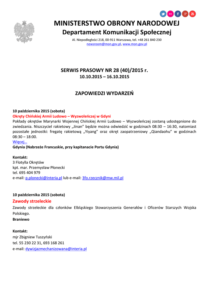 MINISTERSTWO OBRONY NARODOWEJ Departament Komunikacji Społecznej Al. Niepodległości 218, 00-911 Warszawa, tel. +48 261 840 230 [email protected], www.mon.gov.pl SERWIS PRASOWY NR 28 (40)/2015 r. 10.10.2015 – 16.10.2015 ZAPOWIEDZI WYDARZEŃ 10 października 2015 (sobota) Okręty Chińskiej Armii Ludowo – Wyzwoleńczej w Gdyni Pokłady okrętów Marynarki Wojennej Chińskiej Armii Ludowo – Wyzwoleńczej zostaną udostępnione do zwiedzania. Niszczyciel rakietowy „Jinan” będzie można odwiedzić w godzinach 08:30 – 16:30, natomiast pozostałe jednostki: fregatę rakietową „Yiyang” oraz okręt zaopatrzeniowy „Qiandaohu” w godzinach 08:30 – 18:00. Więcej… Gdynia (Nabrzeże Francuskie, przy kapitanacie Portu Gdynia) Kontakt: 3 Flotylla Okrętów kpt. mar. Przemysław Płonecki tel. 695 404 979 e-mail: [email protected] lub e-mail: [email protected] 10 października 2015 (sobota) Zawody strzeleckie Zawody strzeleckie dla członków Elbląskiego Stowarzyszenia Generałów i Oficerów Starszych Wojska Polskiego. Braniewo Kontakt: mjr Zbigniew Tuszyński tel. 55 230 22 31, 693 168 261 e-mail: [email protected] 12-24 października 2015 (poniedziałek-sobota) Szkolenie poligonowe Poligonowe szkolenie minerskie nurków minerów oraz nurków inżynierii. Ustka Kontakt: kmdr ppor. Jacek Kwiatkowski tel. 661 417 739 e-mail: [email protected] 12 października – 6 listopada 2015 (poniedziałek-piątek) Szkolenie Aviation Detachment W 33 Bazie Lotnictwa Transportowego odbędzie się szkolenie lotnicze komponentu amerykańskiego Aviation Detachment. Powidz Kontakt: Oficer prasowy kpt. Włodzimierz Baran tel. 723 689 321 e-mail: [email protected] 13 października 2015 (wtorek) Sekretarz stanu w MON z wizytą w Grudziądzu i Toruniu Sekretarz stanu w MON Czesław Mroczek będzie przebywał z wizytą roboczą w Centrum Szkolenia Logistyki oraz Centrum Szkolenia Artylerii i Uzbrojenia. Grudziądz, Toruń Kontakt: kpt. Tomasz Kisiel tel. 261 432 207, 727 012 336 e-mail: [email protected] 13-23 października 2015 (wtorek-piątek) Dragon-15 największe tegoroczne ćwiczenie WP W Ośrodku Szkolenia Poligonowego Wojsk Lądowych w Orzyszu zostanie przeprowadzone największe tegoroczne ćwiczenie Wojska Polskiego. Polscy żołnierze będą współdziałać z Amerykanami, Brytyjczykami, Kanadyjczykami oraz Niemcami. Zapraszamy przedstawicieli mediów do relacjonowania działań połączonych realizowanych przez współczesne siły zbrojne podczas ,,Dnia Dostojnych Gości”, który odbędzie się 16 października br. na orzyskim poligonie. Więcej… Orzysz Kontakt: ppłk Marek Pietrzak tel. 727 401 293 e-mail: [email protected] 13-15 października 2015 (wtorek-czwartek) Ćwiczenie Renegade/Sarex - 15/II Przeciwdziałanie atakom terrorystycznym z powietrza oraz prowadzenie akcji poszukiwawczo – ratowniczych w obszarze morskim i lądowym to zakres ćwiczenia Renegade/Sarex - 15/II prowadzonego przez Dowództwo Operacyjne Rodzajów Sił Zbrojnych. Więcej… Kraków, Gdynia, Kowary Kontakt: ppłk Piotr Walatek tel. 607 388 937 e-mail: [email protected] 13 października 2015 (wtorek) Uroczystości przed GNŻ Przed Grobem Nieznanego Żołnierza odbędą się uroczystości z udziałem króla Belgii. Warszawa, (pl. Marszałka Józefa Piłsudskiego) Kontakt: Rzecznik prasowy DGW ppłk Joanna Klejszmit-Bodziuch tel. 261 879102; 721810749 e-mail: [email protected] 14-15 października 2015 (środa-czwartek) Konferencja naukowa Międzynarodowa Konferencja Naukowa pt. Społeczeństwo a wojna. Konflikty kultur i problemy wielokulturowości we współczesnym świecie „SAW 2015". Góra Św. Anny Kontakt: Rzecznik prasowy WSOWL mjr Piotr Szczepański tel. 261 658 115, 601 922 784 e-mail: [email protected] 15 października 2015 (czwartek) Uroczystości rocznicowe Uroczystości z okazji upamiętnienia śmierci Tadeusza Kościuszki i rocznicy utworzenia Batalionów Chłopskich z udziałem Szkoły Podoficerskiej Wojsk Lądowych. Poznań Kontakt: chor. Marcin Szubert tel. 663 663 083, 261 575 349 e-mail: [email protected] 15-16 października 2015 (czwartek-piątek) Święto Wojsk Łączności i Informatyki W zegrzyńskim Centrum odbędą się obchody święta Wojsk Łączności i Informatyki. W Siłach Zbrojnych RP to święto obchodzone jest na pamiątkę wykonania stałego połączenia pocztowego pomiędzy Krakowem a Wenecją. To ważne przedsięwzięcie wykonano 18 października 1558 roku dzięki staraniom króla Zygmunta II Augusta. Zegrze Kontakt: kpt. Krzysztof Baran tel. 722 380 054, 261 883 378 e-mail: [email protected] 15-16 października 2015 (czwartek-piątek) III Międzynarodowe Targi Innowacji i Nowych Technologii INNO-TECH EXPO Targi INNO-TECH EXPO 2015 to jedno z najbardziej docenianych wydarzeń związanych z nowymi technologiami w Polsce, będące spotkaniem świata nauki i biznesu. Patronat honorowy nad targami objęła m. in. podsekretarz stanu w MON Beata Oczkowicz. Więcej… Kielce Kontakt: Świętokrzyskie Centrum Innowacji i Transferu Technologii Sp. z o.o. Anna Grys tel. 539 934 212 e-mail: [email protected] 15-17 października 2015 (czwartek-sobota) Zlot młodzieży PTTK Zabezpieczenie 55. Centralnego Zlotu Młodzieży PTTK „Palmiry”. Palmiry Kontakt: mjr Dariusz URBAN tel. 782 933 860 16 października 2015 (piątek) Wręczenie świadectw W Szkole Podoficerskiej Wojsk Lądowych odbędzie się uroczyste wręczenie świadectw żołnierzom korpusu szeregowych zawodowych po zakończonym szkoleniu na pierwszy stopień podoficerski . Poznań Kontakt: chor. Marcin Szubert tel. 663 663 083, 261 575 349 e-mail: [email protected], [email protected] KRONIKA 2 października 2015 (piątek) Minister Siemoniak w Agencji Mienia Wojskowego - Fuzje są trudne, ale przynoszą dobre rezultaty. Zależy nam, by efektywność działań wynikała ze wzajemnej synergii i konsolidacji – tymi słowami wicepremier, minister obrony narodowej, Tomasz Siemoniak podsumował proces połączenia dwóch age