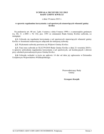 UCHWAŁA NR XXVIII/ 215 /2013 RADY GMINY KWILCZ z dnia 19 marca 2013 r. w sprawie regulaminu korzystania z sal sportowych stanowiących własność gminy Kwilcz Na podstawie art. 40 ust. 2 pkt. 4 ustawy z dnia 8 marca 1990 r. o samorządzie gminnym (t.j. Dz. U. z 2001 r. Nr 142, poz. 1591 ze zmianami) Rada Gminy Kwilcz uchwala, co następuje: § 1. Uchwala się regulamin korzystania z sal sportowych stanowiących własność gminy Kwilcz w brzmieniu stanowiącym załącznik do niniejszej uchwały. § 2. Wykonanie uchwały powierza się Wójtowi Gminy Kwilcz. § 3. Traci moc uchwała nr XLI/279/2010 Rady Gminy Kwilcz z dnia 21 września 2010 r. w sprawie uchwalenia regulaminu korzystania z sal sportowych, sal korekcyjnych i siłowni przy szkołach prowadzonych przez Gminę Kwilcz. § 4. Uchwała wchodzi w życie po upływie 14 dni od dnia jej ogłoszenia w Dzienniku Urzędowym Województwa Wielkopolskiego. Przewodniczący Rady Gminy Grzegorz Korpik ————————————————————————————————————————— Id: EAF3EB23-AB1F-41B9-AB45-583383DB4D3E. Podpisany Strona 1 ZAŁĄCZNIK do Uchwały Nr XXVIII/....../2013 Rady Gminy Kwilcz z dnia 19 marca 2013 r. w sprawie regulaminu korzystania z sal sportowych stanowiących własność gminy Kwilcz REGULAMIN KORZYSTANIA Z SAL SPORTOWYCH 1. Niniejszy regulamin określa zasady i tryb korzystania z sal sportowych na terenie gminy Kwilcz. 2. Ilekroć w niniejszym regulaminie jest mowa o: 1) sali sportowej, zwanej dalej salą - należy przez to rozumieć salę zlokalizowaną przy Szkole Podstawowej w Luboszu oraz salę zlokalizowaną przy Zespole Szkół w Kwilczu, 2) dyrektorze – należy przez to rozumieć odpowiednio dyrektora Szkoły Podstawowej w Luboszu oraz dyrektora Zespołu Szkół w Kwilczu, 3) grupie zorganizowanej – należy przez to rozumieć, co najmniej dwie osoby. 3. Korzystanie z sali jest uzależnione od organizacji pracy szkoły i odbywa się w czasie wolnym od zajęć szkolnych i pozaszkolnych, realizowanych z wykorzystaniem tej sali, zgodnie z ustalonym harmonogramem. 4. Terminy i godziny korzystania z sali ustala dyrektor szkoły, stosownie do pory roku i planu zajęć szkolnych, o których informację wywiesza przy wejściu do obiektu. 5. Udostępnianie sali następuje na podstawie umowy najmu, a uzyskane środki finansowe stanowią dochód budżetu gminy. 6. Wysokość cen i opłat za wynajem sali określają odrębne przepisy. 7. Sala służy przede wszystkim upowszechnianiu kultury fizycznej i uprawianiu sportu, w dalszej kolejności może być wynajmowana na inne cele. 8. Do korzystania z sali uprawnione są osoby indywidualne oraz grupy zorganizowane, które mają pierwszeństwo w korzystaniu z sali przed osobami indywidualnymi. 9. Grupy zorganizowane zobowiązane są do wyznaczenia opiekuna grupy, który ponosi odpowiedzialność za grupę i uprawniony jest do zawarcia umowy najmu. 10. Mieszkańcy gminy ponoszą opłatę stanowiącą 50% stawki ustalonej zgodnie z obowiązującym cennikiem, jeżeli skład osobowy grupy wynajmującej salę stanowią w połowie mieszkańcy gminy. ————————————————————————————————————————— Id: EAF3EB23-AB1F-41B9-AB45-583383DB4D3E. Podpisany Strona 2 11. W przypadku, kiedy wynajmującym jest jeden mieszkaniec gminy, przepis ust. 10 stosuje się odpowiednio. 12. Opłatę w wysokości 2% stawki ustalonej zgodnie z obowiązującym cennikiem wnoszą: 1) dzieci i uczniowie szkół i przedszkola prowadzonych przez gminę oraz uczniowie szkół ponadgimnazjalnych, zamieszkałych na terenie gminy, 2) kluby sportowe działające na terenie gminy, 3) organizatorzy imprez, po uzyskaniu zgody Wójta Gminy Kwilcz. 13. Zasad określonych w ust. 10, 11 i 12 nie stosuje się w odniesieniu do osób korzystających z Sali w celach komercyjnych. 14. Korzystający z sali mają jednocześnie prawo do korzystania z szatni, toalet i korytarza w czasie, który obejmuje umowa najmu. 15. Wynajmujący salę korzystają z własnego sprzętu sportowego (piłki, stroje, obuwie sportowe, itp.). 16. Osoby korzystające z sali zobowiązane są do zapoznania się z niniejszym regulaminem i jego bezwzględnego przestrzegania. 17. Z sali korzystać nie mogą osoby, których stan wskazuje na spożycie alkoholu lub środków odurzających. 18. Osoby do lat 18 mogą korzystać z sali wyłącznie pod opieką pełnoletnich opiekunów. 19. Korzystających z sali obowiązują wynikające z niniejszego regulaminu oraz przepisów odrębnych zakazy: 1) używania obuwia i stroju innego niż sportowe, 2) wnoszenia materiałów pirotechnicznych, napojów zawierających alkohol, szkodliwych substancji chemicznych, broni i innych przedmiotów niebezpiecznych dla zdrowia i życia korzystających z sali, 3) palenia tytoniu i spożywania alkoholu, 4) pozostawiania śmieci i odpadów, 5) wprowadzania zwierząt bez zgody wynajmującego, 6) wprowadzania i użytkowania sprzętu niezgodnego z przeznaczeniem sali, 7) nieobyczajnego zachowania i używania wulgarnego słownictwa, 8) zakłócania porządku i zakłócania korzystania z sali, 9) korzystania z wyposażenia sali w sposób niezgodny z przeznaczeniem, 10) biegania po korytarzach, schodach itp. oraz stwarzania zagrożenia narażającego siebie i innych na utratę zdrowia lub kalectwo, 11) korzystania z sali bez zgody dyrektora szkoły. ————————————————————————————————————————— Id: EAF3EB23-AB1F-41B9-AB45-583383DB4D3E. Podpisany Strona 3 19. Obowiązkiem osób korzystających z sali jest: 1) pozostawienie okryć zewnętrznych i obuwia w szatni, 2) używanie stroju sportowego i właściwego obuwia sportowego - tzw. "halówki" (czystego, najlepiej z jasną podeszwą, nie pozostawiającego podczas użytkowania hali sportowej zabrudzeń, rys itp.) 3) przestrzeganie zasad bezp