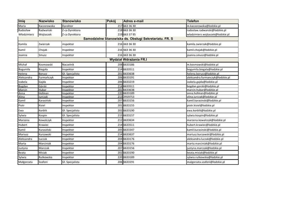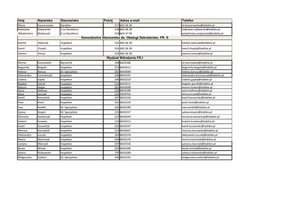 Imię Nazwisko Stanowisko Maria Radosław Włodzimierz Kaczorowska Radwański Wojtaszek Dyrektor Z-ca Dyrektora Z-ca Dyrektora Kamila Zwierzak inspektor Pokój Adres e-mail 217 663 36 30 218 663 36 30 219 663 37 95 Telefon [email protected] [email protected] [email protected] Samodzielne Stanowiska ds. Obsługi Sekretariatu. FR. S 216 663 36 30 [email protected] Kamil Chojak Inspektor 216 663 36 30 [email protected] Joanna Smusz Inspektor 216 663 36 30 [email protected] Wydział Wdrażania FR.I Michał Kosmowski Naczelnik 208 6633186 [email protected] Bogumiła Helena Aleksandra Izabela Bogdan Marcin Anna Alina Kamil Biegała Borucz Furmańczyk Gajda Górski Hubar Hofman Jurczak Karasiński Inspektor Gł. Specjalista Inspektor Inspektor Inspektor Inspektor Inspektor Inspektor Inspektor 214 201 206 206 214 201 220 213 207 [email protected] [email protected] [email protected] [email protected] [email protected] [email protected] [email protected] [email protected] [email protected] Piotr Kisiel Inspektor 201 6633155 [email protected] 6633511 6633638 6633191 6633219 6633511 6633638 6633189 2919753 6633156 Ewa Korblit Gł. Specjalista 202 6633190 [email protected] Sylwia Kospin Gł. Specjalista 215 6633157 [email protected] Marzena Kowalczyk Inspektor 212 6633634 [email protected] Hubert Krawiec Inspektor 214 6633511 [email protected] Kamil Kurasiński Inspektor 205 6633347 [email protected] Mariusz Kurzawski Inspektor 214 6633637 [email protected] Aleksandra Marta Justyna Beata Łuczak Marciniak Marczak Misiak Inspektor Inspektor Inspektor Inspektor 204 204 207 202 6633176 6633176 6633156 6633190 [email protected] [email protected] [email protected] [email protected] Sylwia Rutkowska Inspektor 220 6633189 [email protected] Małgorzata Szafoni Gł. Specjalista 206 6633191 [email protected] Mateusz Maria Piotr Marta Aneta Winnicki Wojciechowska Wrona Zachmacz Zasada Inspektor Gł. Specjalista Inspektor Gł. Specjalista Podinspektor 205 215 201 220 214 6633347 6633157 6633155 6633189 6633633 [email protected] [email protected] [email protected] [email protected] [email protected] Wydział Pomocy Technicznej, FR.II Jarosław Małgorzata Jamroz Sibińska Naczelnik Gł. Specjalista Gł. Specjalista 1003 6633180 1001 6633202 6633188 1001 6633188 1001 6633394 [email protected] [email protected] [email protected] [email protected] [email protected] Anna Rzeźnik-Osuwniak Gł. Specjalista Ewa Adamiec Sebastian Szymański Gł. Specjalista 1001 6633234 [email protected] Anna Natalia Magdalena Lidia Małgorzata Włodarczyk Kudra Marjan Bilska Inspektor Inspektor Inspektor Inspektor Inspektor 1001 1001 1001 1001 1001 [email protected] [email protected] [email protected] [email protected] [email protected] Kochanowska Mirosława Emilia Dorota Jakiel Urbaniak Łęgocka Naczelnik Gł. Specjalista Inspektor Agata 6633188 6633187 2919735 6633077 2919734 Wydział Płatności FR.III 619 6633181 618 6633466 616 6633193 [email protected] [email protected] [email protected] Krzemińska - Król Inspektor 615 2919709 [email protected] Karolina Piotr Marlena Marta Sebastian Warych Kubiak Łuczak Krawczykowska Krawczykowski 615 611 603 611 603 [email protected] [email protected] [email protected] [email protected] [email protected] Anna Kłosowska Specjalista 602 6633214 [email protected] Mateusz Katarzyna Żyndul Kudelska Inspektor Gł. Specjalista 602 6633214 601 2919744 [email protected] [email protected] Szymon Jacek Anna Karolina Rogalski Wojtunik Rutkowska Warych Inspektor Gł. Specjalista Inspektor Inspektor 601 601 201 201 [email protected] [email protected] [email protected] [email protected] Ewelina Aleksandra Ryszard Zielińska Królak Inspektor Gł. Specjalista Inspektor Inspektor Inspektor Inspektor Inspektor Inspektor 2919709 2919736 6633212 6639736 6633212 6633179 6633177 6633269 6633269 Samodzielne Stanowiska ds. Sprawozdawczości i Monitoringu. FRS Lewandowski 203 6633076 203 6633154 203 6633076 [email protected] [email protected] [email protected]