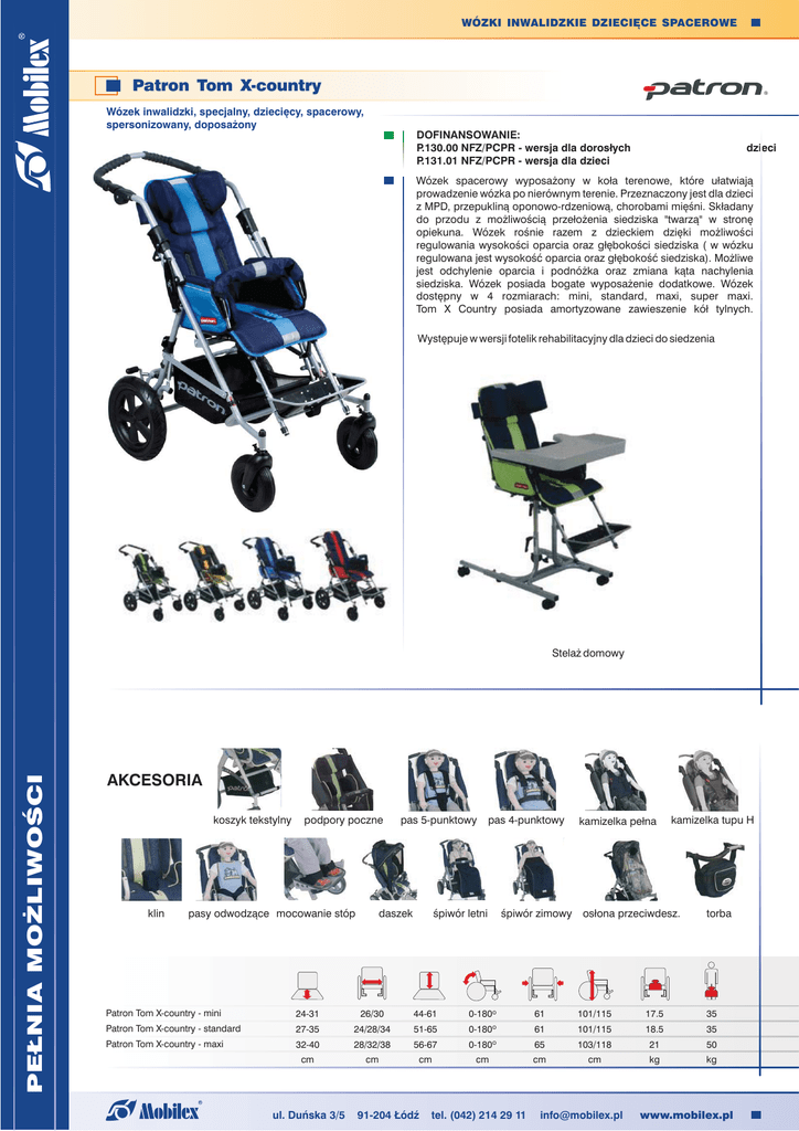WÓ ZKI INWALIDZKIE DZIECIĘCE SPACEROWE Patron Tom X-country Wózek inwalidzki, specjalny, dziecięcy, spacerowy, spersonizowany, doposażony DOFINANSOWANIE: P.130.00 NFZ/PCPR - wersja dla dorosłych P.131.01 NFZ/PCPR - wersja dla dzieci dzieci Wózek spacerowy wyposa¿ony w ko³a terenowe, które u³atwiaj¹ prowadzenie wózka po nierównym terenie. Przeznaczony jest dla dzieci z MPD, przepuklin¹ oponowo-rdzeniow¹, chorobami miêœni. Sk³adany do przodu z mo¿liwoœci¹ prze³o¿enia siedziska "twarz¹" w stronê opiekuna. Wózek roœnie razem z dzieckiem dziêki mo¿liwoœci regulowania wysokoœci oparcia oraz g³êbokoœci siedziska ( w wózku regulowana jest wysokoœæ oparcia oraz g³êbokoœæ siedziska). Mo¿liwe jest odchylenie oparcia i podnó¿ka oraz zmiana k¹ta nachylenia siedziska. Wózek posiada bogate wyposa¿enie dodatkowe. Wózek dostêpny w 4 rozmiarach: mini, standard, maxi, super maxi. Tom X Country posiada amortyzowane zawieszenie kó³ tylnych. Występuje w wersji fotelik rehabilitacyjny dla dzieci do siedzenia PEŁNIA MOŻLIWOŚ CI Stelaż domowy AKCESORIA koszyk tekstylny klin podpory poczne pasy odwodzące mocowanie stóp pas 5-punktowy pas 4-punktowy śpiwór letni daszek śpiwór zimowy kamizelka pełna kamizelka tupu H osłona przeciwdesz. torba Patron Tom X-country - mini 24-31 26/30 44-61 0-180o 61 101/115 17.5 Patron Tom X-country - standard 27-35 24/28/34 51-65 0-180o 61 101/115 18.5 35 Patron Tom X-country - maxi 32-40 28/32/38 56-67 0-180o 65 103/118 21 50 cm cm cm cm cm cm kg kg ul. Duńska 3/5 91-204 Łódź tel. (042) 214 29 11 [email protected] 35 www.mobilex.pl