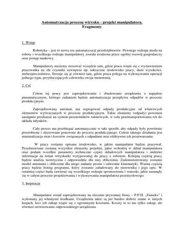 Automatyzacja procesu wtrysku - projekt manipulatora. Fragmenty 1. Wstęp Robotyka – jest to nowa era automatyzacji przedsiębiorstw. Pewnego rodzaju moda na roboty i wszelkiego rodzaju manipulatory została zrodzona przez ogólny rozwój gospodarczy oraz postęp naukowy. Manipulatory możemy stosować wszędzie tam, gdzie praca wiąże się z wystawieniem pracownika na złe czynniki zewnętrze np. toksyczne środowisko pracy, duże wysokości, niebezpieczeństwo. Stosuje się je również tam, gdzie praca polega na wykonywaniu operacji jednego typu, przytłaczających człowieka swoja monotonią. 2. Cel Celem tej pracy jest zaprojektowanie i zbudowanie urządzenia o napędzie pneumatycznym, którego zadaniem będzie automatyzacja przepływu odpadów w procesie produkcyjnym. Zaprojektowany automat, ma segregować odpady produkcyjne od właściwych elementów wytwarzanych w procesie produkcyjnym. Takie elementy (odpady) powinien następnie przekazać na system przenośników taśmowych, w celu przetransportowania ich do układu młynków. Cały proces ma przebiegać automatycznie w taki sposób, aby odpady były powtórnie przerobione i skierowane ponownie do procesu produkcyjnego. Celem takiego działania jest minimalizacja strat i kosztów związanych z odpadami oraz efektywne ich przetwarzanie. W pracy zostanie opisane środowisko, w jakim manipulator będzie pracował. Przedstawione zostaną wszystkie elementy projektu, jakie wchodzą w skład manipulatora oraz podam wszelkie parametry techniczne części składowych manipulatora i niektóre informacje na temat wtryskarki wytypowanej do pracy z robotem. Kolejną częścią pracy będzie analiza teoretyczna i odpowiednie dla niej obliczenia. Zademonstrowany zostanie model automatu i obliczone dla niego zadanie proste i odwrotne kinematyki. Ważną częścią pracy będzie listing programu, który zostanie załadowany do sterownika i jego opis. W ostatniej części będą zawierać się wszelkiego rodzaju spostrzeżenia i wnioski, jakie nasunęły się w całym procesie projektowania i wykonywania manipulatora przemysłowego 3. Inspiracja Manipulator został zaprojektowany na zlecenie prywatnej firmy – P.P.H. „Fameks” i wykonany jej własnymi środkami. Urządzenia takie są już bardzo dobrze znane w innych krajach, lecz ich zakup wiąże się z ogromnymi kosztami. Koszty te to nie tylko zakup, ale również serwisowanie odpowiedniego urządzenia. Głównym założeniem projektu jest całkowita automatyzacja stanowiska roboczego do produkcji łyżeczki jednorazowej z tworzywa sztucznego. Robot, który jest przedmiotem pracy dyplomowej, powinien mieć konstrukcję i właściwości podobne do manipulatorów innych firm pokazywanych na różnego rodzaju targach i sympozjach. Zakład produkcyjny, który jest zleceniodawcą poniższego projektu, postanowił zaimplementować ideę zakładu w pełni zautomatyzowanego, bezpiecznego i w pierwszej kolejności higienicznego oraz wysoko wydajnego. Manipulator ma być elementem dodatkowym do systemu produkcyjnego, który wyeliminuje konieczność stosowania ludzkiej siły roboczej. 4. Korzyści ekonomiczne Zastosowanie manipulatora w przedsiębiorstwie ma kilka podstawowych celów ekonomicznych: • Usprawnienie przepływu materiału w procesie technologicznym • Minimalizacja wielkości stanowiska produkcyjnego • Minimalizacja kosztów poprzez likwidację miejsca pracy osoby, której zadania przejmie manipulator Zastosowanie automatu zbudowanego na podstawie tego projektu spowoduje usunięcie, co najmniej jednej osoby z całego procesu produkcyjnego. Do tej pory przynajmniej jeden pracownik musiał znajdować się bezpośrednio przy maszynie i wybierać z odpowiedniego przenośnika taśmowego odpady. Odpadami produkcyjnymi są tzw. wlewki. Wlewek jest niczym innym, jak tylko zastygłym tworzywem sztucznym (najczęściej polistyren), które wcześniej, w fazie uplastyczniania podawane było przez odpowiednie kanały formy do jej gniazd. Odpady produkcyjne mieszały się z właściwymi elementami produkowanymi na danej maszynie. Ponieważ temperatura gotowych elementów jest znaczna zdarzało się, że elementy te ulegały sklejeniu z odpadami. Powodowało to niewielkie straty w skali jednej zmiany, lecz znaczne w skali całego tygodnia pracy maszyny. Manipulator wyeliminuje konieczność zatrudniania pracownika do takiej selekcji, co za tym idzie praca całego stanowiska będzie bardziej higieniczna. Selekcja odpadów od właściwych elementów wiązała się z koniecznością umieszczenia w bezpośrednim otoczeniu maszyny pojemników na odpady, gdzie były chwilowo składowane. Po pewnym czasie, najczęściej kilka razy w ciągu jednaj zmiany, pojemniki były przenoszone do stanowiska, gdzie mielono odpady. Cała operacja była czasochłonna i wprowadzała niepotrzebne komplikacje i ruch dodatkowych osób w otoczeniu stanowiska produkcyjnego. Oczywiste było dla kierownictwa zakładu, że taka sytuacja musi być niezwłocznie wyeliminowana. Wiąże się to z bezpieczeństwem pracy. Manipulator zostanie zamontowany bezpośrednio na maszynie, co spowoduje efektywne zagospodarowanie przestrzeni, którą zajmowały pojemniki na odpady. Automat zaraz po fazie wtrysku przechwyci za pomocą odpowiednich szczęk członu wykonawczego odpady i nie dopuści do wymieszania się ich z elementami właściwymi, a następnie przekaże je na przenośnik taśmowy, który zakończony jest młynkiem. W ten sposób przepływ materiału zostanie usprawniony i znacznie przyspieszony. 5. Opis maszyny i sterowania Manipulator został zaprojektowany dla maszyny występującej pod handlową nazwą BA 2700 firmy Battenfeld. Wtryskarki tego rodzaju są zaprojektowane specjalnie dla obróbki tworzyw termoplastycznych, PVC i elastomerów. Wtryskarka ta posiada jednostkę zamykającą typu podwójnego. Zalety stosowania takiego systemu polegają na jego kinematyce: • Wysokie prędkości otwierania i zamykania • Do