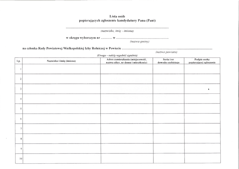 Lista osób popierających zgłoszenie k a n d y d a t u r y Pana (Pani) (nazwisko, imię - imiona) w okręgu wyborczym nr w (nazwa gminy) na członka Rady Powiatowej Wielkopolskiej Izby Rolniczej w Powiecie (nazwa (Uwaga Lp. Nazwisko i imię (imiona) - należy wypełnić powiatu.) czytelnie) Adres zamieszkania (miejscowość, n a z w a ulicy, n r d o m u i m i e s z k a n i a ) Seria i nr d o w o d u osobistego Podpis osoby p o p i e r a j ą c e j zgłoszenie 1 2 ji 4 5 6 7 8 9 10 %