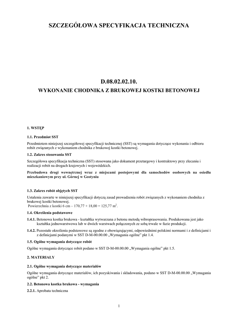 SZCZEGÓŁOWA SPECYFIKACJA TECHNICZNA D.08.02.02.10. WYKONANIE CHODNIKA Z BRUKOWEJ KOSTKI BETONOWEJ 1. WSTĘP 1.1. Przedmiot SST Przedmiotem niniejszej szczegółowej specyfikacji technicznej (SST) są wymagania dotyczące wykonania i odbioru robót związanych z wykonaniem chodnika z brukowej kostki betonowej. 1.2. Zakres stosowania SST Szczegółowa specyfikacja techniczna (SST) stosowana jako dokument przetargowy i kontraktowy przy zlecaniu i realizacji robót na drogach krajowych i wojewódzkich. Przebudowa drogi wewnętrznej wraz z miejscami postojowymi dla samochodów osobowych na osiedlu mieszkaniowym przy ul. Górnej w Gostyniu 1.3. Zakres robót objętych SST Ustalenia zawarte w niniejszej specyfikacji dotyczą zasad prowadzenia robót związanych z wykonaniem chodnika z brukowej kostki betonowej. Powierzchnia z kostki 6 cm – 170,77 + 18,00 = 125,77 m2. 1.4. Określenia podstawowe 1.4.1. Betonowa kostka brukowa - kształtka wytwarzana z betonu metodą wibroprasowania. Produkowana jest jako kształtka jednowarstwowa lub w dwóch warstwach połączonych ze sobą trwale w fazie produkcji. 1.4.2. Pozostałe określenia podstawowe są zgodne z obowiązującymi, odpowiednimi polskimi normami i z definicjami i z definicjami podanymi w SST D-M-00.00.00 „Wymagania ogólne” pkt 1.4. 1.5. Ogólne wymagania dotyczące robót Ogólne wymagania dotyczące robót podano w SST D-M-00.00.00 „Wymagania ogólne” pkt 1.5. 2. MATERIAŁY 2.1. Ogólne wymagania dotyczące materiałów Ogólne wymagania dotyczące materiałów, ich pozyskiwania i składowania, podano w SST D-M-00.00.00 „Wymagania ogólne” pkt 2. 2.2. Betonowa kostka brukowa - wymagania 2.2.1. Aprobata techniczna 1 Warunkiem dopuszczenia do stosowania betonowej kostki brukowej w budownictwie drogowym jest posiadanie aprobaty technicznej, wydanej przez uprawnioną jednostkę. 2.2.2. Wygląd zewnętrzny Struktura wyrobu powinna być zwarta, bez rys, pęknięć, plam i ubytków. Powierzchnia górna kostek powinna być równa i szorstka, a krawędzie kostek równe i proste, wklęśnięcia nie powinny przekraczać 2 mm dla kostek o grubości ≤ 80 mm. 2.2.3. Kształt, wymiary i kolor kostki brukowej Do wykonania nawierzchni chodnika stosuje się betonową kostkę brukową o grubości 60 i 80 mm. Kostki o takiej grubości są produkowane w kraju. Tolerancje wymiarowe wynoszą: − na długości ± 3 mm, − na szerokości ± 3 mm, − na grubości ± 5 mm. Kolory kostek produkowanych aktualnie w kraju to: szary, ceglany, klinkierowy, grafitowy i brązowy. 2.2.4. Cechy fizykomechaniczne betonowych kostek brukowych Betonowe kostki brukowe powinny mieć cechy fizykomechaniczne określone w tablicy 1. Tablica 1. Cechy fizykomechaniczne betonowych kostek brukowych Lp. 1 Cechy Wartość Wytrzymałość na ściskanie po 28 dniach, MPa, co najmniej a) średnia z sześciu kostek b) najmniejsza pojedynczej kostki 60 50 2 Nasiąkliwość wodą wg PN-B-06250 [2], %, nie więcej niŜ 5 3 Odporność na zamraŜanie, po 50 cyklach zamraŜania, wg PN-B06250 [2]: a) pęknięcia próbki b) strata masy, %, nie więcej niŜ c) obniŜenie wytrzymałości na ściskanie w stosunku do wytrzymałości próbek nie zamraŜanych, %, nie więcej niŜ brak 5 Ścieralność na tarczy Boehmego wg PN-B-04111 [1], mm, nie więcej niŜ 4 4 20 2.3. Materiały do produkcji betonowych kostek brukowych 2.3.1. Cement Do produkcji kostki brukowej naleŜy stosować cement portlandzki, bez dodatków, klasy nie niŜszej niŜ „32,5”. Zaleca się stosowanie cementu o jasnym kolorze. Cement powinien odpowiadać wymaganiom PN-B-19701 [4]. 2.3.2. Kruszywo do betonu NaleŜy stosować kruszywa mineralne odpowiadające wymaganiom PN-B-06712 [3]. Uziarnienie kruszywa powinno być ustalone w recepcie laboratoryjnej mieszanki betonowej, przy załoŜonych parametrach wymaganych dla produkowanego wyrobu. 2.3.3. Woda Woda powinna być odmiany „1” i odpowiadać wymaganiom PN-B-32250 [5]. 2.3.4. Dodatki Do produkcji kostek brukowych stosuje się dodatki w postaci plastyfikatorów i barwników, zgodnie z receptą laboratoryjną. Plastyfikatory zapewniają gotowym wyrobom większą wytrzymałość, mniejszą nasiąkliwość i większą odporność na niskie temperatury i działanie soli. Stosowane barwniki powinny zapewnić kostce trwałe wybarwienie. Powinny to być barwniki nieorganiczne. 2 3. SPRZĘT 3.1. Ogólne wymagania dotyczące sprzętu Ogólne wymagania dotyczące sprzętu podano w SST D-M-00.00.00 „Wymagania ogólne” pkt 3. 3.2. Sprzęt do wykonania chodnika z kostki brukowej Małe powierzchnie chodnika z kostki brukowej wykonuje się ręcznie. Jeśli powierzchnie są duŜe, a kostki brukowe mają jednolity kształt i kolor, moŜna stosować mechaniczne urządzenia układające. Urządzenie składa się z wózka i chwytaka sterowanego hydraulicznie, słuŜącego do przenoszenia z palety warstwy kostek na miejsce ich ułoŜenia. Do zagęszczenia nawierzchni stosuje się wibratory płytowe z osłoną z tworzywa sztucznego. 4. TRANSPORT 4.1. Ogólne wymagania dotyczące transportu Ogólne wymagania dotyczące transportu podano w SST D-M-00.00.00 „Wymagania ogólne” pkt 4. 4.2. Transport betonowych kostek brukowych Uformowane w czasie produkcji kostki betonowe układane są warstwowo na palecie. Po uzyskaniu wytrzymałości betonu min. 0,7 wytrzymałości projektowanej, kostki przewoŜone są na stanowisko, gdzie specjalne urządzenie pakuje je w folię i spina taśmą stalową, co gwarantuje transport samochodami w nienaruszonym stanie. Kostki betonowe moŜna równieŜ przewozić samochodami na paletach transportowych producenta. 5. WYKONANIE ROBÓT 5.1. Ogólne zasady wykonania robót Ogólne zasady wykonania robót podano w SST D-M-00.00.00 „Wymagania ogólne” pkt 5. 5.2. Koryto pod chodnik Koryto wykonane w podłoŜu powinno być wyprofilowane zgodnie z projektowanymi spadkami podłuŜnymi i poprzecznymi oraz zgodnie z wymaganiami podanymi w SST D-04.01.01 
