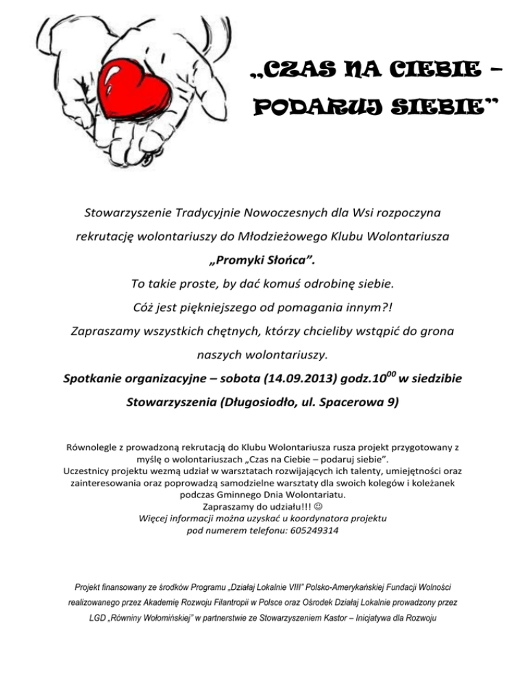 „CZAS NA CIEBIE – PODARUJ SIEBIE” Stowarzyszenie Tradycyjnie Nowoczesnych dla Wsi rozpoczyna rekrutację wolontariuszy do Młodzieżowego Klubu Wolontariusza „Promyki Słońca”. To takie proste, by dać komuś odrobinę siebie. Cóż jest piękniejszego od pomagania innym?! Zapraszamy wszystkich chętnych, którzy chcieliby wstąpić do grona naszych wolontariuszy. Spotkanie organizacyjne – sobota (14.09.2013) godz.1000 w siedzibie Stowarzyszenia (Długosiodło, ul. Spacerowa 9) Równolegle z prowadzoną rekrutacją do Klubu Wolontariusza rusza projekt przygotowany z myślę o wolontariuszach „Czas na Ciebie – podaruj siebie”. Uczestnicy projektu wezmą udział w warsztatach rozwijających ich talenty, umiejętności oraz zainteresowania oraz poprowadzą samodzielne warsztaty dla swoich kolegów i koleżanek podczas Gminnego Dnia Wolontariatu. Zapraszamy do udziału!!! Więcej informacji można uzyskać u koordynatora projektu pod numerem telefonu: 605249314 Projekt finansowany ze środków Programu „Działaj Lokalnie VIII” Polsko-Amerykańskiej Fundacji Wolności realizowanego przez Akademię Rozwoju Filantropii w Polsce oraz Ośrodek Działaj Lokalnie prowadzony przez LGD „Równiny Wołomińskiej” w partnerstwie ze Stowarzyszeniem Kastor – Inicjatywa dla Rozwoju