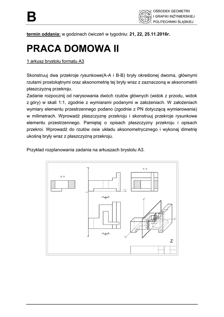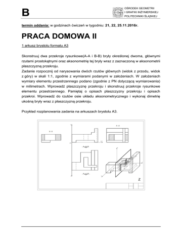 B OŚRODEK GEOMETRII I GRAFIKI INŻYNIERSKIEJ POLITECHNIKI ŚLĄSKIEJ termin oddania: w godzinach ćwiczeń w tygodniu: 21, 22, 25.11.2016r. PRACA DOMOWA II 1 arkusz brystolu formatu A3 Skonstruuj dwa przekroje rysunkowe(A-A i B-B) bryły określonej dwoma, głównymi rzutami prostokątnymi oraz aksonometrię tej bryły wraz z zaznaczoną w aksonometrii płaszczyzną przekroju. Zadanie rozpocznij od narysowania dwóch rzutów głównych (widok z przodu, widok z góry) w skali 1:1, zgodnie z wymiarami podanymi w założeniach. W założeniach wymiary elementu przestrzennego podano (zgodnie z PN dotyczącą wymiarowania) w milimetrach. Wprowadź płaszczyznę przekroju i skonstruuj przekroje rysunkowe elementu przestrzennego. Pamiętaj o opisach płaszczyzny przekroju i opisach przekroi. Wprowadź do rzutów osie układu aksonometrycznego i wykonaj dimetrię ukośną bryły wraz z płaszczyzną przekroju. Przykład rozplanowania zadania na arkuszach brystolu A3.