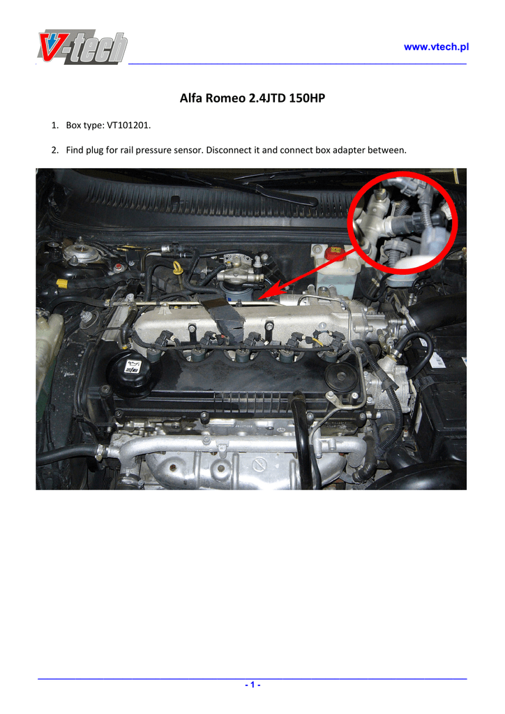 www.vtech.pl ____________________________________________________________________________ Alfa Romeo 2.4JTD 150HP 1. Box type: VT101201. 2. Find plug for rail pressure sensor. Disconnect it and connect box adapter between. ___________________________________________________________________________________________ -1-