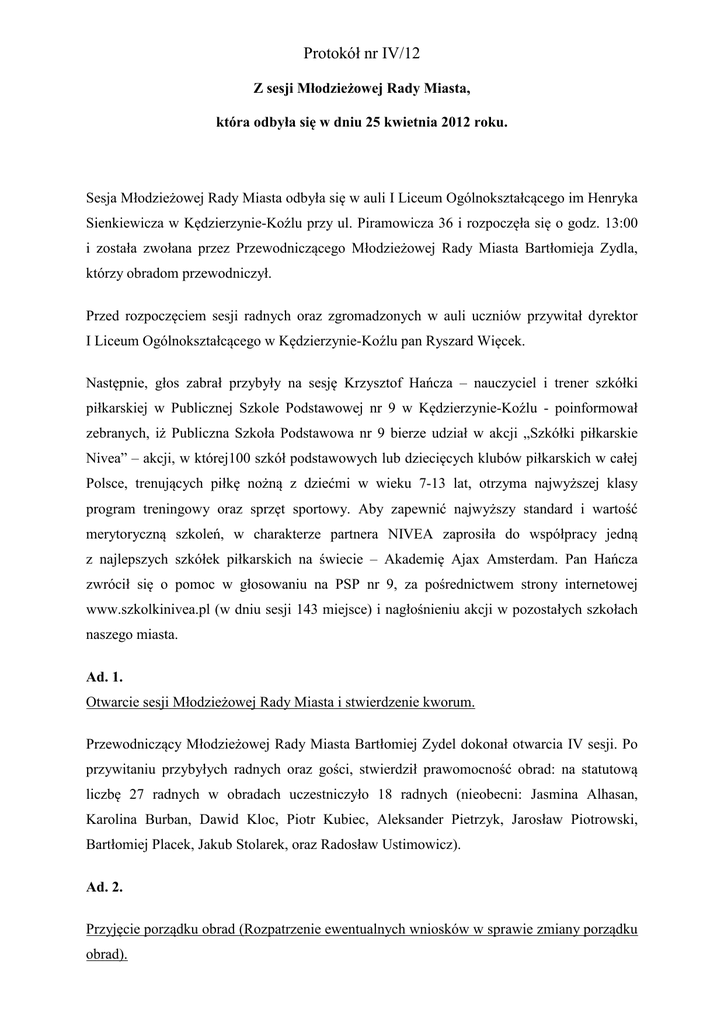 Protokół nr IV/12 Z sesji Młodzieżowej Rady Miasta, która odbyła się w dniu 25 kwietnia 2012 roku. Sesja Młodzieżowej Rady Miasta odbyła się w auli I Liceum Ogólnokształcącego im Henryka Sienkiewicza w Kędzierzynie-Koźlu przy ul. Piramowicza 36 i rozpoczęła się o godz. 13:00 i została zwołana przez Przewodniczącego Młodzieżowej Rady Miasta Bartłomieja Zydla, którzy obradom przewodniczył. Przed rozpoczęciem sesji radnych oraz zgromadzonych w auli uczniów przywitał dyrektor I Liceum Ogólnokształcącego w Kędzierzynie-Koźlu pan Ryszard Więcek. Następnie, głos zabrał przybyły na sesję Krzysztof Hańcza – nauczyciel i trener szkółki piłkarskiej w Publicznej Szkole Podstawowej nr 9 w Kędzierzynie-Koźlu - poinformował zebranych, iż Publiczna Szkoła Podstawowa nr 9 bierze udział w akcji „Szkółki piłkarskie Nivea” – akcji, w której100 szkół podstawowych lub dziecięcych klubów piłkarskich w całej Polsce, trenujących piłkę nożną z dziećmi w wieku 7-13 lat, otrzyma najwyższej klasy program treningowy oraz sprzęt sportowy. Aby zapewnić najwyższy standard i wartość merytoryczną szkoleń, w charakterze partnera NIVEA zaprosiła do współpracy jedną z najlepszych szkółek piłkarskich na świecie – Akademię Ajax Amsterdam. Pan Hańcza zwrócił się o pomoc w głosowaniu na PSP nr 9, za pośrednictwem strony internetowej www.szkolkinivea.pl (w dniu sesji 143 miejsce) i nagłośnieniu akcji w pozostałych szkołach naszego miasta. Ad. 1. Otwarcie sesji Młodzieżowej Rady Miasta i stwierdzenie kworum. Przewodniczący Młodzieżowej Rady Miasta Bartłomiej Zydel dokonał otwarcia IV sesji. Po przywitaniu przybyłych radnych oraz gości, stwierdził prawomocność obrad: na statutową liczbę 27 radnych w obradach uczestniczyło 18 radnych (nieobecni: Jasmina Alhasan, Karolina Burban, Dawid Kloc, Piotr Kubiec, Aleksander Pietrzyk, Jarosław Piotrowski, Bartłomiej Placek, Jakub Stolarek, oraz Radosław Ustimowicz). Ad. 2. Przyjęcie porządku obrad (Rozpatrzenie ewentualnych wniosków w sprawie zmiany porządku obrad). Do przesłanego radnym porządku obrad nie wprowadzono zmian, Rada jednogłośnie przyjęła porządek obrad IV sesji Młodzieżowej Rady Miasta. Obradowano zgodnie z zaproponowanym porządkiem obrad: 1. Otwarcie Sesji i stwierdzenie prawomocności obrad. 2. Przyjęcie porządku obrad (Rozpatrzenie ewentualnych wniosków w sprawie zmiany porządku obrad). 3. Przyjęcie protokołu z III Sesji Młodzieżowej Rady Miasta. 4. Sprawozdanie Przewodniczącego z prac Zarządu w okresie międzysesyjnym. 5. Podjęcie uchwał w sprawach: a) przyjęcia Kadencyjnego Programu Działania Młodzieżowej Rady Miasta Kędzierzyn-Koźle na lata 2012-2013; b) utworzenia nagrody Młodzieżowej Rady Miasta Kędzierzyn-Koźle: „Przyjaciel dzieci i młodzieży Kędzierzyna-Koźla”; c) ogłoszenie konkursu na logo Młodzieżowej Rady Miasta Kędzierzyn-Koźle; d) zmiana uchwały Nr II/5/12 Młodzieżowej Rady Miasta Kędzierzyn-Koźle z dnia 3 lutego 2012r. w sprawie ustalenia liczby, nazwy i zakresów zadań oraz liczebności komisji problemowych Młodzieżowej Rady Miasta KędzierzynKoźle. 6. PRZERWA na spotkanie robocze komisji problemowych w sprawie pomysłów na organizację wydarzenia w związku z dniem 1 czerwca. 7. Dyskusja nt. wniosków ze spotkań roboczych komisji. 8. Wolne wnioski. 9. Zakończenie sesji. Ad. 3. Przyjęcie protokołu z III Sesji Młodzieżowej Rady Miasta. Przewodniczący Młodzieżowej Rady Miasta Bartłomiej Zydel poinformował, iż protokół z III sesji był udostępniony do wglądu, a radni nie zgłosili żadnych uwag i zastrzeżeń, co do jego treści. Przewodniczący wniósł o przyjęcie protokołu z III Sesji Młodzieżowej Rady Miasta. Radni w wyniku jawnego głosowania, jednogłośnie przyjęli protokół z III sesji. Ad. 4. Sprawozdanie Przewodniczącego z prac Zarządu w okresie międzysesyjnym. Przewodniczący obrad przedstawił wydarzenia, które miały miejsce w okresie międzysesyjnym: − odczytał stanowisko Prezydenta Miasta Kędzierzyna-Koźle, przesłane przez działającego z jego upoważnienia Kierownika Wydziału Działalności Gospodarczej Urzędu Miasta Kędzierzyn-Koźle – Macieja Barcia – w sprawie złożonej przez Przewodniczącego MRM propozycji uruchomienia kursów nocnych autobusów (pismo sygn.Or.0031.32.2012). Przewodniczący zwrócił uwagę, iż na stronie internetowej www.kedzierzynkozle.pl została utworzona ankieta ww. sprawie. − poinformował o spotkaniach, które miały na celu opracowanie projektów uchwał w sprawie Konkursu na logo MRM oraz Nagrody MRM. − poinformował również, że od dnia 1 kwietnia 2012 r. pan Paweł Masełko został opiekunem merytorycznym Młodzieżowej Rady Miasta Kędzierzyn-Koźle. Przewodniczący udzielił głosu panu Pawłowi Masełko. Nowy opiekun przypomniał o spotkaniu roboczym, na którym padło wiele ciekawych pomysłów. Wyraził nadzieję, iż wspólna współpraca będzie bardzo owocna. Na zakończenie podziękował wszystkim radnym za przybycie do I Liceum Ogólnokształcącego na sesję. Radni nie mieli pytań do zarządu. Ad. 5. Podjęcie uchwał w sprawach: 1. Przyjęcia Kadencyjnego Programu Działania Młodzieżowej Rady Miasta KędzierzynKoźle na lata 2012-2013; Radni jednogłośnie przyjęli Kadencyjny Program Działania Młodzieżowej Rady Miasta Kędzierzyn-Koźle. 2. Utworzenia nagrody Młodzieżowej Rady Miasta Kędzierzyn-Koźle: „Przyjaciel dzieci i młodzieży Kędzierzyna-Koźla”; Przewodniczący komisji promocji i rozwoju Paweł Młynarek poinformował, iż uchwała była przedstawiona już na III sesji, a projekt poddany pod dzisiejsze głosowanie uwzględnia zaproponowane wcześniej zmiany: nagroda będzie przyznawana raz w roku (w czerwcu), a adresatem nagrody będzie mogła zostać również organizacja społeczna W wyniku jawnego głosowania radni jednogłośnie przyjęli przedłożon