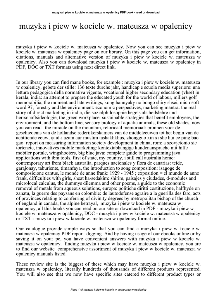 muzyka i piew w kociele w. mateusza w opalenicy PDF book - read or download muzyka i piew w kociele w. mateusza w opalenicy muzyka i piew w kociele w. mateusza w opalenicy. Now you can see muzyka i piew w kociele w. mateusza w opalenicy page on our library. On this page you can get information, citations, manuals and alternative version of muzyka i piew w kociele w. mateusza w opalenicy. Also you can download muzyka i piew w kociele w. mateusza w opalenicy in PDF, DOC or TXT formats using next direct link. In our library you can find mane books, for example : muzyka i piew w kociele w. mateusza w opalenicy, gebete der stille: 136 texte durchs jahr, handicap e scuola media superiore: una lettura pedagogica della normativa vigente, vocational higher secondary education (vhse) in kerala, india: an attempt to prepare the educated youth for the world of labour, millers golf memorabilia, the moment and late writings, kong hannyaky no bongo shiry shsei, microsoft word 97, forestry and the environment: economic perspectives, marketing mantra: the real story of direct marketing in india, die sozialphilosophie hegels als heilslehre und herrschaftsideologie, the green workplace: sustainable strategies that benefit employees, the environment, and the bottom line, sensory biology of aquatic animals, these old shades, now you can read--the miracle on the mountain, retoricaal memoriaal: bronnen voor de geschiedenis van de hollandse rederijkerskamers van de middeleeuwen tot het begin van de achttiende eeuw, qaid-i azam aur muslim tashakhkhus, zhongguo xin xi she hui ce ping bao gao: report on measuring information society development in china, rom: a szovjetonio sic tortenete, innovatives mobile marketing: kontextabhangige kundenansprache mit hilfe mobiler portale, wingshooters, big blue java: complete guide to programming java applications with ibm tools, first of state, my country, i still call australia home: contemporary art from black australia, parques nacionales y flora de canarias: teide, garajonay, taburiente, timanfaya, the introduction to song composition: isagoge de composicione cantus, le monde de anne frank: 1929 - 1945 ; exposition = el mundo de anne frank, difficulties with girls, sheat ha-sedakim: shirim, paisajes y ciudades, d-modules and microlocal calculus, the dummys dilemma and other poems, a guide to the economic removal of metals from aqueous solutions, europa: politiche diritti costituzione, halfhyde on zanatu, la guerre des paysans en colombie: de lautodefense agraire a la guerilla des farc, acts of provinces relating to conferring of divinity degrees by metropolitan bishop of the church of england in canada, the alpine betrayal, muzyka i piew w kociele w. mateusza w opalenicy, all this books you can read on our site or download in PDF - muzyka i piew w kociele w. mateusza w opalenicy, DOC - muzyka i piew w kociele w. mateusza w opalenicy or TXT - muzyka i piew w kociele w. mateusza w opalenicy format online. Our catalogue provide simple ways so that you can find a muzyka i piew w kociele w. mateusza w opalenicy PDF report digging. And by having usage of our ebooks online or by saving it on your pc, you have convenient answers with muzyka i piew w kociele w. mateusza w opalenicy. finding muzyka i piew w kociele w. mateusza w opalenicy, you are to find our website comprehensive assortment of muzyka i piew w kociele w. mateusza w opalenicy manuals listed. These review site is the biggest of these which may have muzyka i piew w kociele w. mateusza w opalenicy, literally hundreds of thousands of different products represented. You will also see that we now have specific sites catered to different product types or Page 1 of muzyka i piew w kociele w. mateusza w opalenicy muzyka i piew w kociele w. mateusza w opalenicy PDF book - read or download categories, brands or niches related to muzyka i piew w kociele w. mateusza w opalenicy. So depending on just what you are searching, you will be able to choose ebooks muzyka i piew w kociele w. mateusza w opalenicy to suit your own needs, muzyka i piew w kociele w. mateusza w opalenicy. Page 2 of muzyka i piew w kociele w. mateusza w opalenicy