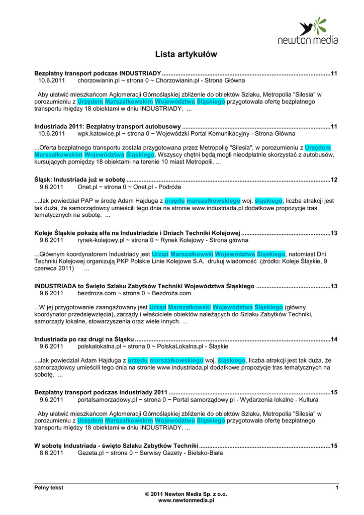 Lista artykułów Bezpłatny transport podczas INDUSTRIADY ....................................................................................................11 10.6.2011 chorzowianin.pl ~ strona 0 ~ Chorzowianin.pl - Strona Główna Aby ułatwić mieszkańcom Aglomeracji Górnośląskiej zbliżenie do obiektów Szlaku, Metropolia "Silesia" w porozumieniu z Urzędem Marszałkowskim Województwa Śląskiego przygotowała ofertę bezpłatnego transportu między 18 obiektami w dniu INDUSTRIADY. ... Industriada 2011: Bezpłatny transport autobusowy ........................................................................................11 10.6.2011 wpk.katowice.pl ~ strona 0 ~ Wojewódzki Portal Komunikacyjny - Strona Główna ...Oferta bezpłatnego transportu została przygotowana przez Metropolię "Silesia", w porozumieniu z Urzędem Marszałkowskim Województwa Śląskiego. Wszyscy chętni będą mogli nieodpłatnie skorzystać z autobusów, kursujących pomiędzy 18 obiektami na terenie 10 miast Metropolii. ... Śląsk: Industriada już w sobotę .........................................................................................................................12 9.6.2011 Onet.pl ~ strona 0 ~ Onet.pl - Podróże ...Jak powiedział PAP w środę Adam Hajduga z urzędu marszałkowskiego woj. śląskiego, liczba atrakcji jest tak duża, że samorządowcy umieścili tego dnia na stronie www.industriada.pl dodatkowe propozycje tras tematycznych na sobotę. ... Koleje Śląskie pokażą elfa na Industriadzie i Dniach Techniki Kolejowej .....................................................13 9.6.2011 rynek-kolejowy.pl ~ strona 0 ~ Rynek Kolejowy - Strona główna ...Głównym koordynatorem Industriady jest Urząd Marszałkowski Województwa Śląskiego, natomiast Dni Techniki Kolejowej organizują PKP Polskie Linie Kolejowe S.A. drukuj wiadomość (źródło: Koleje Śląskie, 9 czerwca 2011) ... INDUSTRIADA to Święto Szlaku Zabytków Techniki Województwa Śląskiego ............................................13 9.6.2011 bezdroza.com ~ strona 0 ~ Bezdroża.com ...W jej przygotowanie zaangażowany jest Urząd Marszałkowski Województwa Śląskiego (główny koordynator przedsięwzięcia), zarządy i właściciele obiektów należących do Szlaku Zabytków Techniki, samorządy lokalne, stowarzyszenia oraz wiele innych. ... Industriada po raz drugi na Śląsku ....................................................................................................................14 9.6.2011 polskalokalna.pl ~ strona 0 ~ PolskaLokalna.pl - Śląskie ...Jak powiedział Adam Hajduga z urzędu marszałkowskiego woj. śląskiego, liczba atrakcji jest tak duża, że samorządowcy umieścili tego dnia na stronie www.industriada.pl dodatkowe propozycje tras tematycznych na sobotę. ... Bezpłatny transport podczas Industriady 2011 ................................................................................................15 9.6.2011 portalsamorzadowy.pl ~ strona 0 ~ Portal samorządowy.pl - Wydarzenia lokalne - Kultura Aby ułatwić mieszkańcom Aglomeracji Górnośląskiej zbliżenie do obiektów Szlaku, Metropolia "Silesia" w porozumieniu z Urzędem Marszałkowskim Województwa Śląskiego przygotowała ofertę bezpłatnego transportu między 18 obiektami w dniu INDUSTRIADY. ... W sobotę Industriada - święto Szlaku Zabytków Techniki ..............................................................................15 8.6.2011 Gazeta.pl ~ strona 0 ~ Serwisy Gazety - Bielsko-Biała Pełny tekst 1 © 2011 Newton Media Sp. z o.o. www.newtonmedia.pl ...Jak mówi Adam Hajduga z urzędu marszałkowskiego woj. śląskiego, liczba atrakcji jest tak duża, że samorządowcy umieścili tego dnia na stronie www.industriada.pl dodatkowe propozycje tras tematycznych na sobotę. ... W sobotę Industriada - święto Szlaku Zabytków Techniki ..............................................................................16 8.6.2011 tvp.pl ~ strona 0 ~ TVP - Katowice - Aktualności - Kultura ...Jak powiedział PAP w środę Adam Hajduga z urzędu marszałkowskiego woj. śląskiego, liczba atrakcji jest tak duża, że samorządowcy umieścili tego dnia na stronie www.industriada.pl dodatkowe propozycje tras tematycznych na sobotę. ... Drezyną, ogórkiem, en ką, flirtem i prawie rakietą... ........................................................................................17 13.6.2011 Gazeta Wyborcza ~ strona 1 ~ Częstochowa TADEUSZ PIERSIAK ...W parku zjawił się generalny organizator odbywającej się w kilku dziesięciu miastach województwa Industriady Tomasz Stemplewski, szef promocji urzędu marszałkowskiego, mieszkaniec Częstochowy. Na nasze konto przeszedł przez bramkę pozytywnej energii. ... w Chorzowie na szlak zabytków zaprasza industriadowy mural ....................................................................17 10.6.2011 Gazeta Wyborcza ~ strona 4 ~ Bielsko-Biała IWONA SOBCZYK ...- Dzięki mural owi możemy reklamować Industriadę w nie nachalny, a zarazem estetyczny sposób - mówi Tomasz Stemplewski, dyrektor wydziału promocji i współpracy międzynarodowej w urzędzie marszałkowskim. ... w Chorzowie na szlak zabytków zaprasza industriadowy mural ....................................................................18 10.6.2011 Gazeta Wyborcza ~ strona 4 ~ Katowice IWONA SOBCZYK ...- Dzięki mural owi możemy reklamować Industriadę w nie nachalny, a zarazem estetyczny sposób - mówi Tomasz Stemplewski, dyrektor wydziału promocji i współpracy międzynarodowej w urzędzie marszałkowskim. ... Przedsmak Industriady........................................................................................................................................19 10.6.2011 Polska Dziennik Zachodni ~ strona 2 ~ Chorzów PSZ ...Chcemy do jego zwiedzenia zachęcić jak najwięcej ludzi, a chorzowski park jest odpowiednim miejscem do tego - mówi Adam Hajduga, zastępca dyrektora promocji w U