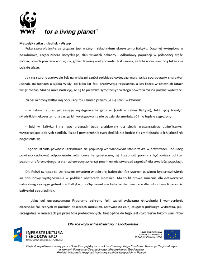 Metodyka atlasu siedlisk - Wstęp Foka szara Haliocherus gryphus jest ważnym składnikiem ekosystemu Bałtyku. Dawniej wytępiona w południowej części Morza Bałtyckiego, dziś wskutek ochrony i odbudowy populacji w północnej części morza, powoli powraca w miejsca, gdzie dawniej występowała. Jest szansa, że foki znów powrócą także i na polskie plaże. Jak na razie, obserwacje fok na większej części polskiego wybrzeża mają wciąż sporadyczny charakter. Jednak, na łachach u ujścia Wisły, od kilku lat foki przebywają regularnie, a ich liczba w ostatnich latach wciąż rośnie. Można mieć nadzieję, że są to pierwsze symptomy trwałego powrotu fok na polskie wybrzeże. Za cel ochrony bałtyckiej populacji fok szarych przyjmuje się stan, w którym: - w całym naturalnym zasięgu występowania gatunku (czyli w całym Bałtyku), foki będą trwałym składnikiem ekosystemu, a zasięg ich występowania nie będzie się zmniejszać i nie będzie zagrożony; - foki w Bałtyku i na jego brzegach będą znajdowały dla siebie wystarczająco dużo/licznych wystarczająco dobrych siedlisk, liczba i powierzchnia tych siedlisk nie będzie się zmniejszała, a ich jakość nie pogarszała się; - będzie istniała pewność utrzymania się populacji we właściwym stanie także w przyszłości. Populację powinno cechować odpowiednie zróżnicowanie genetyczne, jej liczebność powinna być wyższa od tzw. poziomu referencyjnego, a stan zdrowotny zwierząt powinien nie stwarzać zagrożeń dla trwałości populacji. Dla Polski oznacza to, że naszym wkładem w ochronę bałtyckich fok szarych powinno być umożliwienie im odbudowy występowania w polskich obszarach morskich. Ma to kluczowe znacznie dla odtworzenia naturalnego zasięgu gatunku w Bałtyku, choćby nawet nie było bardzo znaczące dla odbudowy liczebności bałtyckiej populacji fok. Jako cel opracowanego Programu ochrony foki szarej wskazano utrwalenie i wzmocnienie obecności fok szarych w polskich obszarach morskich, zarówno na całej długości polskiego wybrzeża, jak i szczególnie w miejscach już przez foki preferowanych. Niezbędne do tego jest stworzenie fokom warunków Dla rozwoju infrastruktury i środowiska Projekt współfinansowany przez Unię Europejską ze środków Europejskiego Funduszu Rozwoju Regionalnego w ramach Programu Operacyjnego Infrastruktura i Środowisko Projekt: Wsparcie restytucji i ochrony ssaków bałtyckich w Polsce do osiągnięcia naturalnego zasięgu występowania w rejonie południowego Bałtyku przez zapewnienie im dostępu do dogodnych dla realizacji funkcji życiowych siedlisk lądowych w polskiej strefie Bałtyku. Foka szara jest gatunkiem wymagającym do realizacji swoich funkcji życiowych – rozmnażania się, linienia, czy okresowego odpoczynku – siedlisk lądowych: plaż i wybrzeży. Według naszej wiedzy, muszą być to siedliska o odpowiedniej jakości, na którą składają się różne czynniki – zarówno naturalne (podłoże, tym brzegu), jak i antropogeniczne (penetracja ludzka, prawdopodobieństwo płoszenia). Czy foki, powracając do południowego Bałtyku, znajdą tu jeszcze dogodne dla siebie siedliska? Czy możemy jeszcze zachować i ochronić przed przekształceniami najbardziej dogodne dla nich siedliska, by były gotowe na przyjęcie fok? Na te pytania próbuje odpowiedzieć niniejsze opracowanie. Jest to pierwsza w Polsce próba predyktywnego modelowania jakości lądowego siedliska fok szarych na wybranych odcinkach polskiego wybrzeża. Oparta jest na wiedzy o biologii, ekologii i zachowaniach fok oraz informacji literaturowych i niepublikowanych o preferencjach środowiskowych foki szarej w różnych miejscach wokół Bałtyku. Model ten zostanie oczywiście zweryfikowany przez same foki i ich wybory siedliskowe, jakich dokonają w przyszłości. Ze względu na wciąż okazjonalne, jak dotąd, pojawianie się fok na polskich wybrzeżach, na tę weryfikację musimy jeszcze poczekać. Przeprowadzona próba oceny jakości siedliska fok charakter pilotażu. Została dokonana w czterech obszarach, które na podstawie ogólnej wiedzy wydają się najbardziej dla fok przydatne – albo będąc obszarami chronionymi (parki narodowe), albo będąc już obecnie miejscami liczniejszego skupiania się obserwacji fok (Zatoka Pucka, rejon Ujścia Wisły). W tych 4 obszarach opracowano ocenę dla 6 obiektów przestrzennych (W Zatoce Puckiej osobno wyodrębniono Rybitwią Mieliznę, w rejonie Ujścia Wisły – osobno analizowano plaże, a osobno śródmorskie łachy). W przyszłości możliwe i potrzebne byłoby ocenienie tą samą metodą całej długości polskiego wybrzeża. Analizowane czynniki środowiska, istotne dla oceny jakości siedliska, a także ich wagi, przyjęto na podstawie oceny eksperckiej. Szczegóły przyjętej metodyki przedstawiono dalej. Wyniki analiz pokazują, że we wszystkich rozważanych obszarach wciąż zachowały się siedliska dobrej lub bardzo dobrej jakości, przynajmniej z punktu widzenia naszej aktualnej wiedzy o potrzebach ekologicznych fok. Pokazują jednak także, jak wielką negatywna rolę z punktu widzenia siedlisk fok ma potężniejąca i narastająca na całym polskim wybrzeżu antropopresja, nie omijająca także obszarów chronionych. Postępująca urbanizacja i rozwój zabudowy na zapleczy wybrzeża, a także coraz większe zapotrzebowanie społeczne na rekreację nad morzem, uprawianie sportów wodnych itp., skutkuje wzrostem presji ludzkiej na plaże do takich natężeń, które mogą zablokować możliwość powrotu fok na polskie wybrzeże. 2|Strona Opracowane wieloczynnikowe oceny jakości siedlisk fok dają dobry obraz stanu aktualnego. Najcenniejsze jest w nich jednak, że dają także możliwość modelowania skutków zmiany poszczególnych czynników – za pomocą raz stworzonego modelu łatwo uzyskać odpowiedź na pytania: jak zmieni się struktura jakości potencjalnego siedliska dla fok w przypa